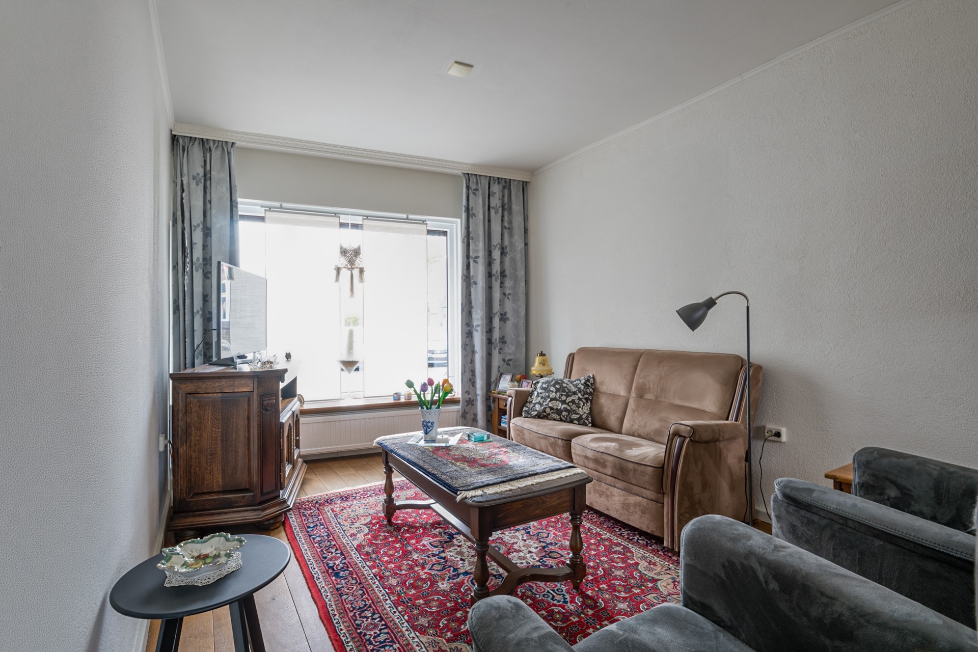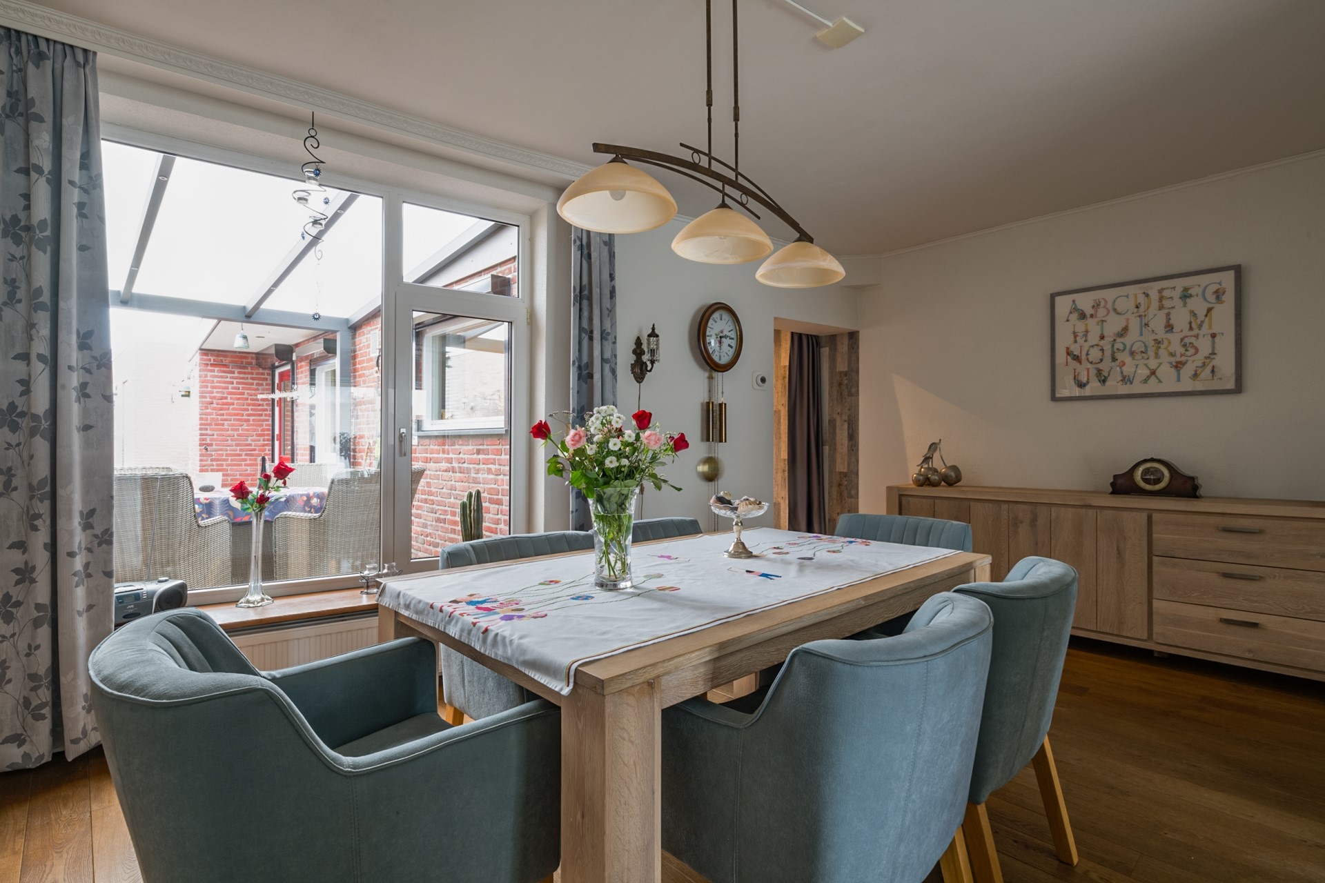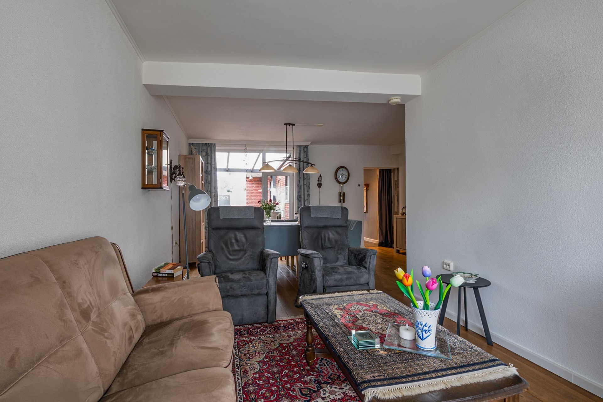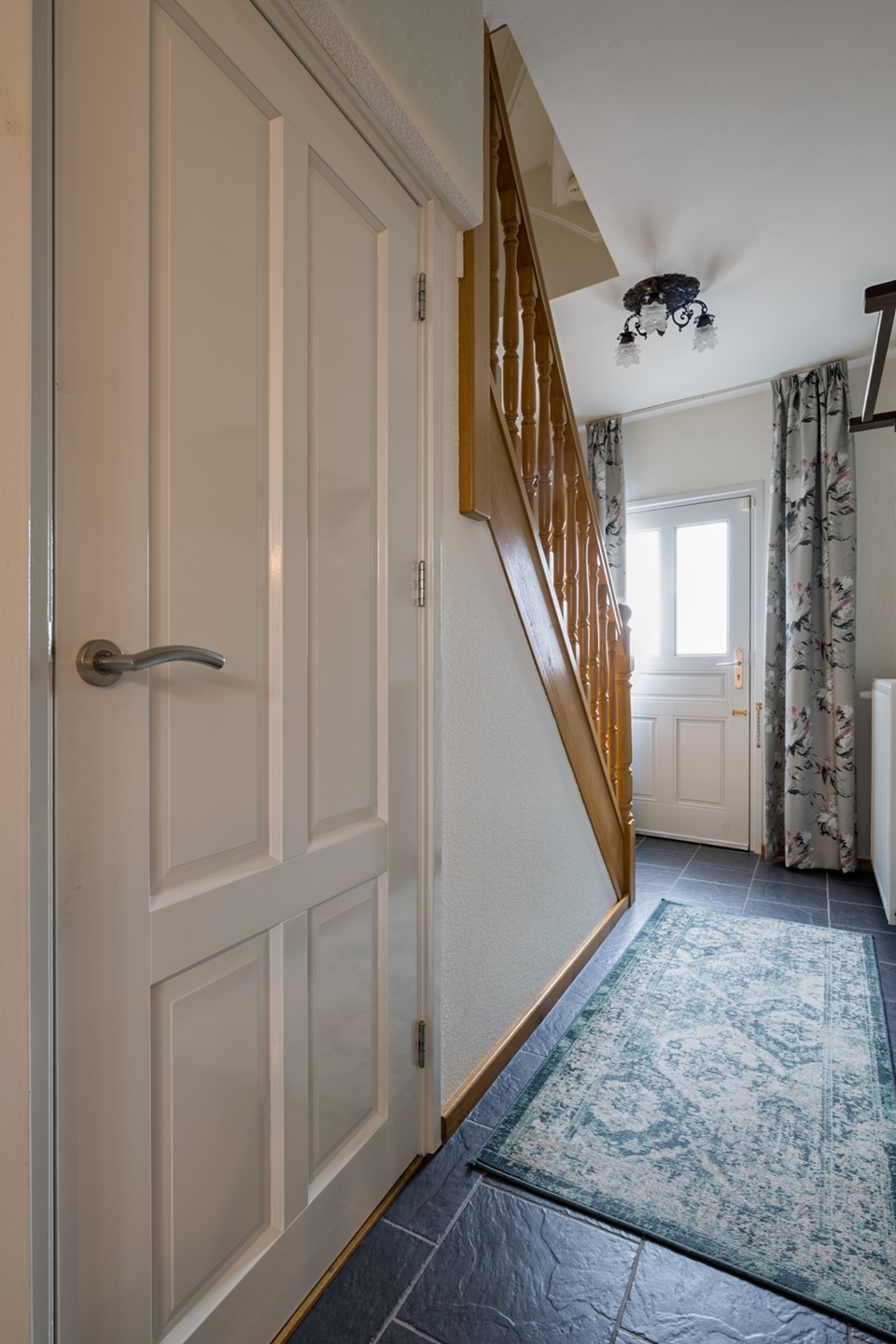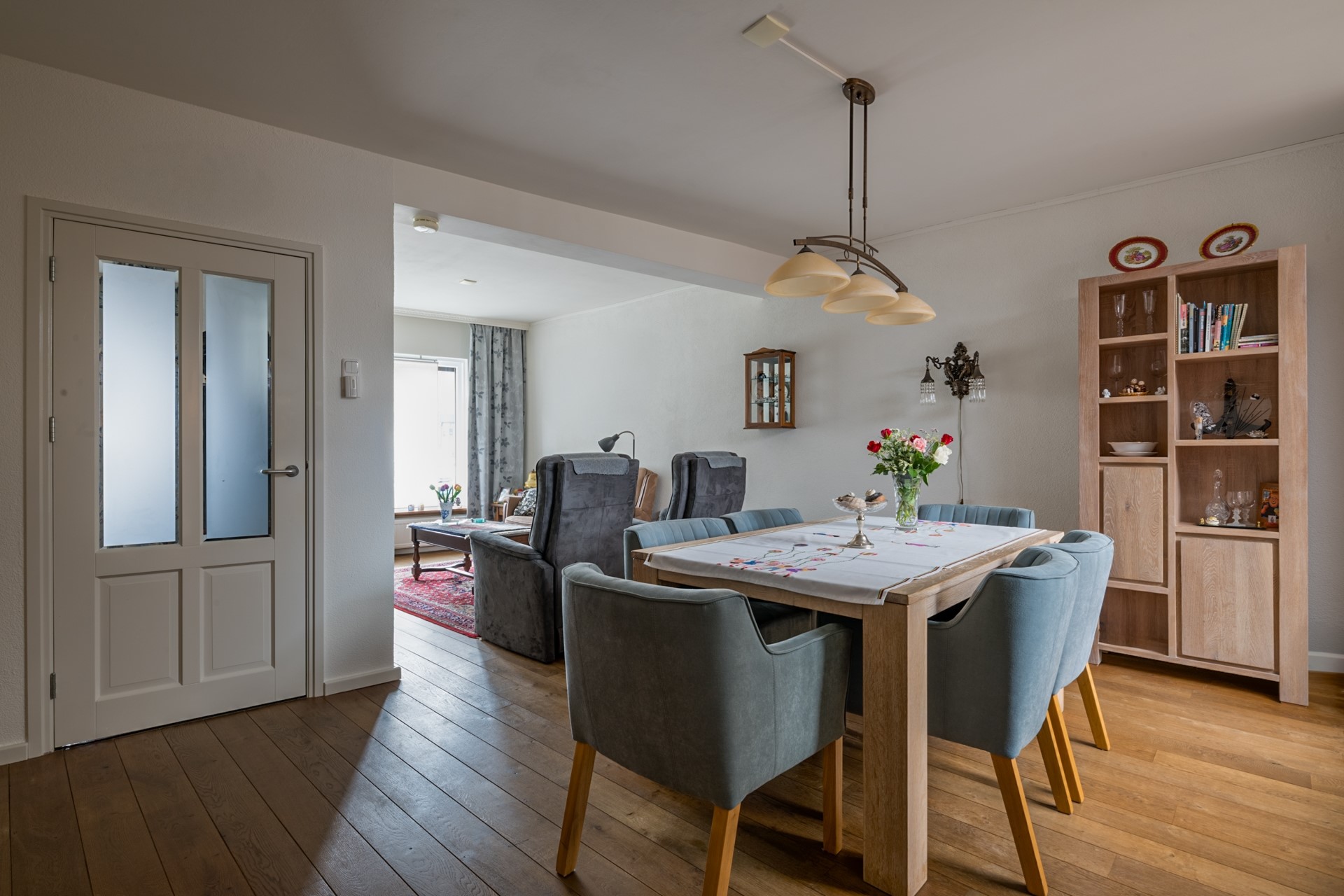 Bij binnenkomst betreedt u de ontvangsthal met een tegelvloer, garderoberuimte en toegang tot de praktische provisiekelder, ideaal voor het opslaan van voorraad en overige spullen. Vanuit de hal loopt u door naar de woonkamer, waar de parketvloer direct warmte en sfeer geeft. Dankzij de grote raampartijen aan voor- en achterzijde valt er prettig daglicht binnen. De rolluiken zorgen voor extra comfort en privacy. De woonkamer biedt voldoende ruimte voor een gezellige zithoek aan de voorzijde en een eethoek aan de achterzijde, in directe verbinding met de keuken.