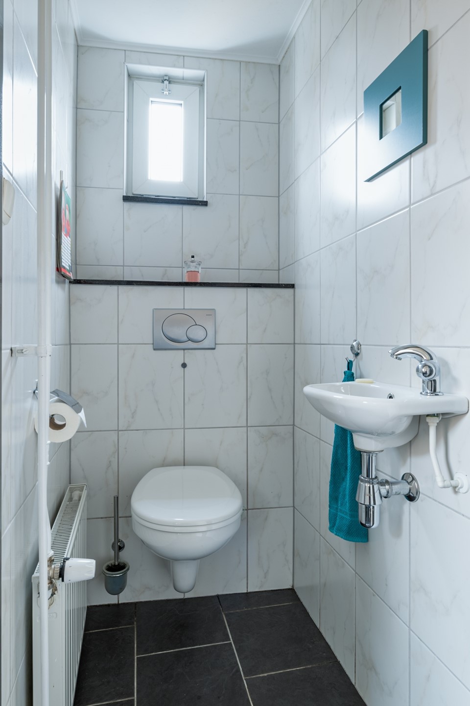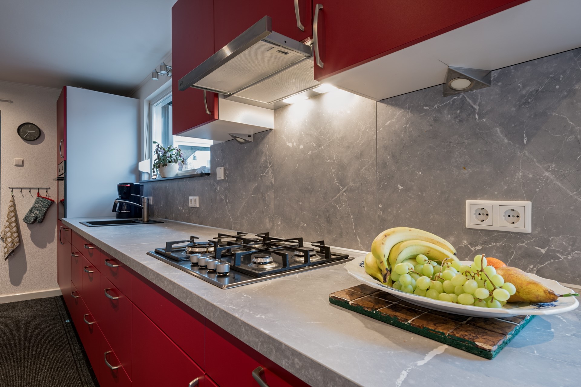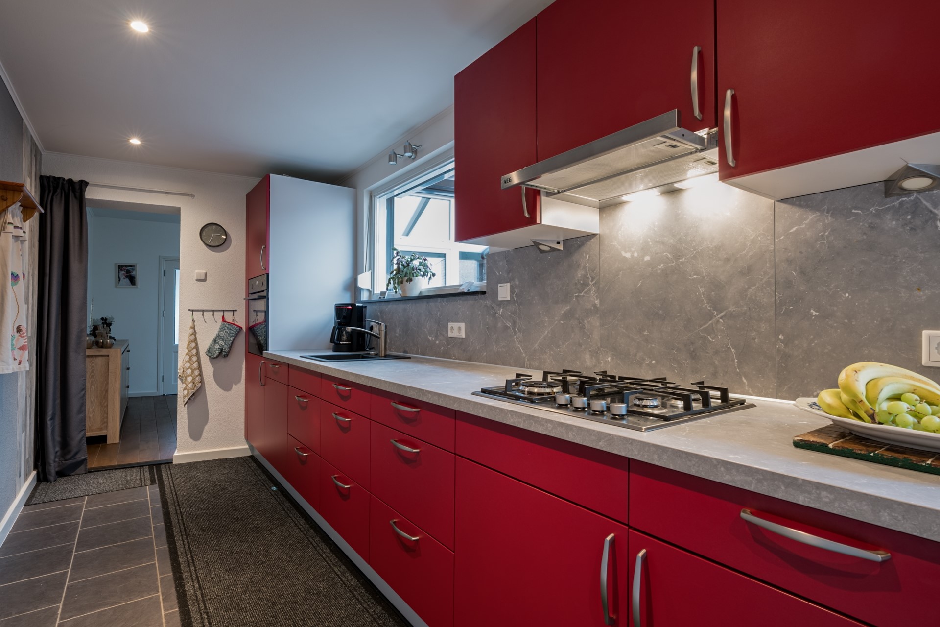 De halfopen keuken is in 2021 vernieuwd en uitgevoerd met een tegelvloer, een ruime kastindeling en voldoende werkruimte. De keuken is voorzien van AEG-inbouwapparatuur, waaronder een gasfornuis, afzuigkap, heteluchtoven en vaatwasser. Vanuit hier heeft u direct toegang tot het terras en de achtertuin. Aansluitend bevindt zich de bijkeuken met witgoedaansluitingen en het toilet, uitgevoerd met een zwevend closet en een fonteintje.