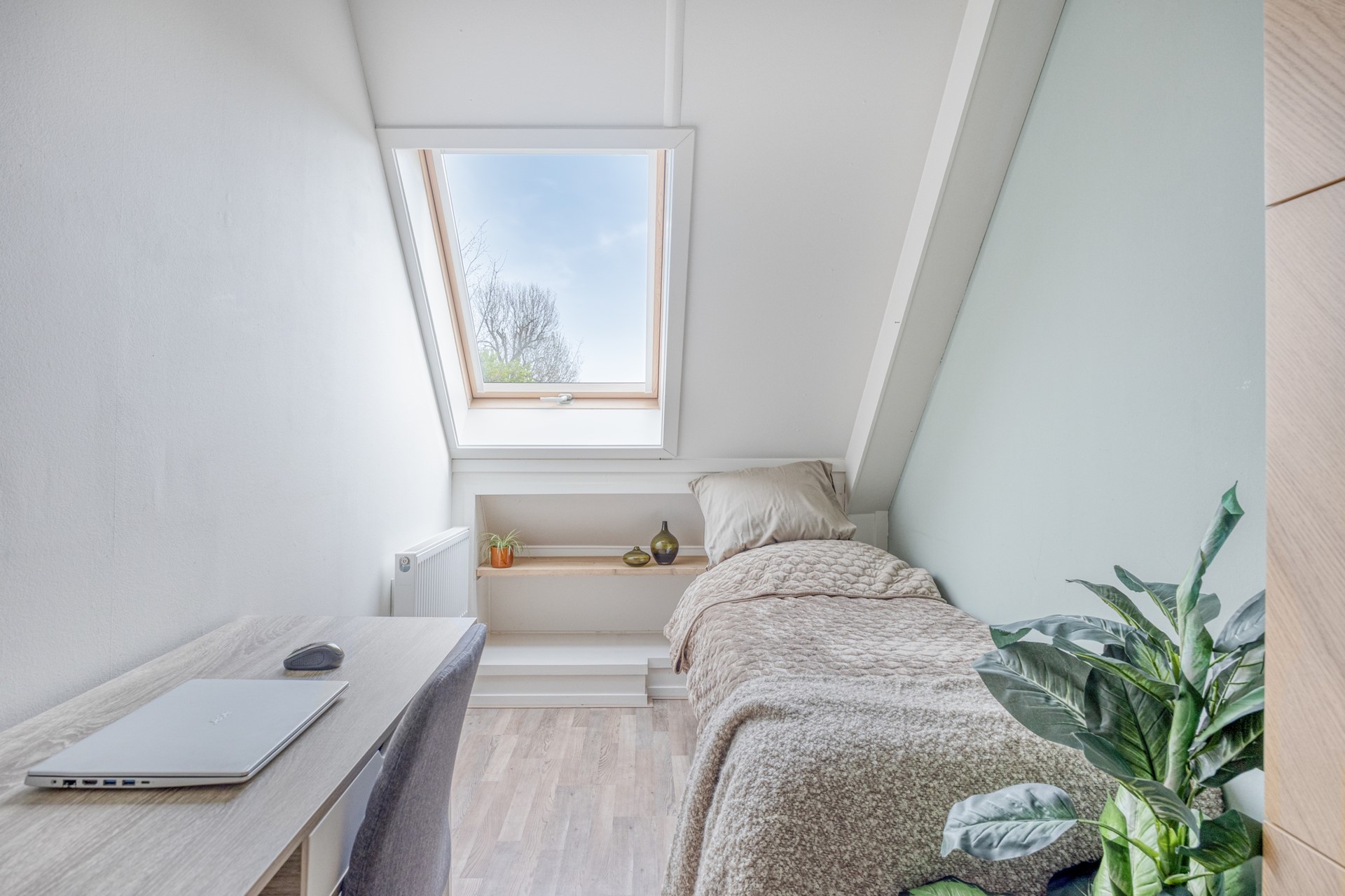 De tweede verdieping is via een vaste trap bereikbaar en is momenteel een open ruimte. Een fijne ruimte voor een werkplek, hobby of een extra slaapkamer. De wasmachine-aansluiting en ook de c.v. installatie zijn in deze ruimte aanwezig.
