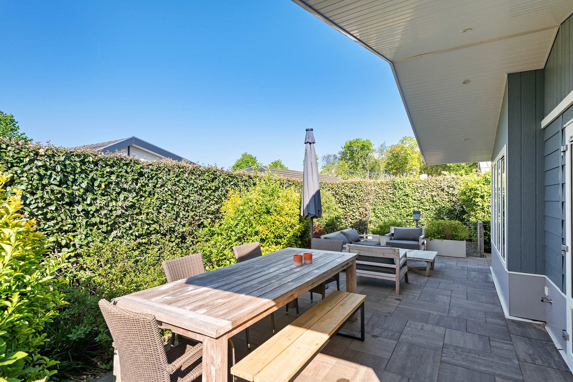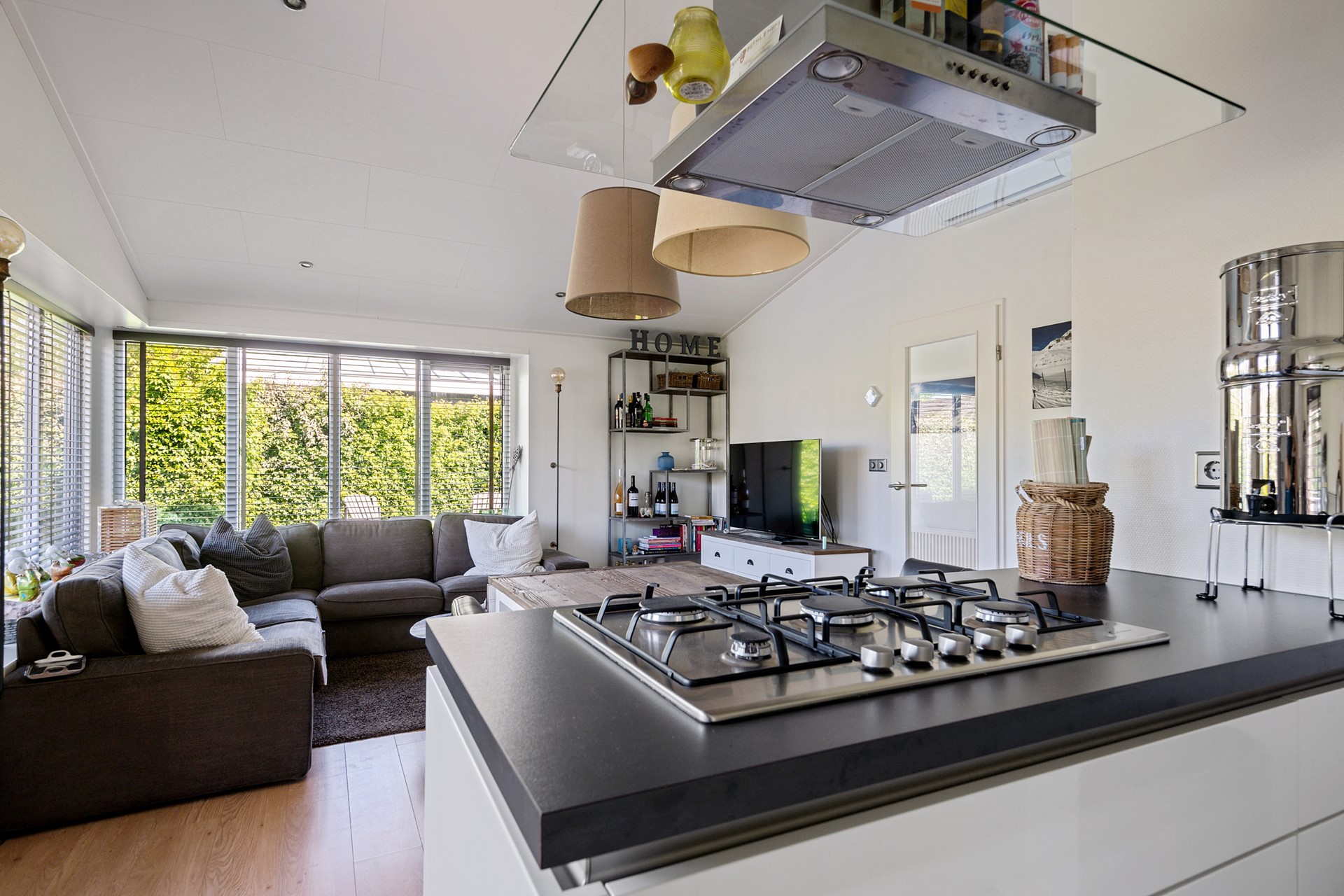 De lichte woonkamer is tuingericht en voorzien van royale raampartijen en een erker, wat zorgt voor veel natuurlijk licht. Via openslaande deuren bereikt u de verzorgde tuin met terras. De open keuken is modern uitgevoerd en voorzien van diverse inbouwapparatuur, waaronder een combimagnetron, koelkast, vaatwasser, gaskookplaat en afzuigkap. De woning is stijlvol afgewerkt en voorzien van ingebouwde sfeerverlichting.