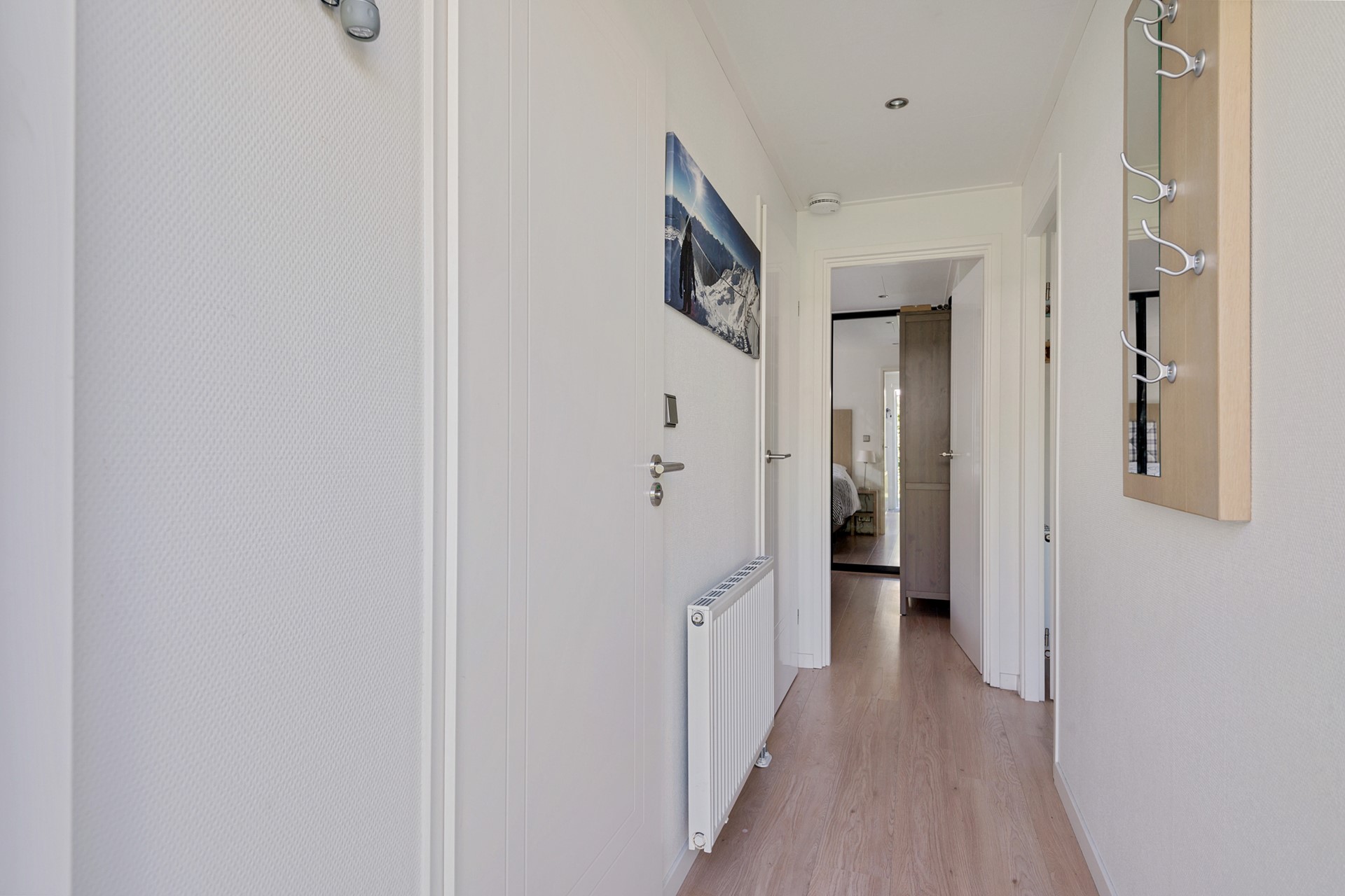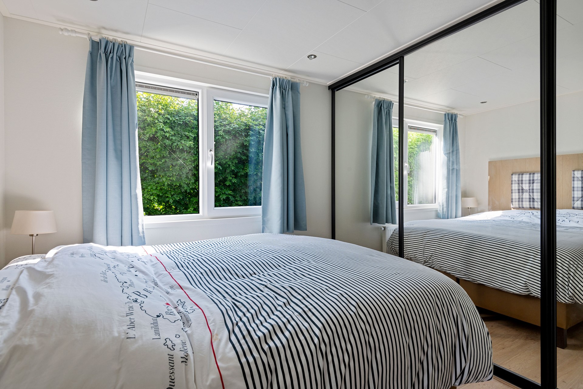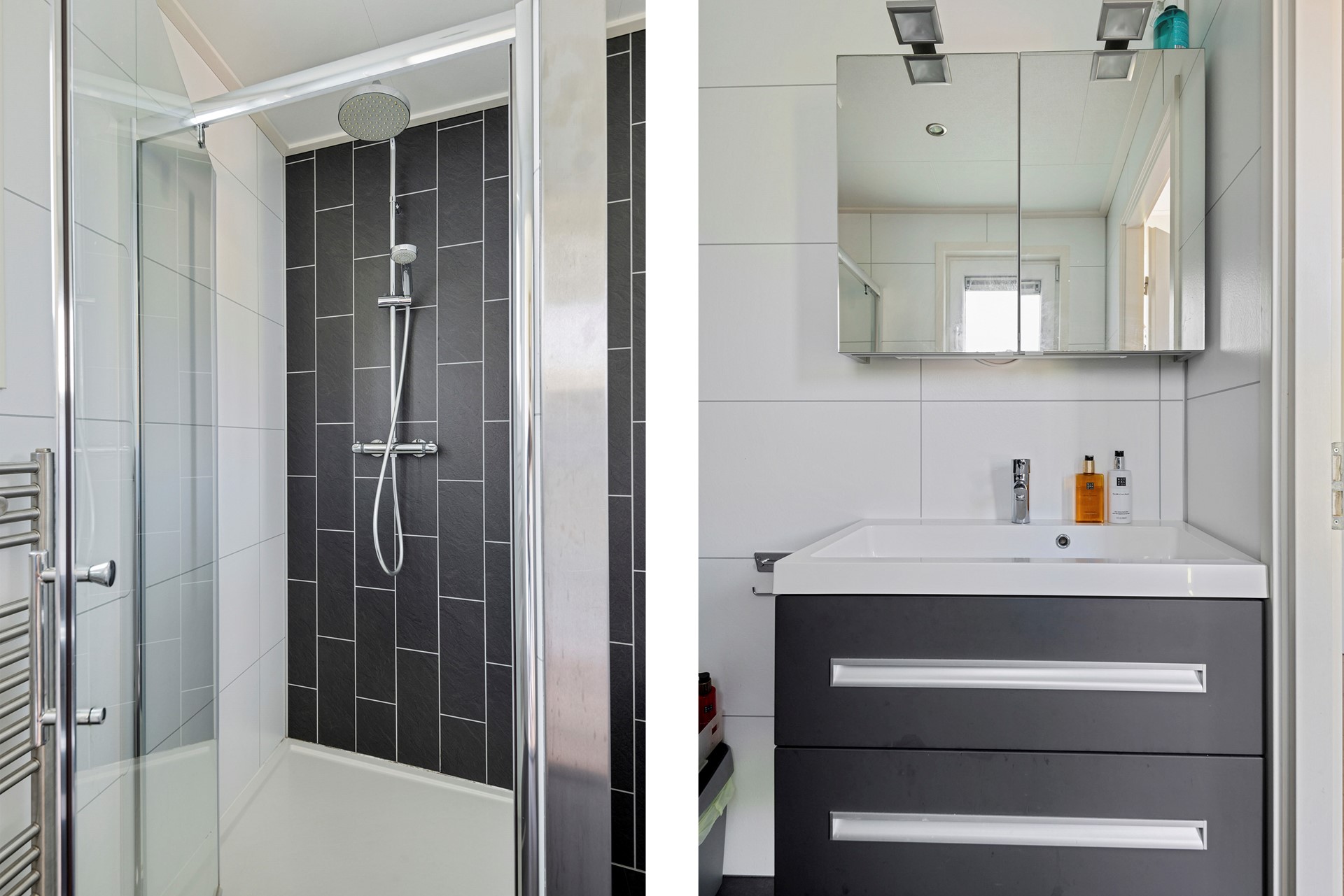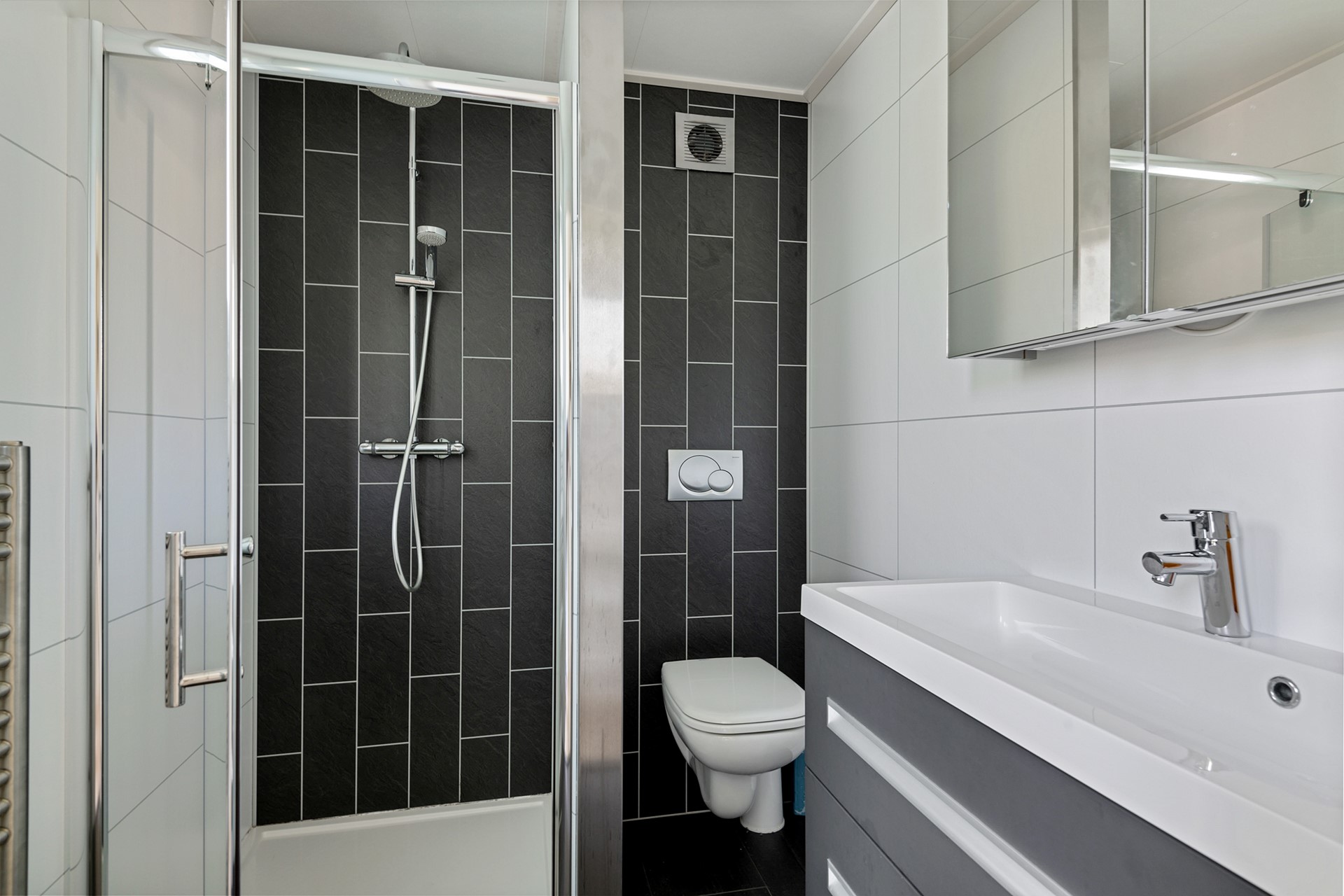 Entree/hal met toegang tot de modern betegelde badkamer, voorzien van een wandcloset, douchecabine, wastafelmeubel en spiegelkast. Inpandige berging met cv-opstelling, wasmachineaansluiting en een tweede entree vanaf buiten. Twee slaapkamers, waarvan de hoofdslaapkamer is voorzien van een royale kastenwand met spiegelschuifdeuren. De tweede slaapkamer is geschikt als kinder-, werk- of logeerkamer.
