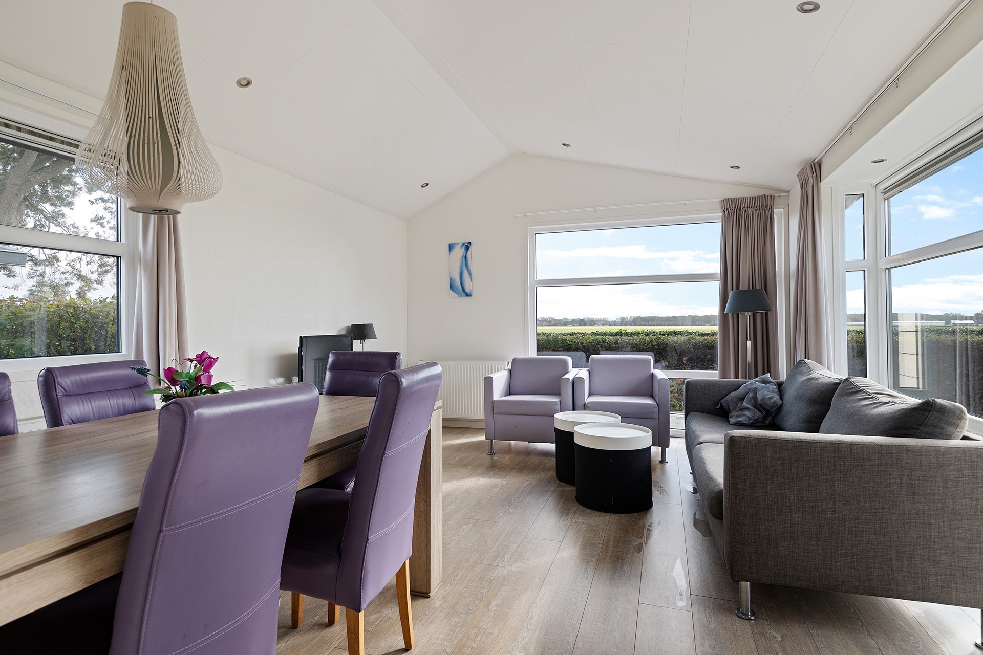 Ruime woonkamer met veel lichtinval en openslaande deuren naar het terras