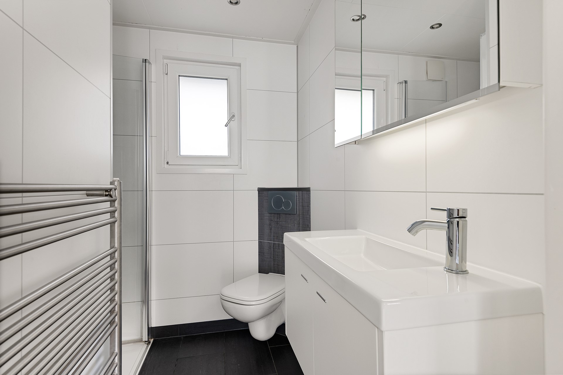 Badkamer met douche, toilet en wastafelmeubel