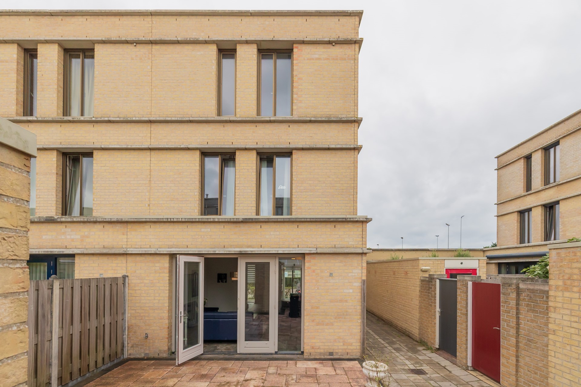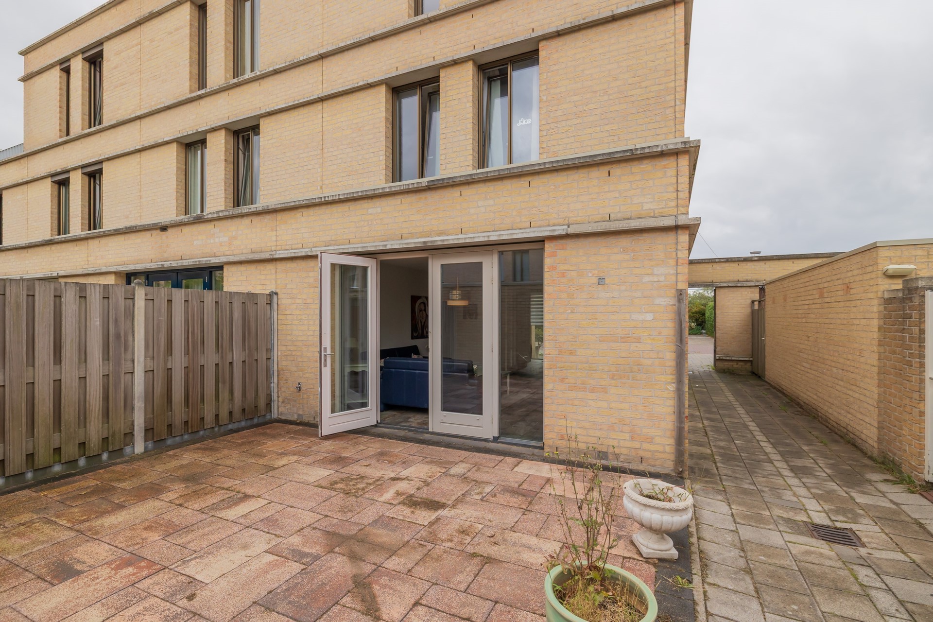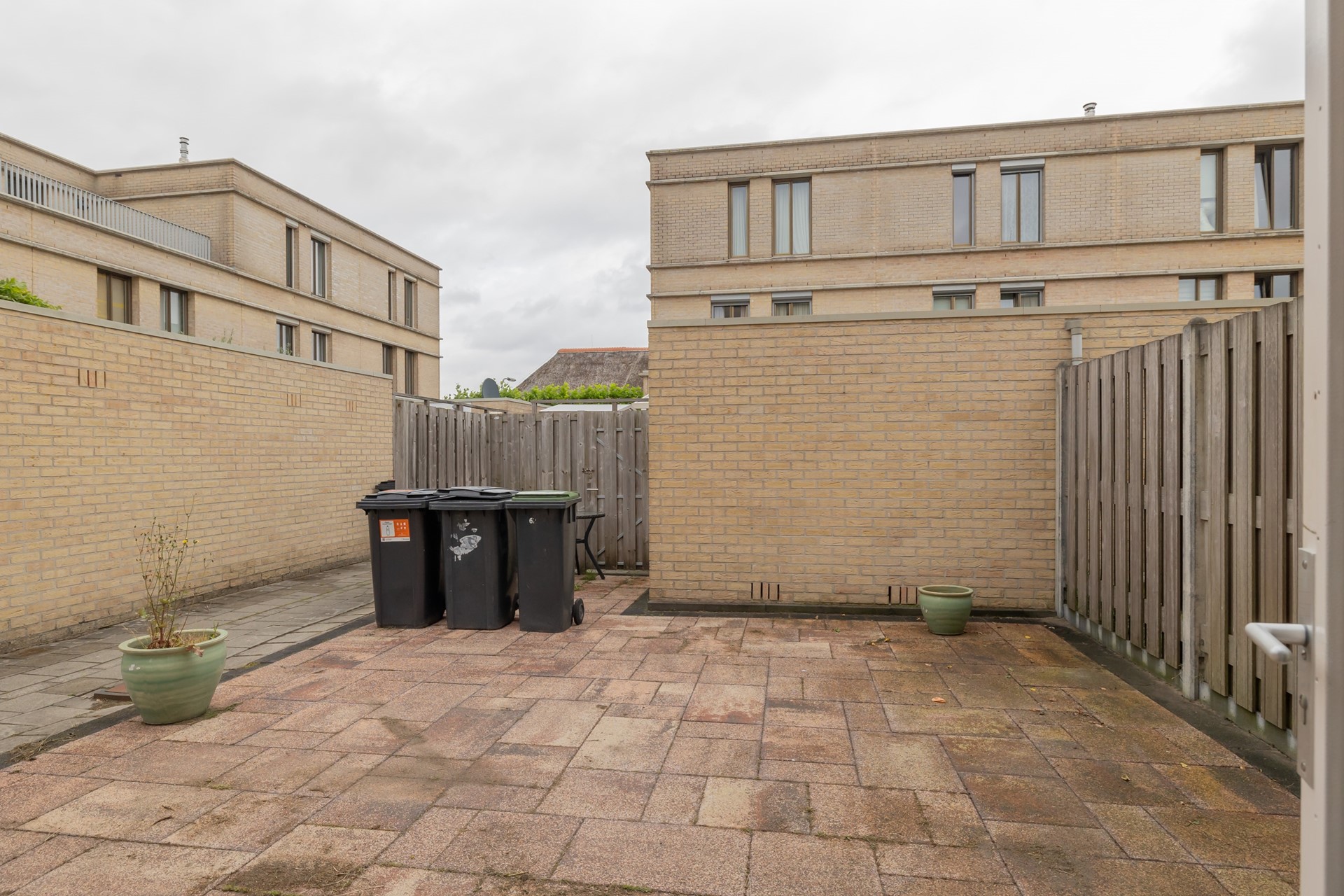 De onderhoudsvriendelijke achtertuin is volledig bestraat en voorzien van een praktische schuur voor fietsen en extra opslag.