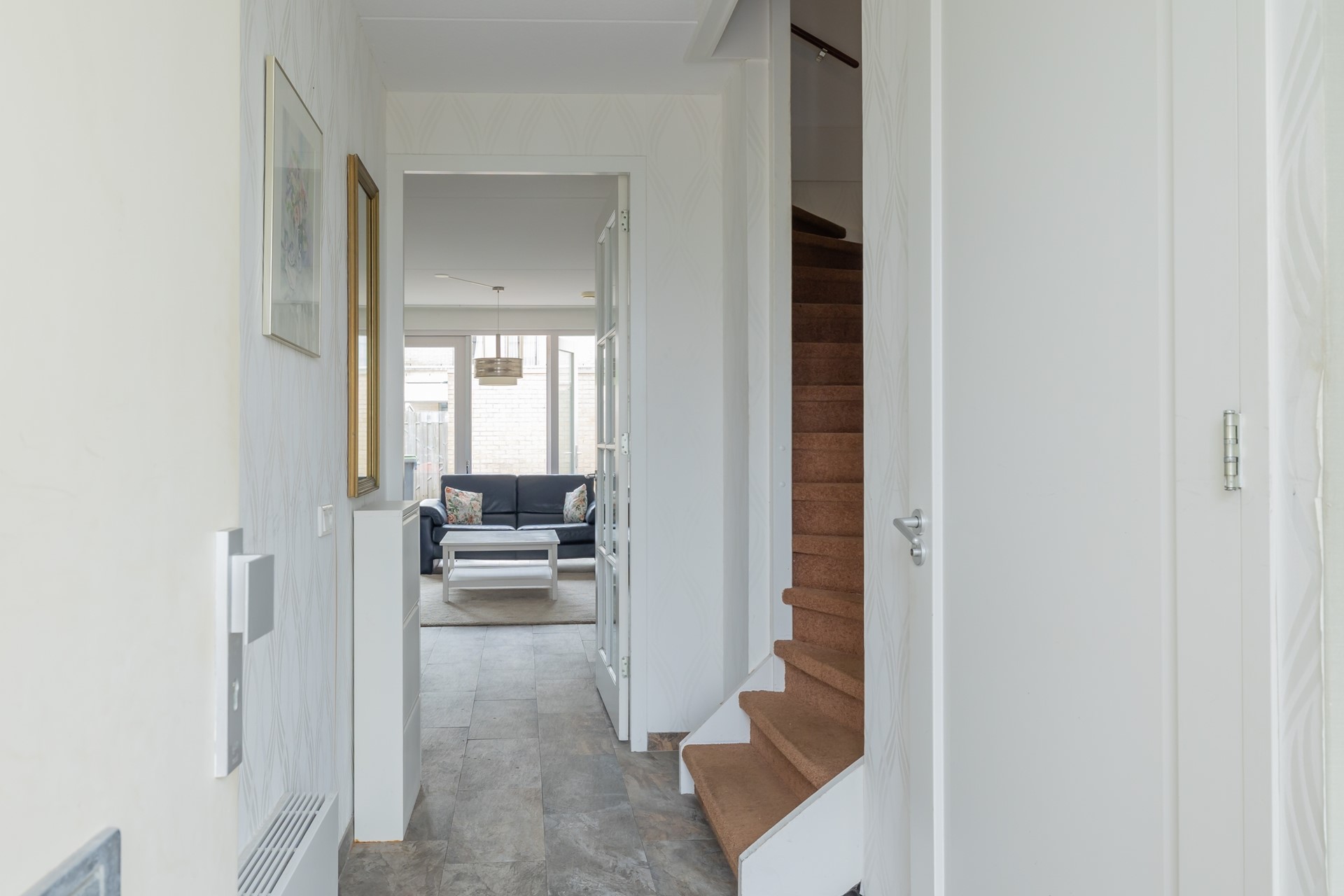Via de entree kom je in de ruime hal met garderobe, meterkast en modern toilet. De woonkamer met trapkast is licht en uitnodigend, met openslaande deuren naar de tuin. De open keuken aan de voorzijde is voorzien van een plafondhoog raam, waardoor er de hele dag prettig daglicht binnenvalt. De gehele begane grond is voorzien van vloerverwarming en plavuizen. Comfortabel én praktisch.