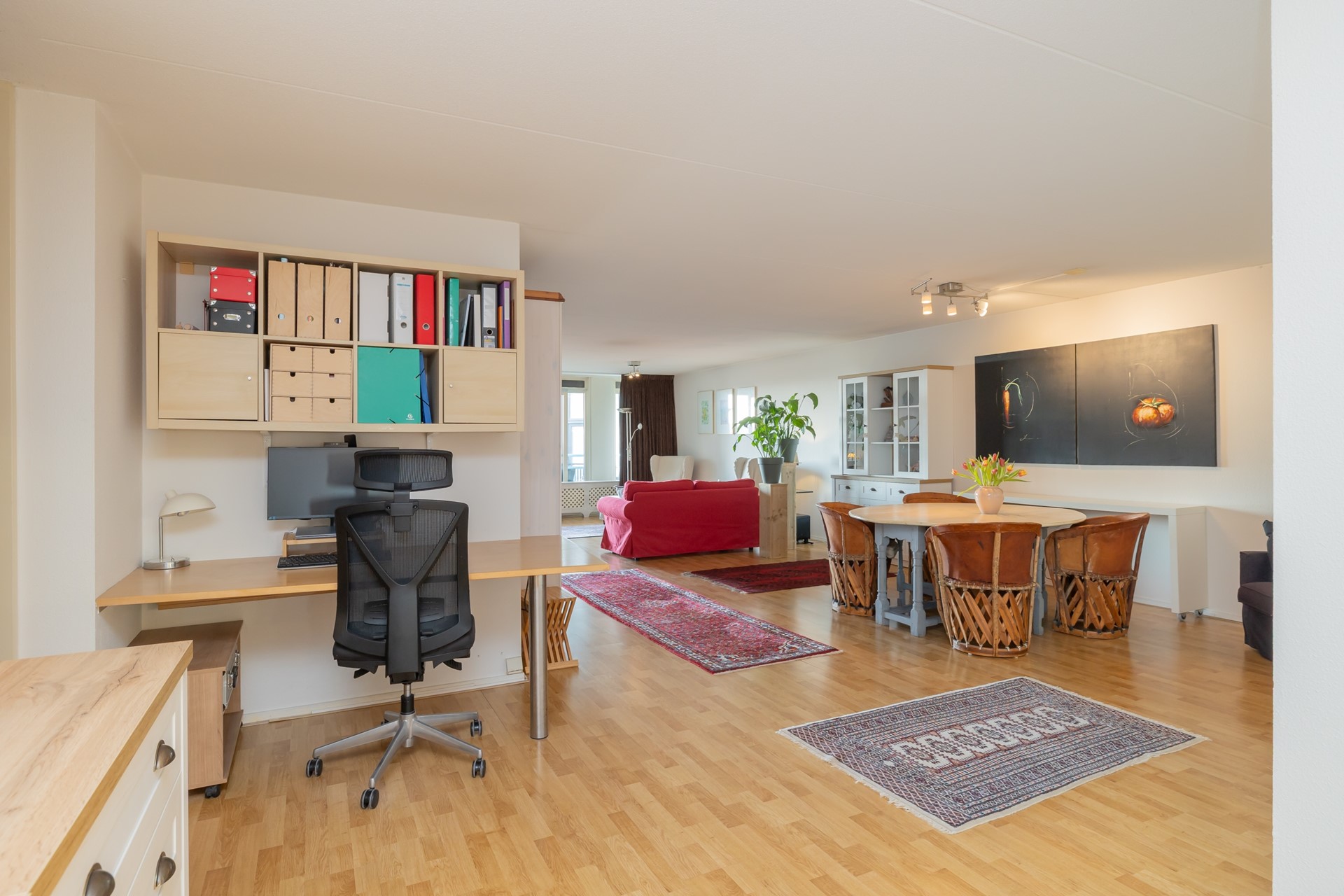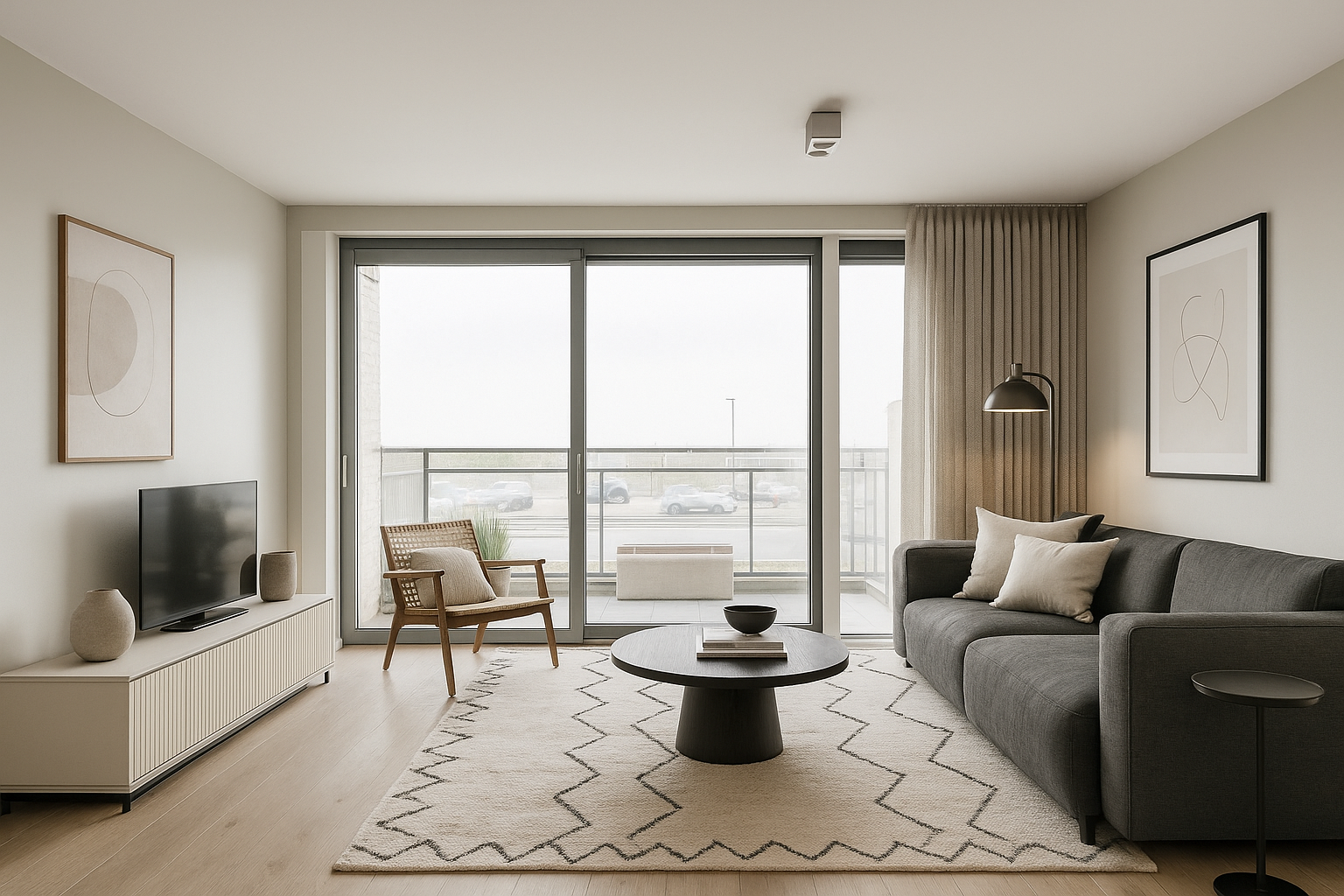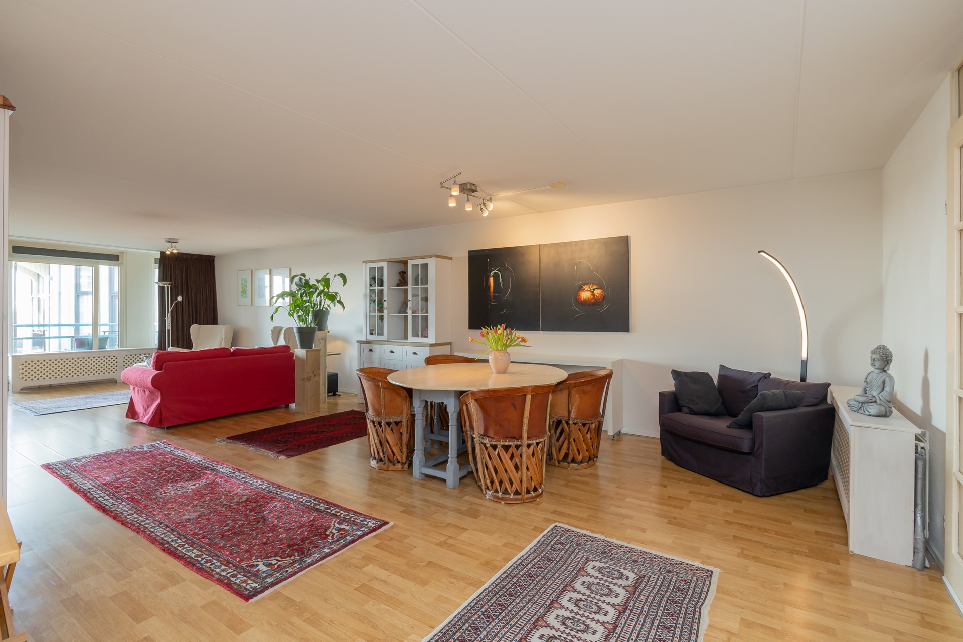 De royale woonkamer baadt in natuurlijk licht en biedt een fenomenaal uitzicht op de boulevard en de zee. De kamerbrede schuifpui verbindt het interieur moeiteloos met het ruime balkon, waar je in alle rust van de zonsondergang kunt genieten.