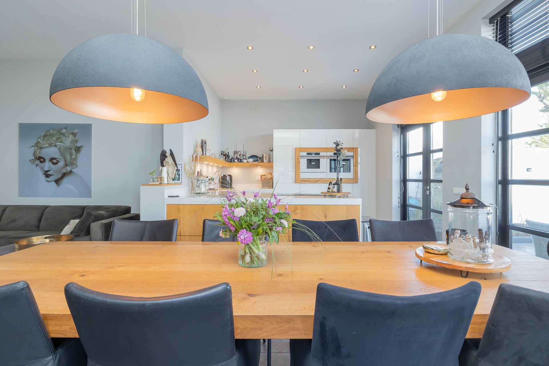 De keuken is van alle hedendaagse gemakken voorzien en uitgerust met uitgebreide Siemens inbouwapparatuur, waaronder twee koelkasten, een vaatwasser, een geïntegreerde koffiemachine, een warmhoudlade en een combinatie bakoven met magnetron. Daarnaast beschikt de keuken over een Novy inductiekookplaat met geïntegreerde afzuiging, een Quooker en een extra Grohe waterinstallatie voor gekoeld mineraalwater.