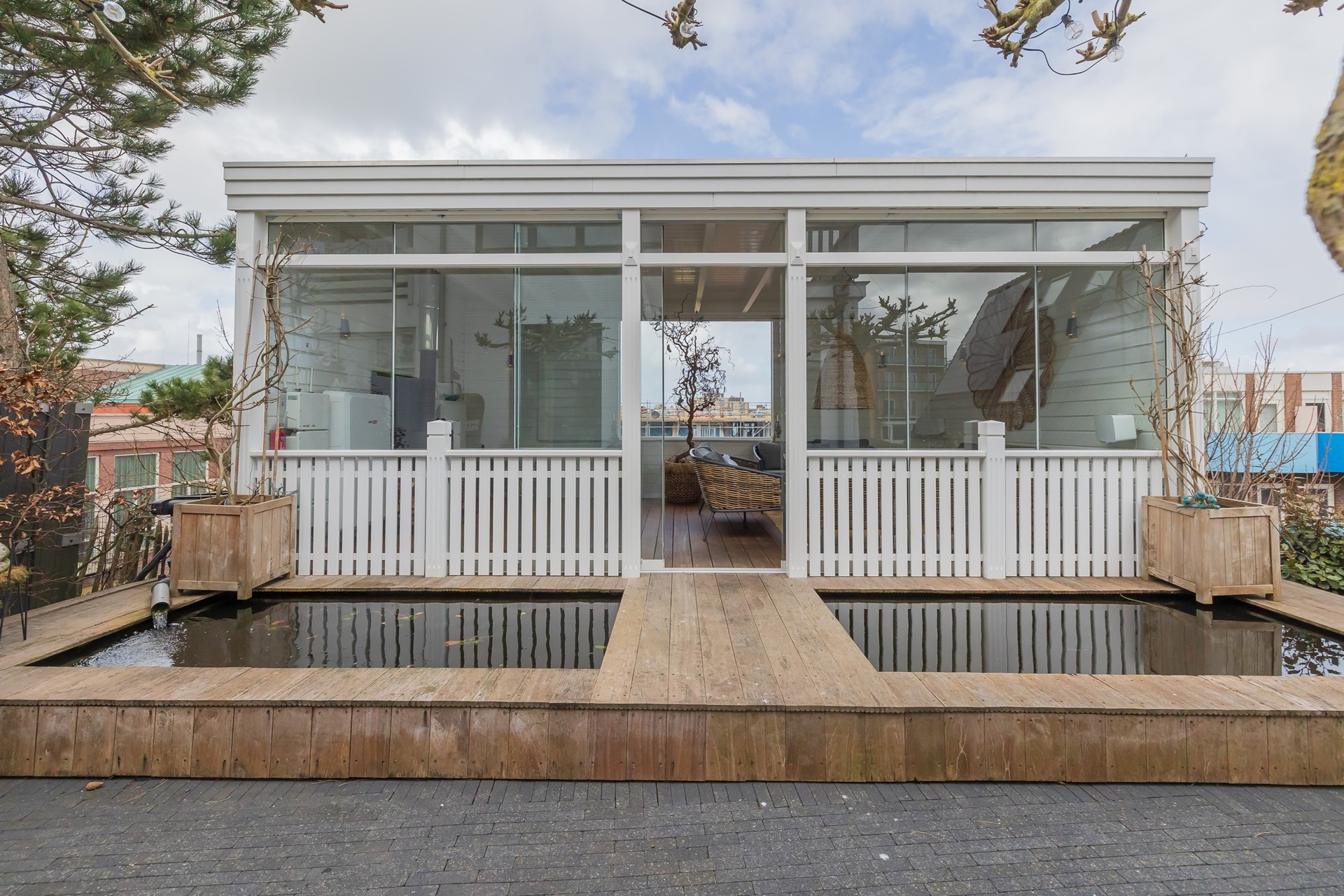 De woning beschikt over een voortuin met terras waar je door de ligging heerlijk kunt zitten. De achtertuin is diep en voorzien van een ruim terras en een fraaie veranda waar je beschut van het buitenleven kunt genieten.