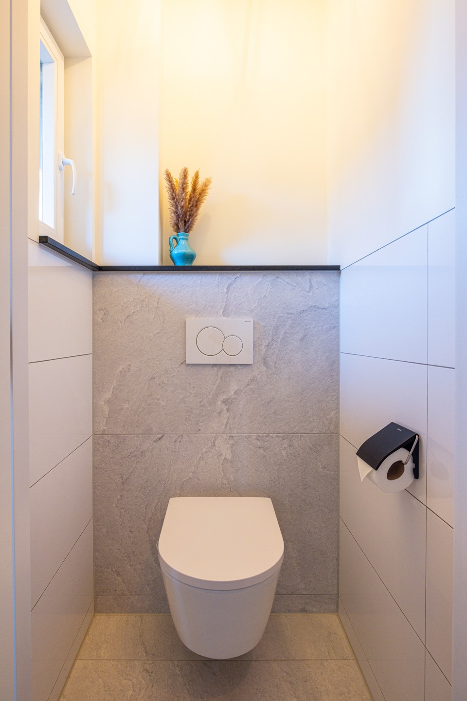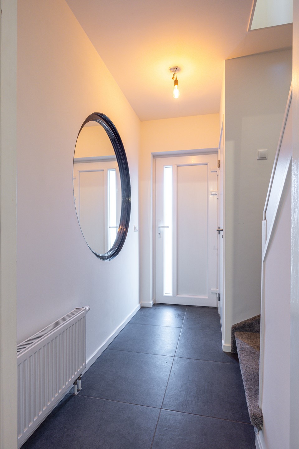 Via de entree betreed je de ontvangsthal, die is afgewerkt met een nette tegelvloer. In de hal bevindt zich het zwevend toilet. Vanuit de hal loop je door naar de woonkamer.