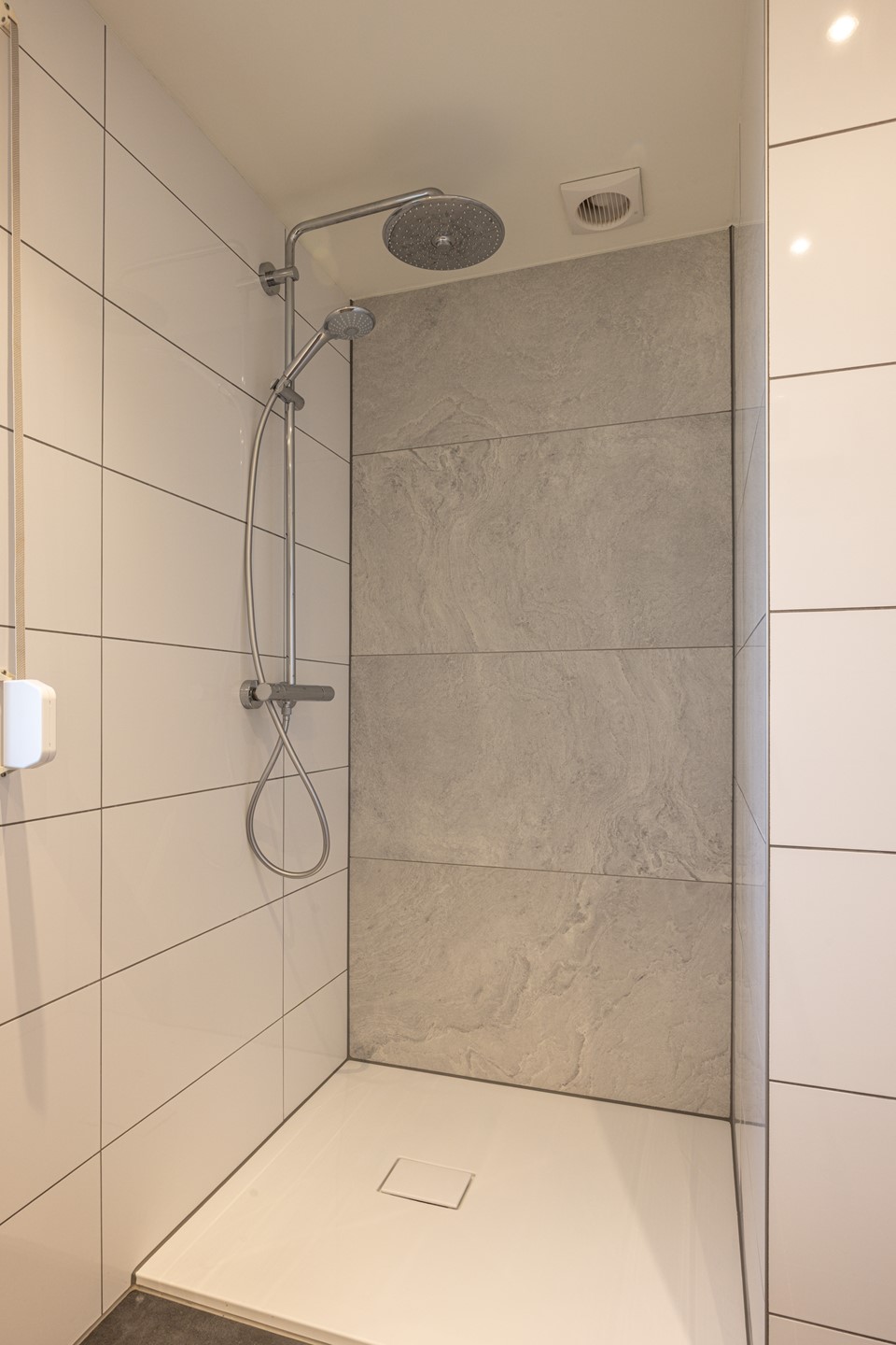 De badkamer is netjes en functioneel ingericht en afgewerkt met een tegelvloer. De ruimte beschikt over een hoogwaardige regendouche, een zwevend badkamermeubel met wasbak, een spiegel met verlichting en een design radiator. Een verzorgde en frisse ruimte die volledig is ingericht voor dagelijks gebruik.