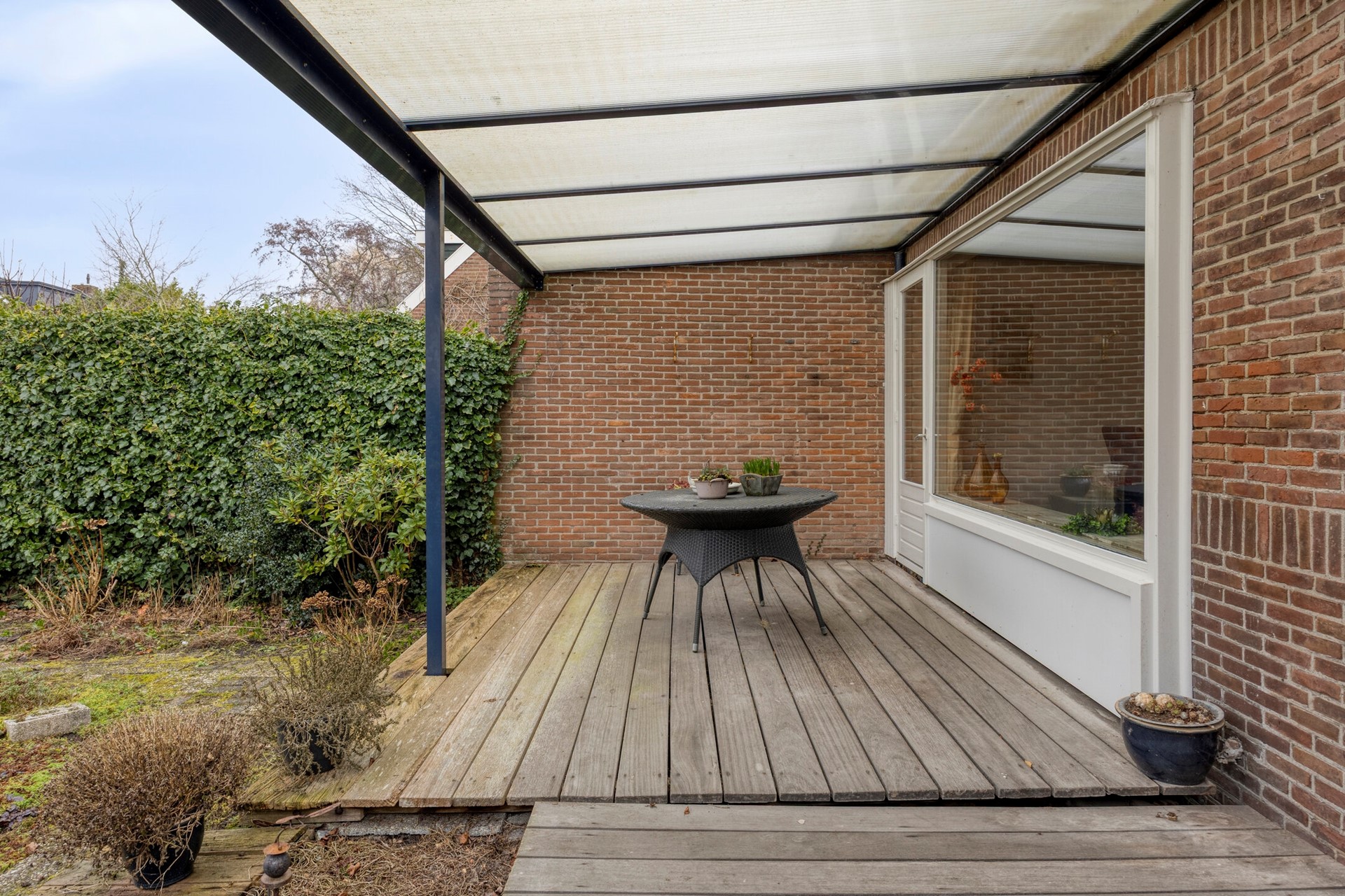 De ruime en verzorgde achtertuin vormt een heerlijke privéplek, met over de volledige breedte van de woning een overkapping waar u al vroeg in het seizoen buiten kunt zitten. Achter de garage bevindt zich nog een extra overkapping, ideaal voor het opbergen van tuinspullen. Met deze veelzijdige buitenruimte is er altijd een fijne plek om te ontspannen, te genieten en het buitenleven optimaal te ervaren.