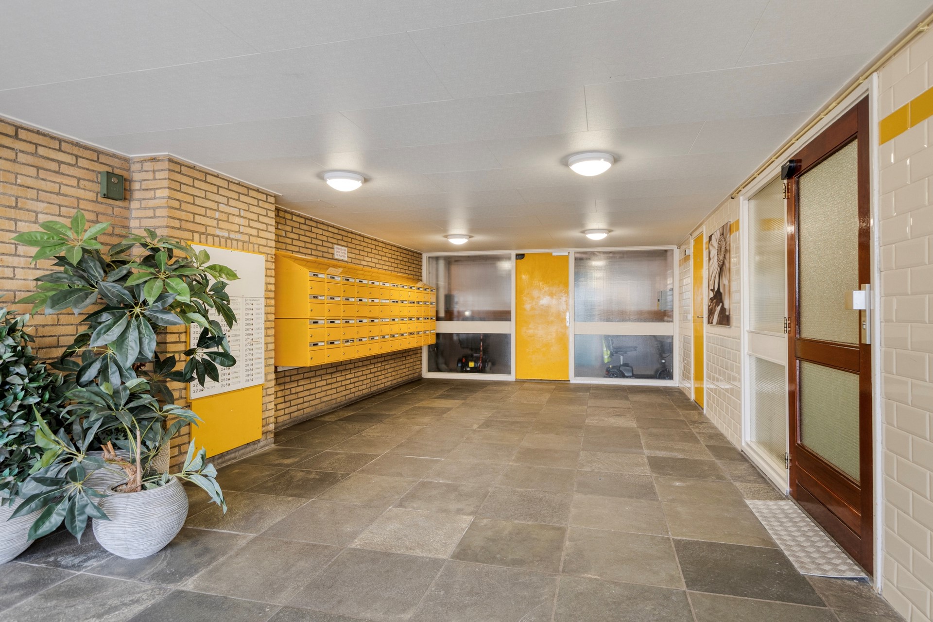 Centrale entree met brievenbussen en intercomsysteem inclusief toegang tot de berging (6 m²). Het appartement bereikt u via de trap en/of lift en via de eigen overdekte galerij.