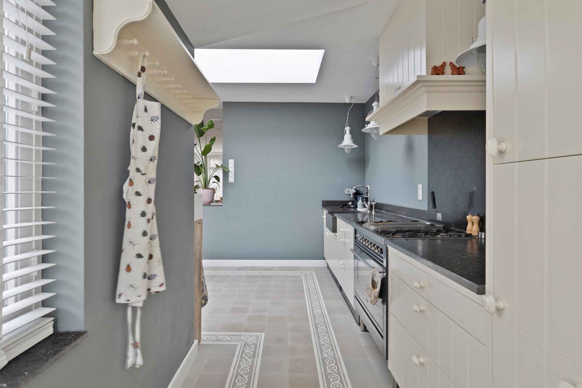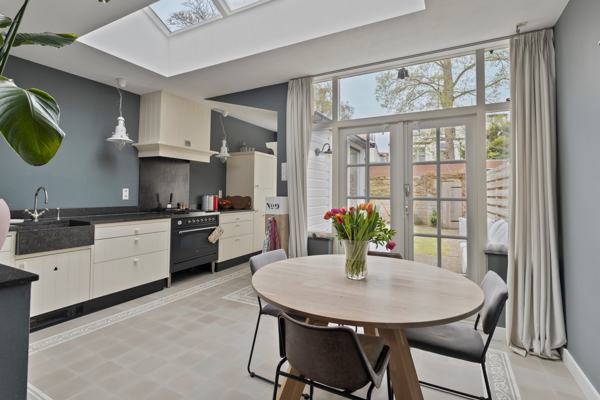 Aan de achterzijde bevindt zich de ruime eetkeuken, een prettige plek waar koken en samenzijn centraal staan. De keuken -met Portugese vloertegels- is uiteraard voorzien van de gebruikelijke inbouwapparatuur (zoals vaatwasser, koel/vriescombinatie en een Boretti gasfornuis met oven. De openslaande deuren vormen een mooie verbinding met de achtertuin en laten het daglicht rijkelijk binnenvallen, wat deze ruimte extra aangenaam maakt.