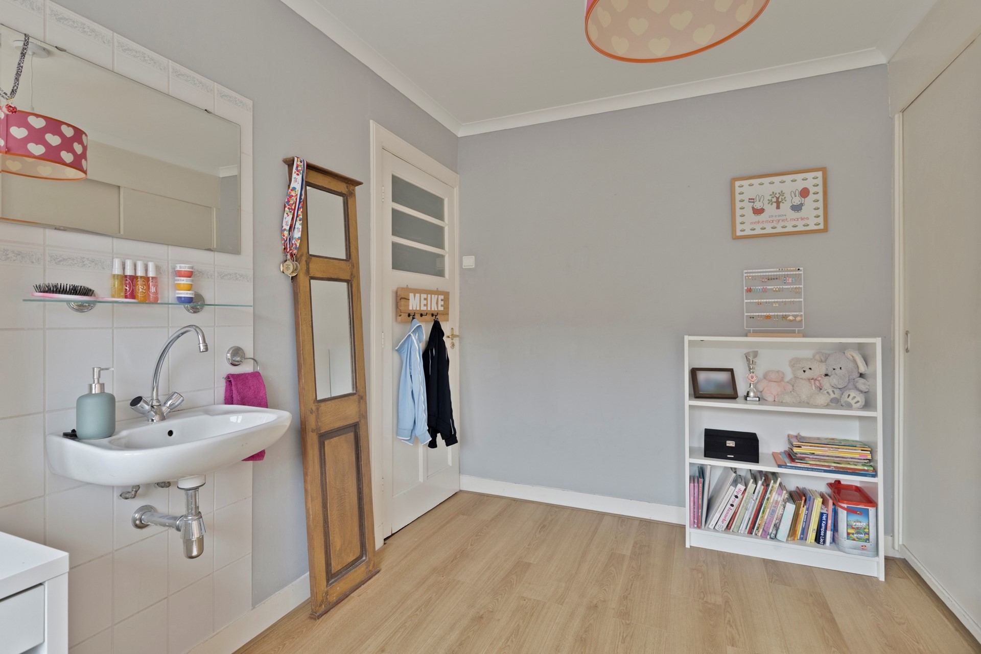 De overloop beschikt over een praktische vaste kast en geeft toegang tot de verschillende vertrekken. De badkamer is compleet ingericht met een ligbad, douche, toilet, vloerverwarming en wastafel. Op deze verdieping bevinden zich twee ruime slaapkamers, beide met een inbouwkast, aangevuld met een derde, kleinere kamer. De grote kamer aan de voorzijde heeft ook een wastafel.