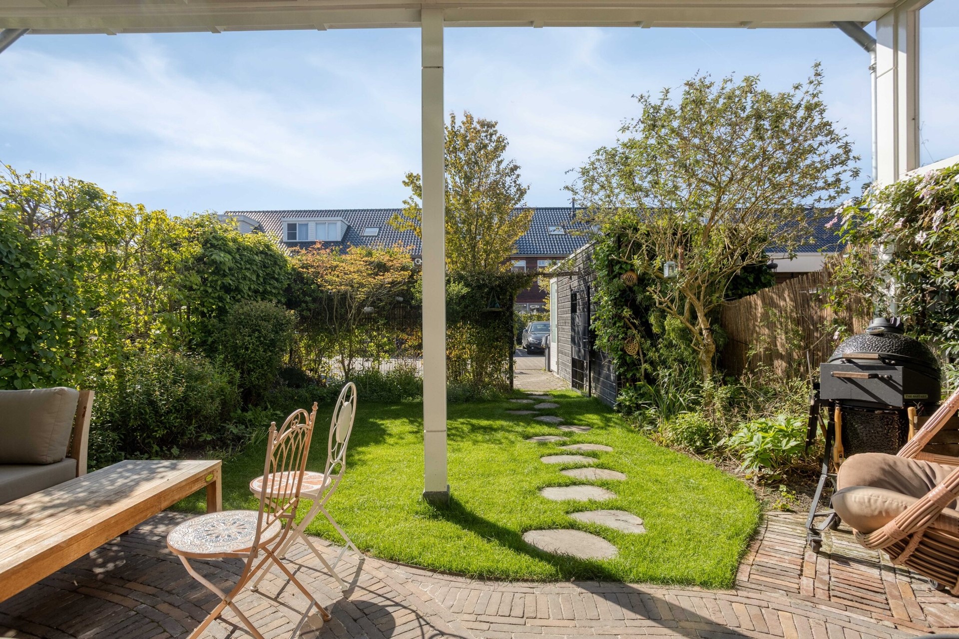 Aan de voorzijde een brede voortuin op het noorden en aan de achterzijde een groene, beschutte diepe achtertuin op het zuiden met aan het huis vast een sfeervolle glazen veranda (2024) over de gehele breedte, vrijstaande berging met elektra, handige achterom en direct aan de achterzijde gelegen 2 parkeerplaatsen op een mandelig terrein waar het veilig spelen is voor kinderen. In de berging, naast de 2 parkeerplaatsen op eigen terrein, is krachtstroom aangelegd voor het plaatsen van een laadpaal voor een elektrische auto.