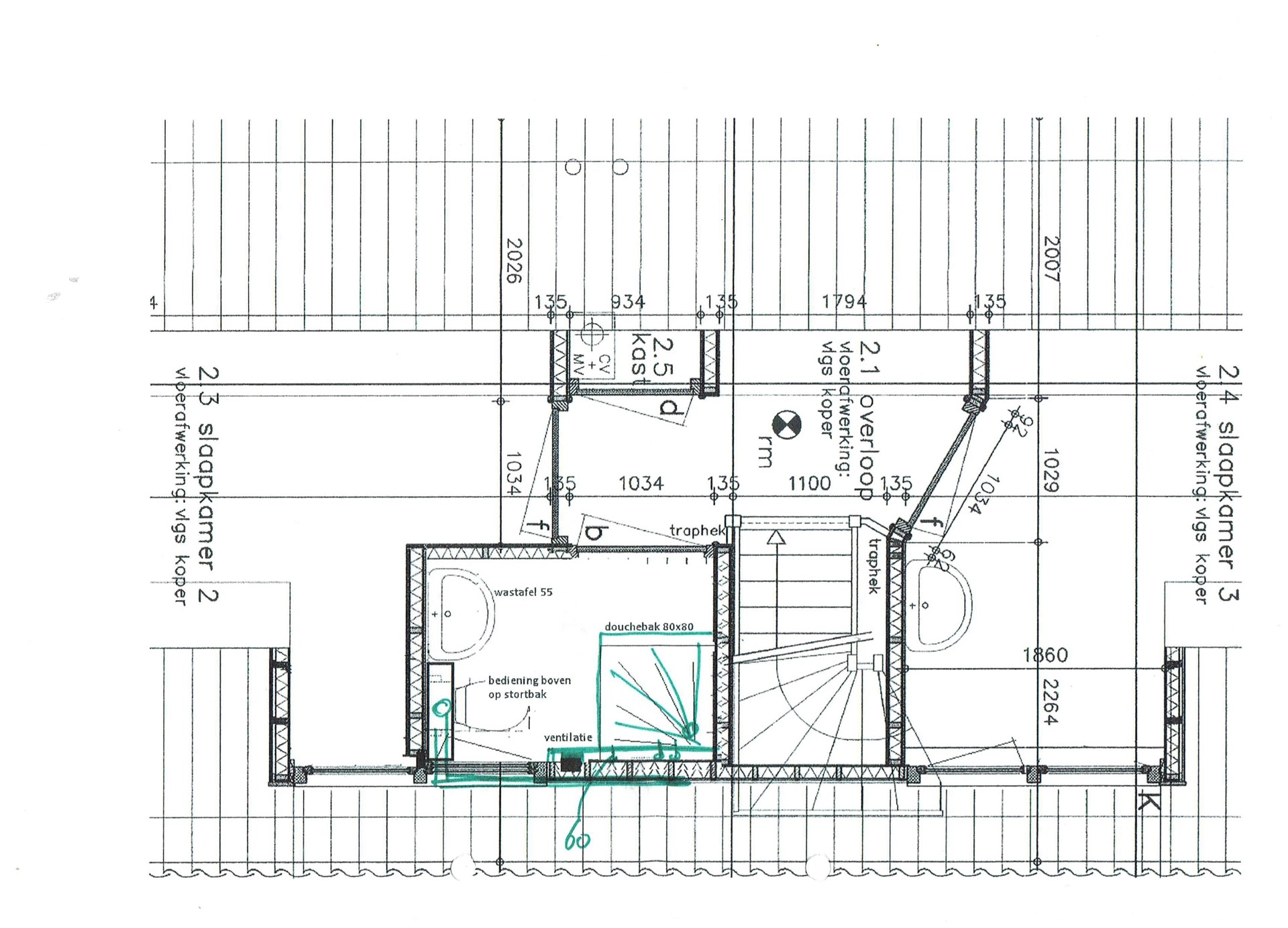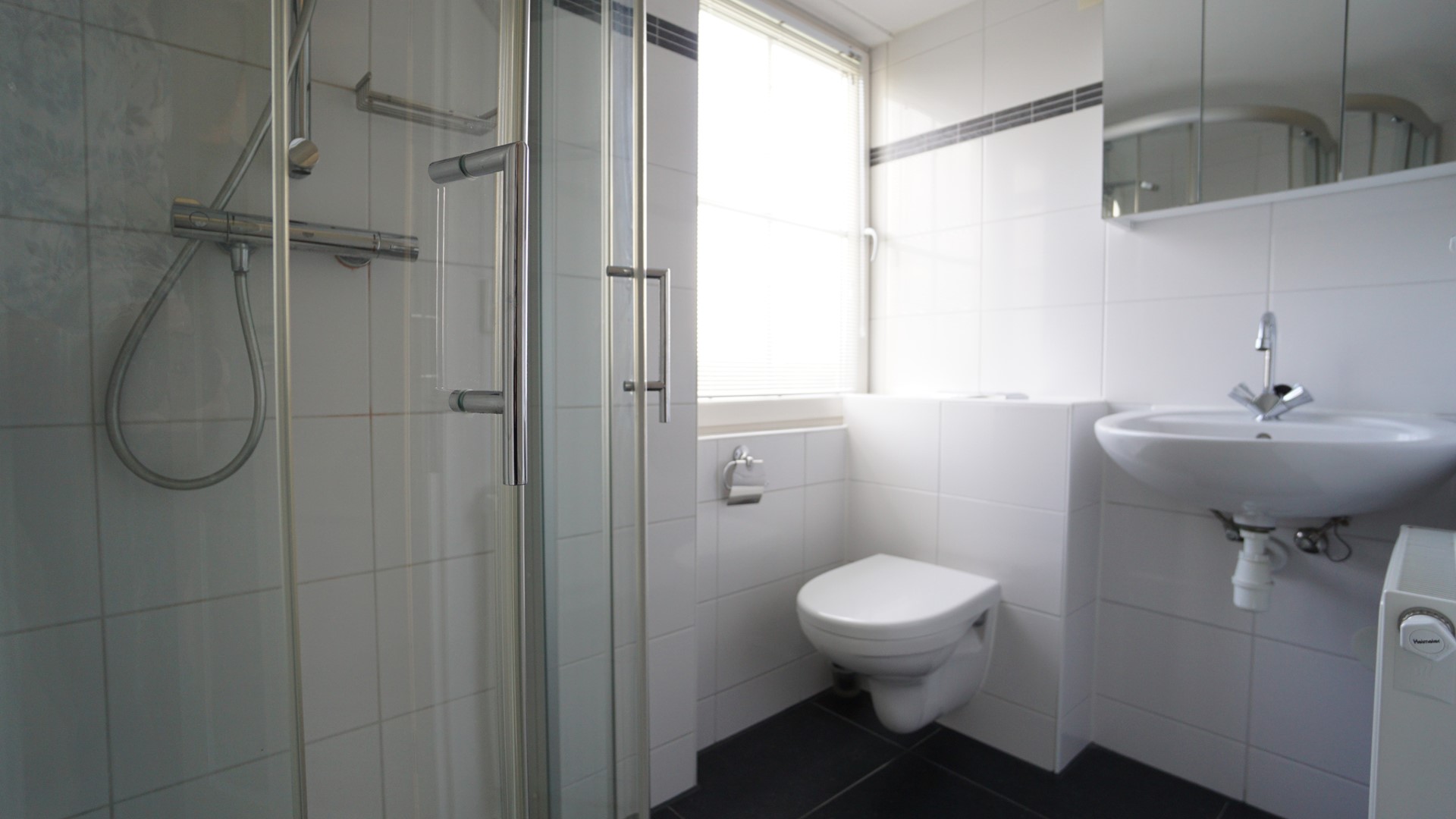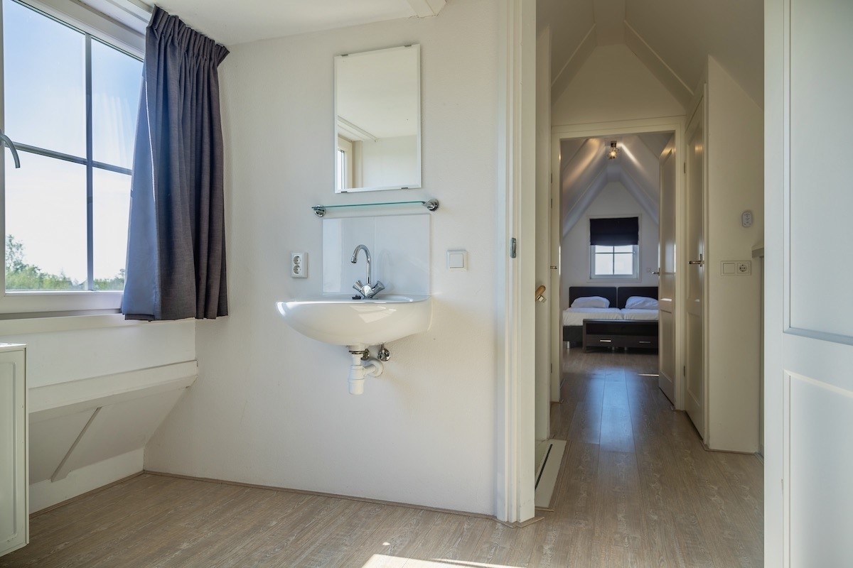 De andere twee slaapkamers met gedeelde dakkapel bevinden zich onder de kap 2, elk met 2 eenpersoonsbedden (eveneens ter overname). Tevens is er een tweede badkamer met douche en toilet alsmede een cv ruimte aanwezig.