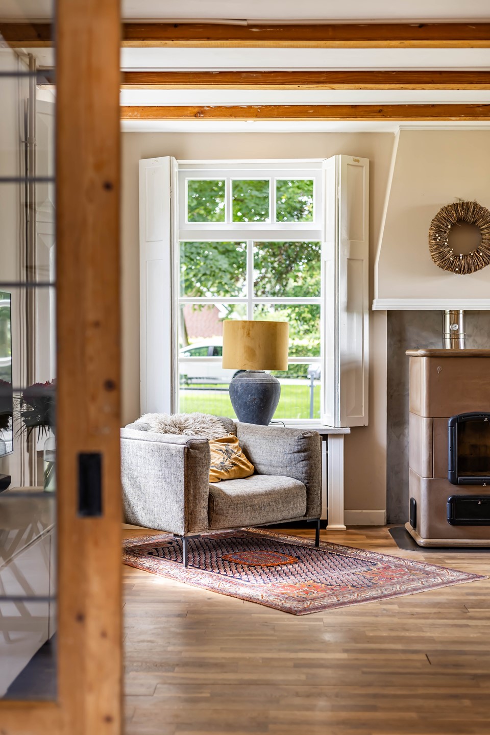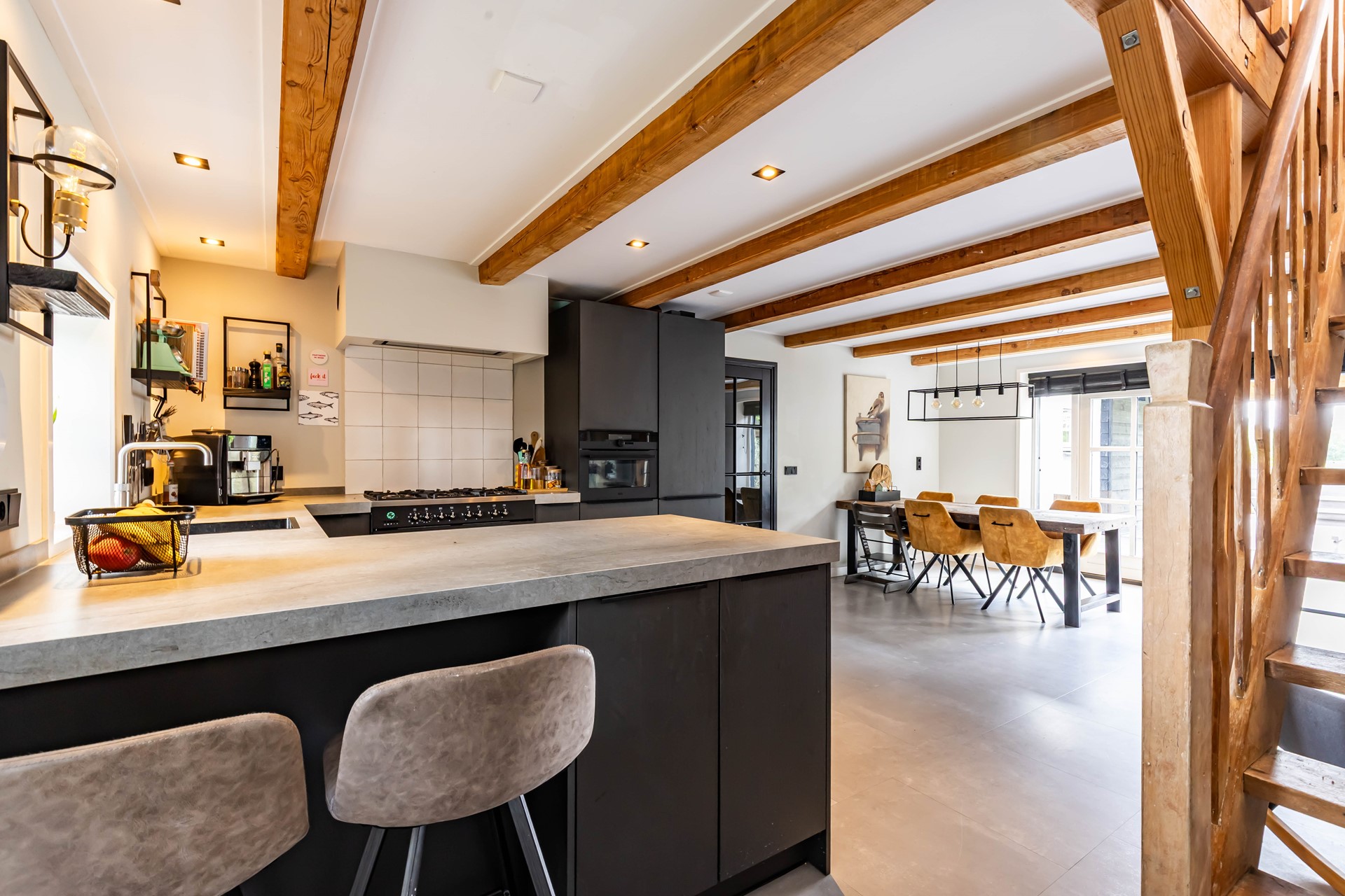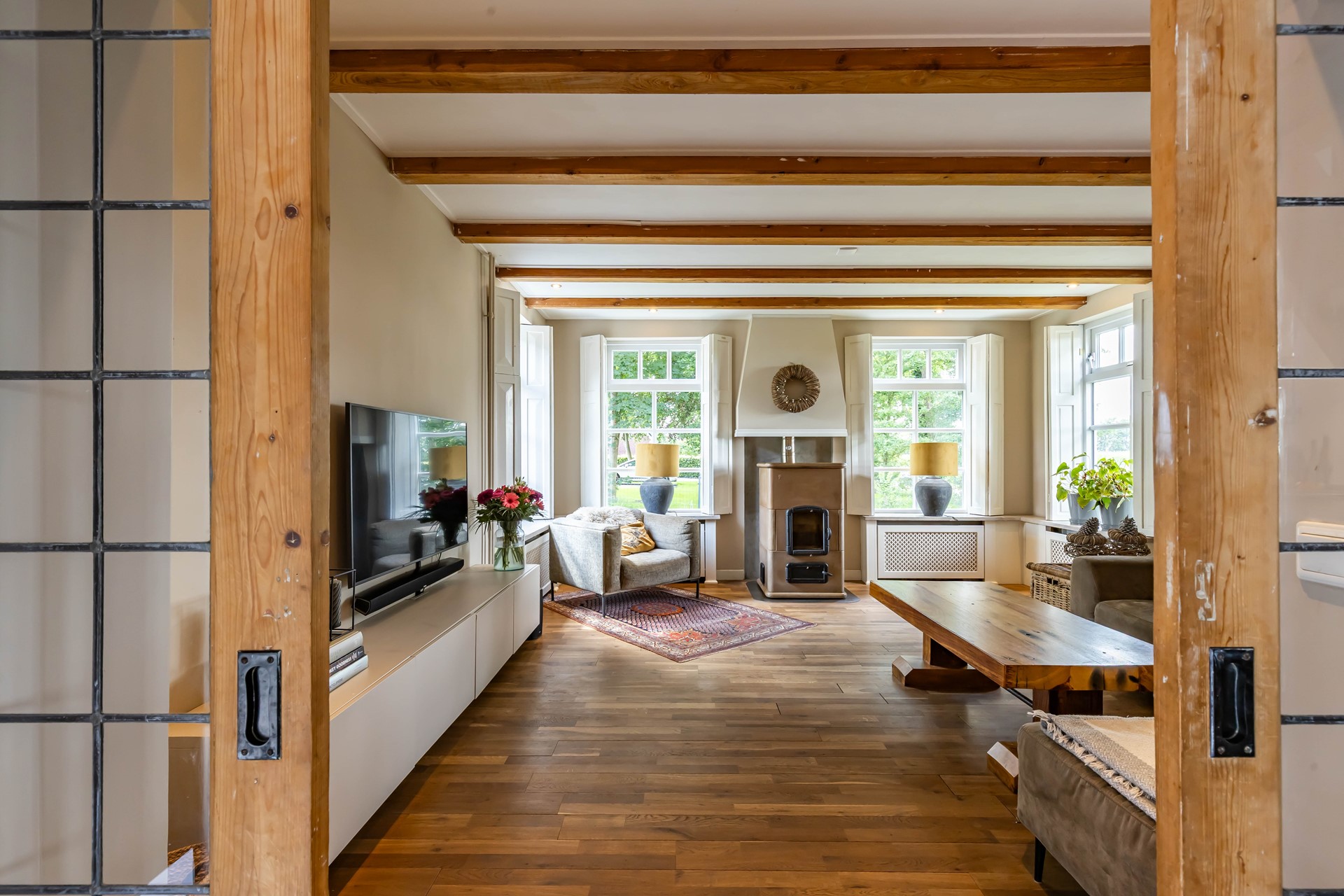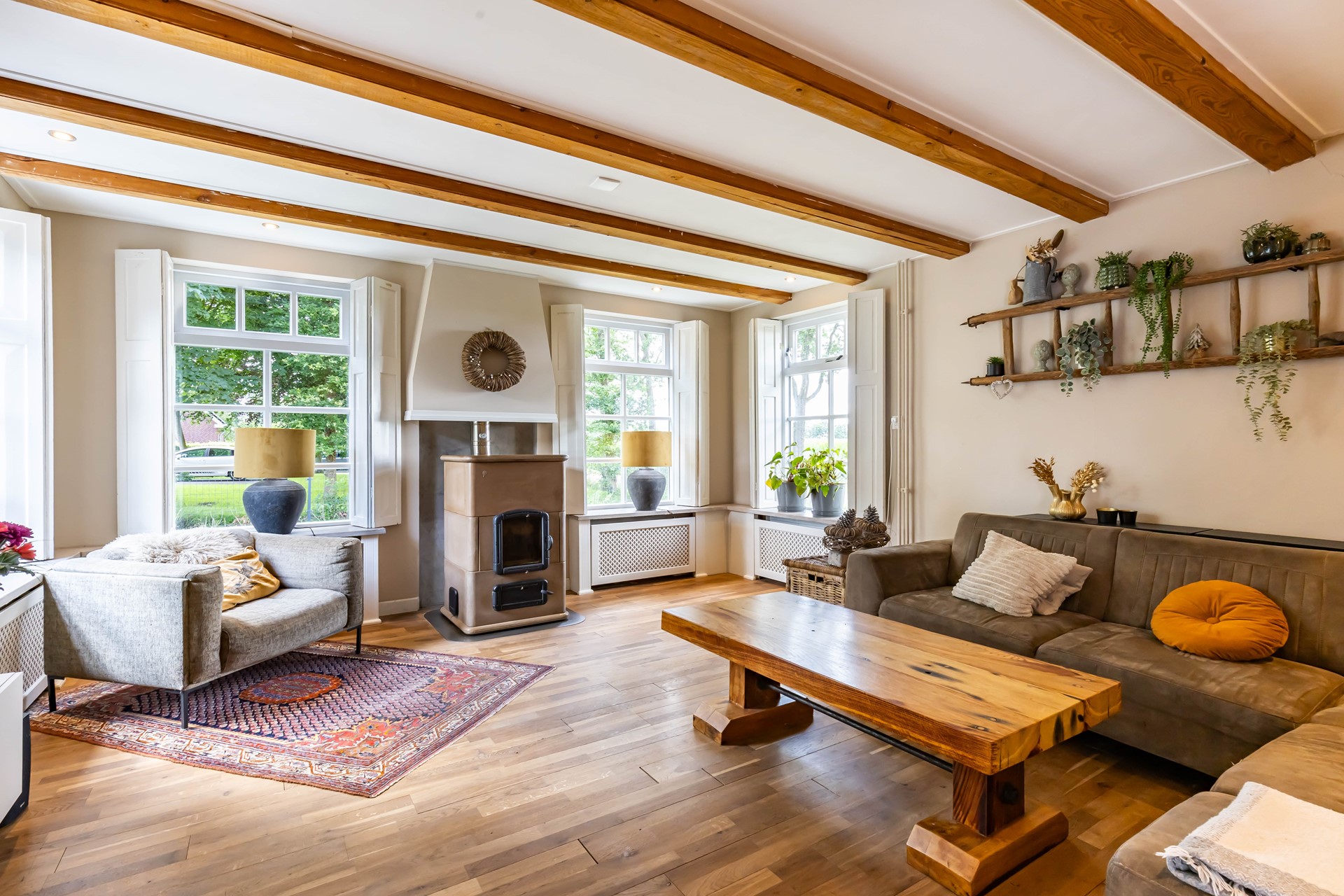 De woonkamer en keuken en suite staan met elkaar in verbinding. De woonkamer heeft een robuuste Tigchelaar kachel voor de knusse winteravonden. De keuken is modern en voorzien van inbouwapparatuur zoals een Quookerkraan en oven. De masterbedroom ligt op de benedenverdieping, net als de luxe badkamer, waardoor de woning levensloopbestendig is. Leuk detail is de vide in de slaapkamer. Op de begane grond is daarnaast nog een praktische studeerkamer. Op de verdieping zijn nog eens drie slaapkamers.