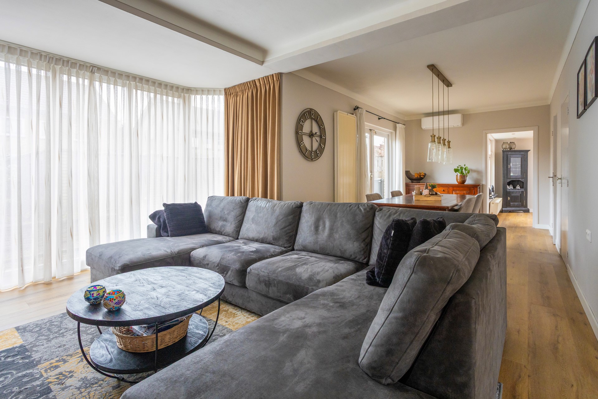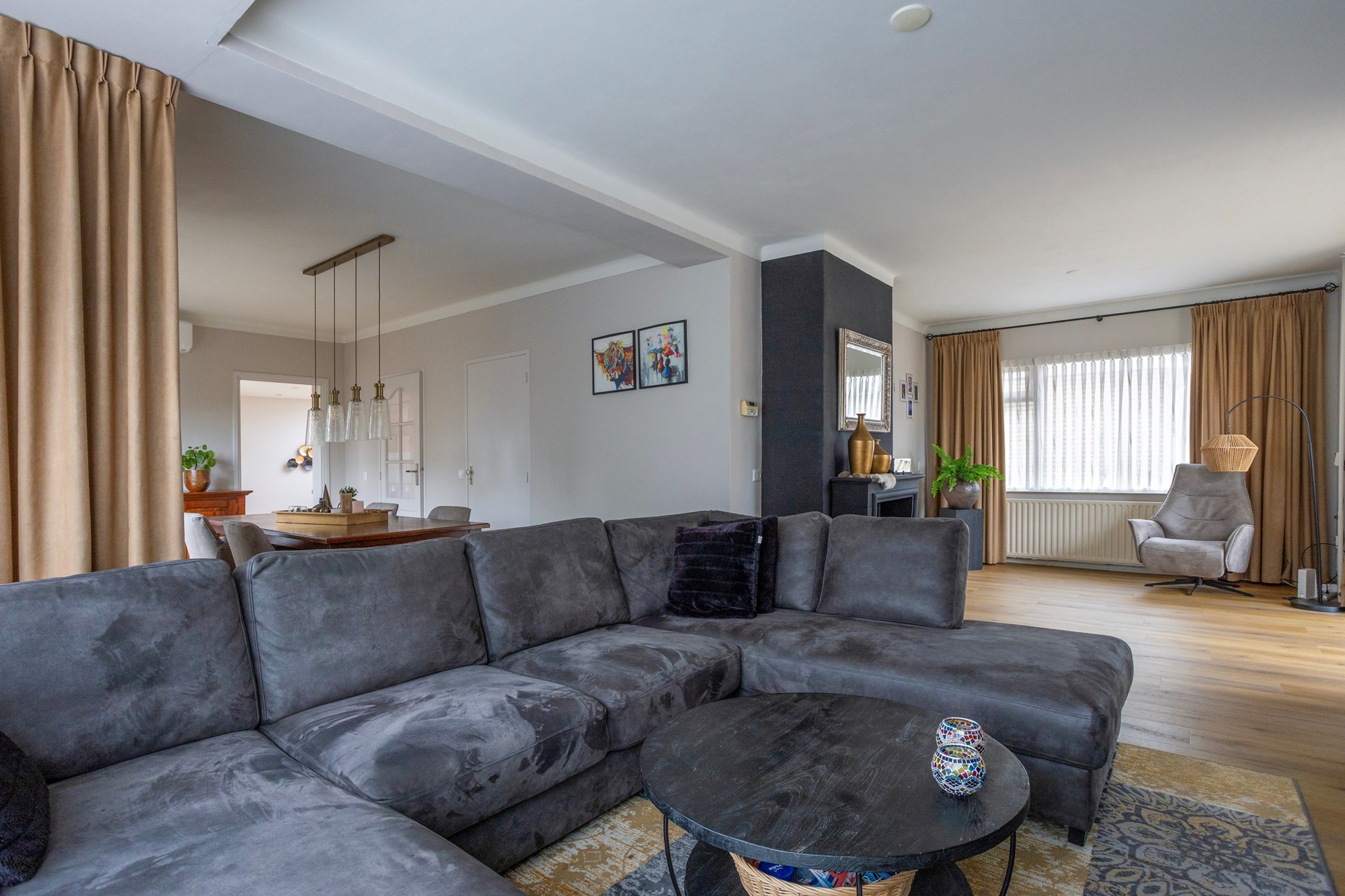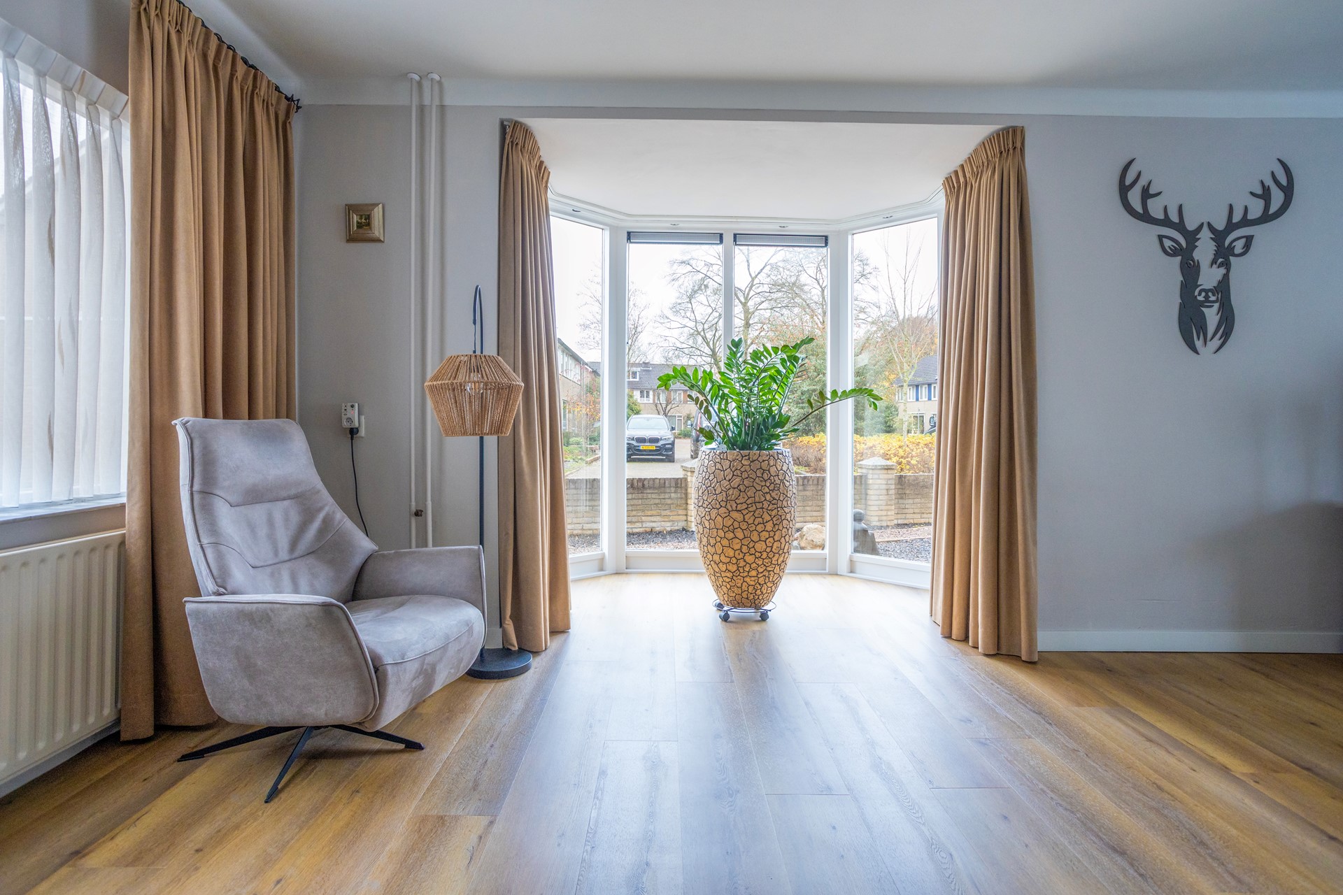 • royale L vormige woon- en eetkamer met een open haard, tuindeuren naar de zijtuin en een erker aan de voorkant en zijkant waardoor het een mooie en lichte
