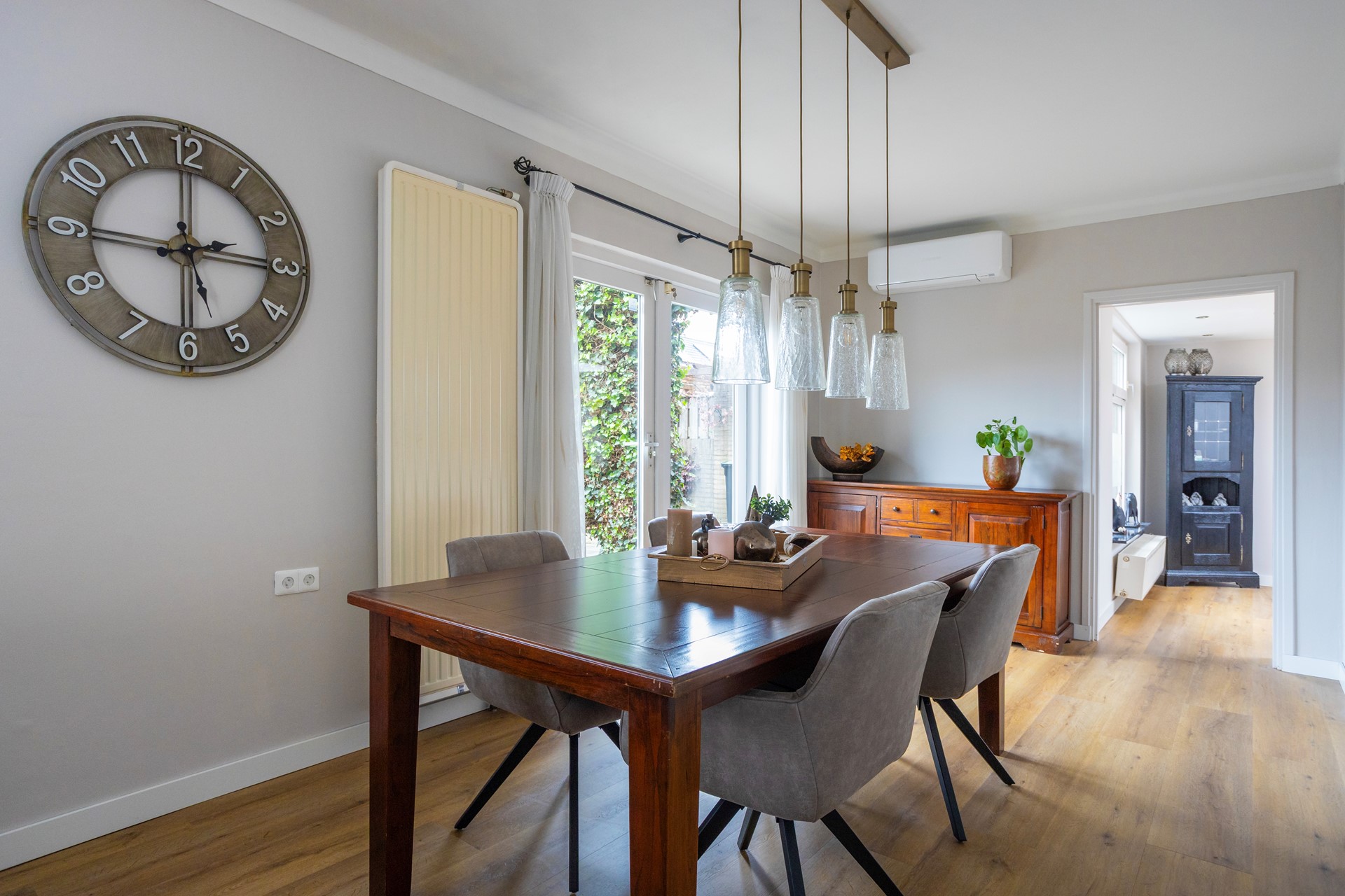 ruimte is, in deze ruimte is een airco (verwarming en koeling) gemonteerd; plafond en wanden v.v. stucwerk, toegang tot de (open) keuken en tuinkamer