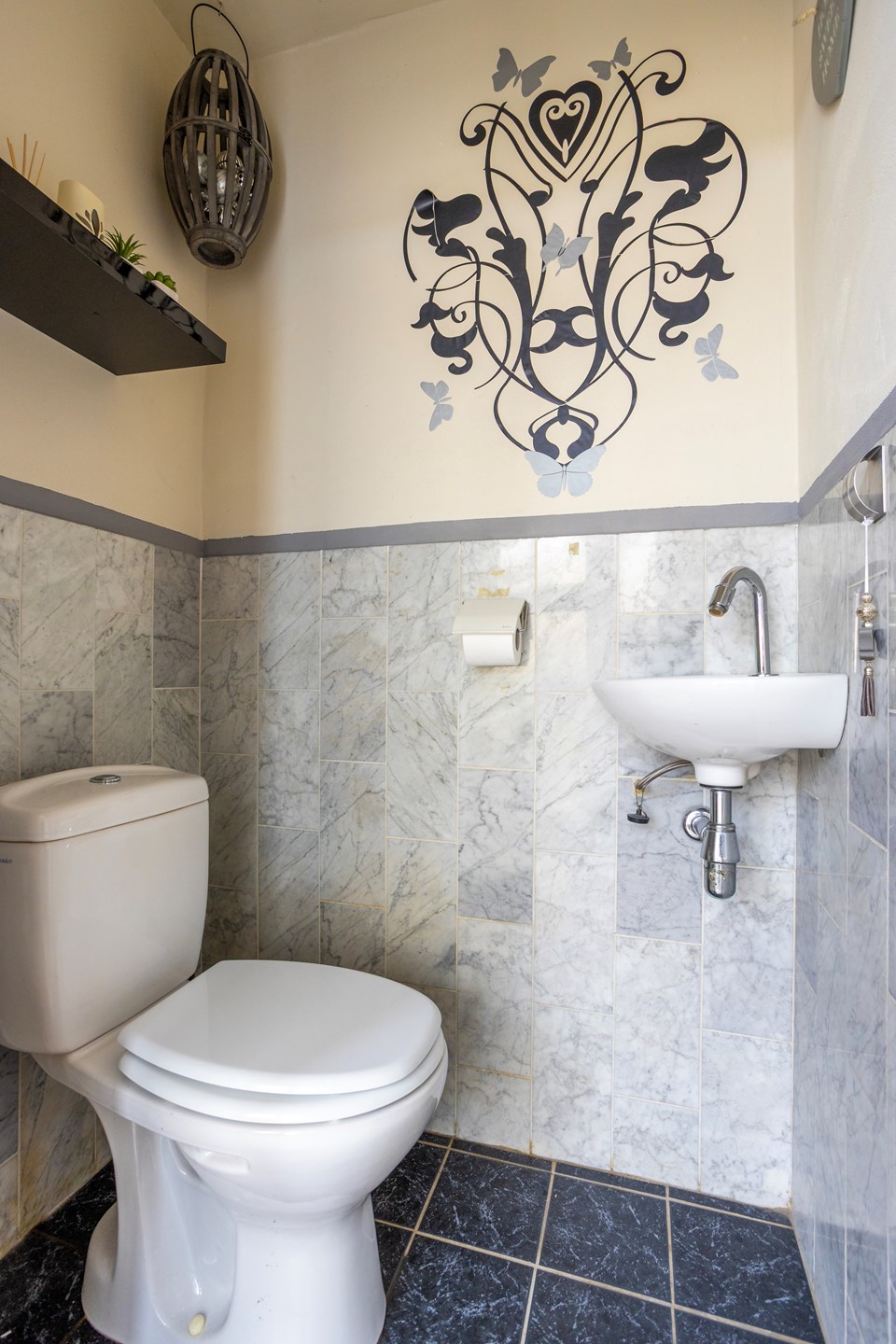 • de toiletruimte is v.v. een toilet en een fonteintje; de wanden zijn v.v. tegelwerk in licht grijze kleur
