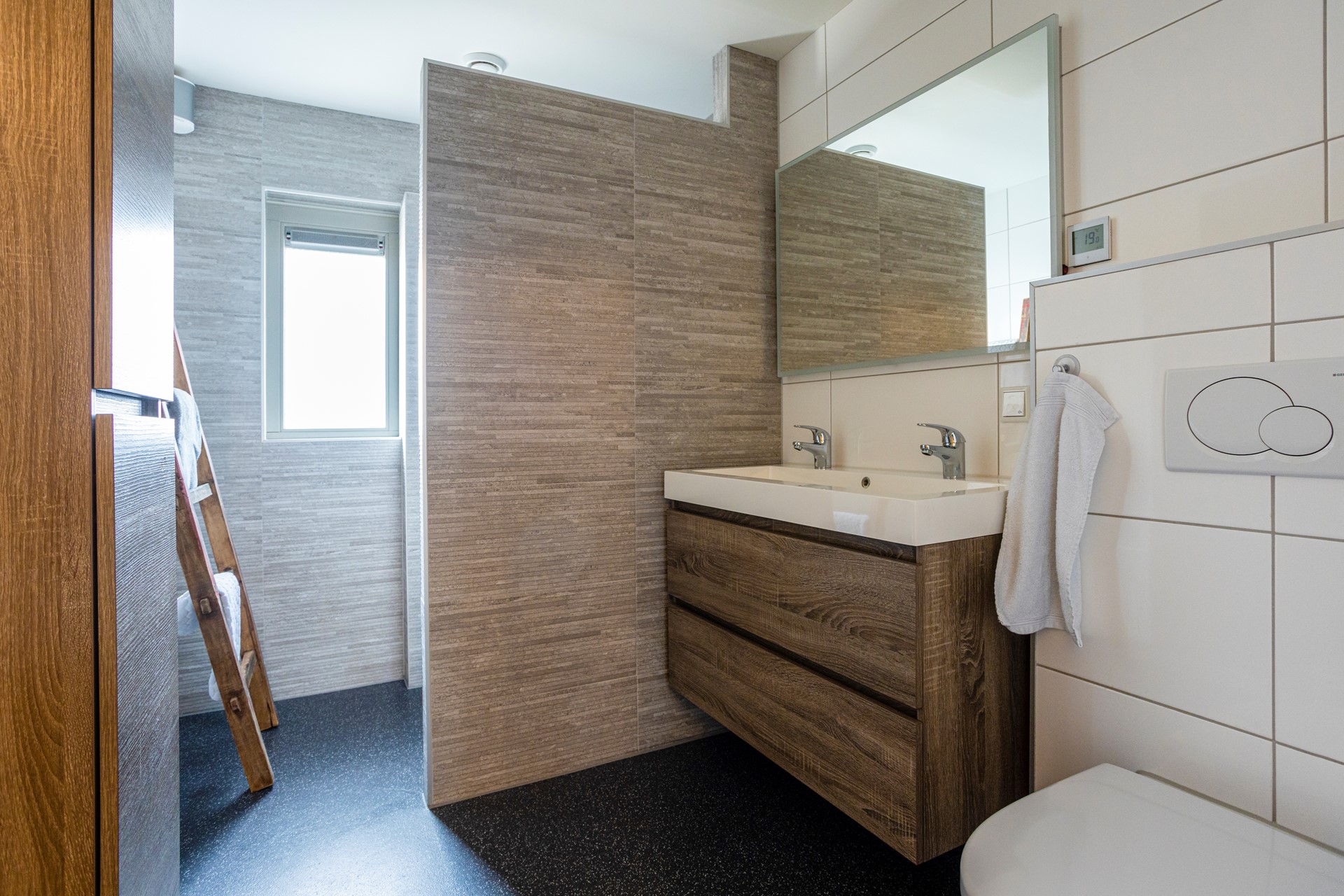 • ruime en gemoderniseerde badkamer (2017) met inloopdouche, dubbele wastafel met ondermeubel en vrijhangend toilet; de badkamer is v.v. elektrische