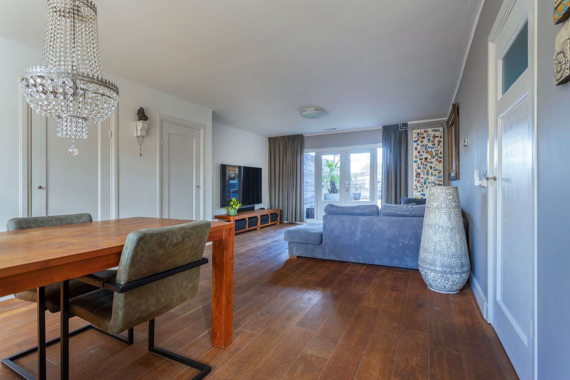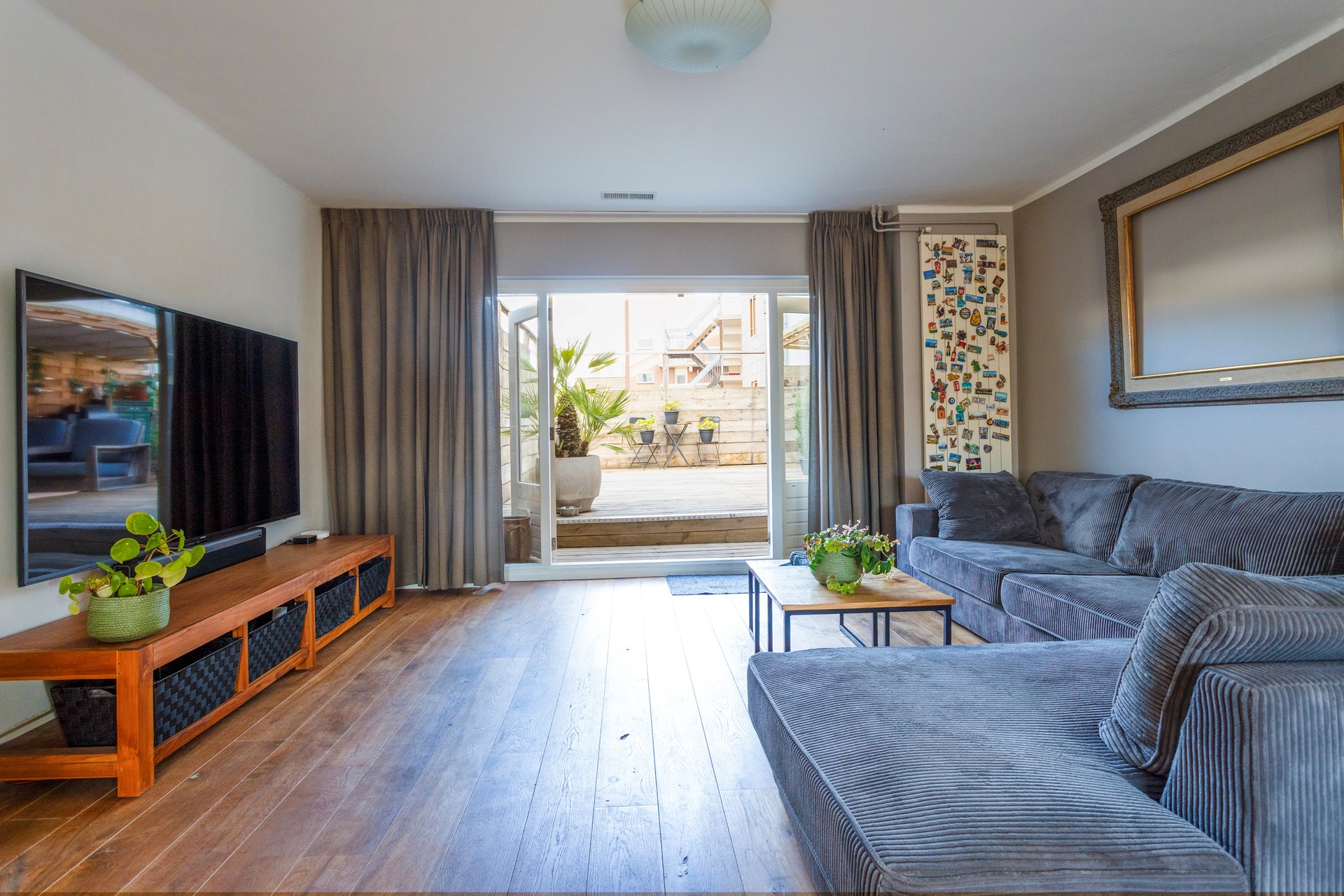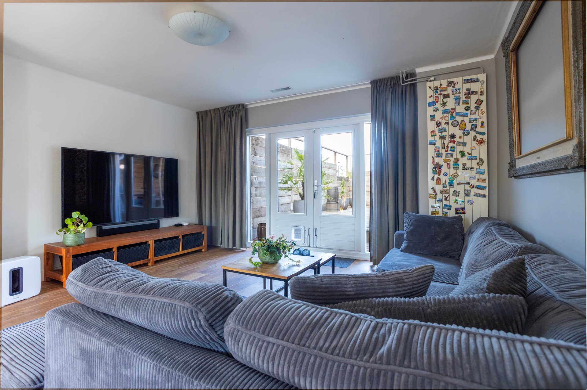 • ruime woonkamer met 2 ingebouwde kasten en openslaande deuren die toegang bieden tot dakterras