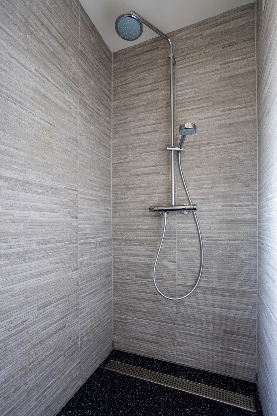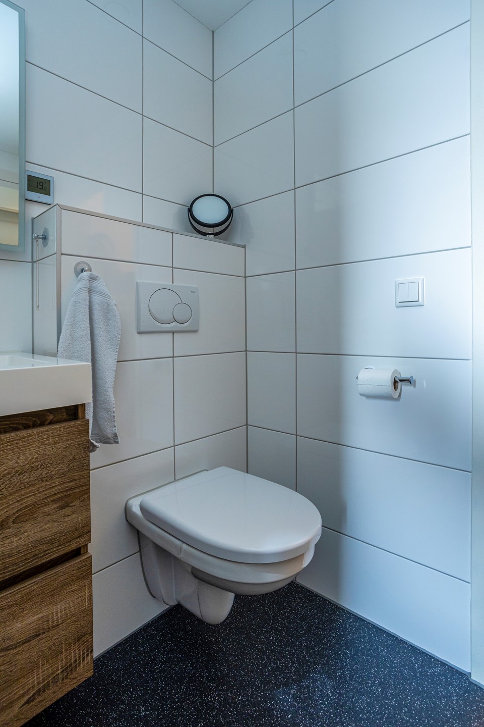 vloerverwarming en radiator en is afgewerkt in wit en grijze betegeling