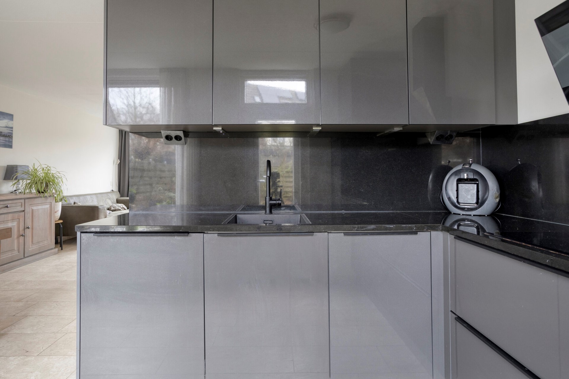 Strakke openkeuken in een hoogglans afwerking. Een blikvanger van de begane grond. Er is voldoende bergruimte voor de pannen en boodschappenvoorraad. Het granieten aanrecht biedt veel werkruimte om de heerlijkste maaltijden te bereiden. Extra praktisch is het granietenspatscherm en de toegang tot de tuin.