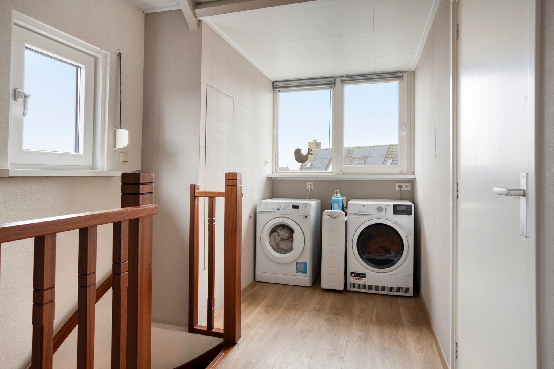 Via de vaste trap is de tweede/ zolderverdieping te bereiken. De overloop is mooi van opzet. Onder het dakkapel plaats je de wasmachine en droger. Er is veel handige bergruimte en de in de combiketel hangt keurig uit het zicht. De overloop geeft toegang tot een extra slaapkamer.