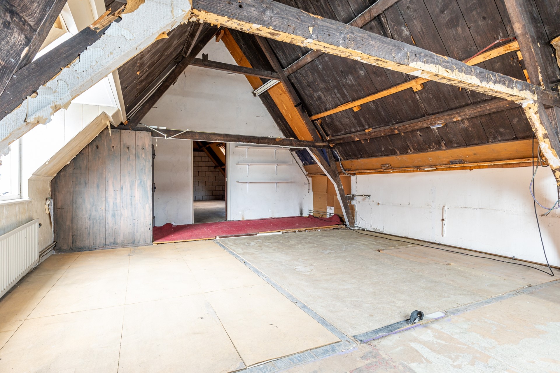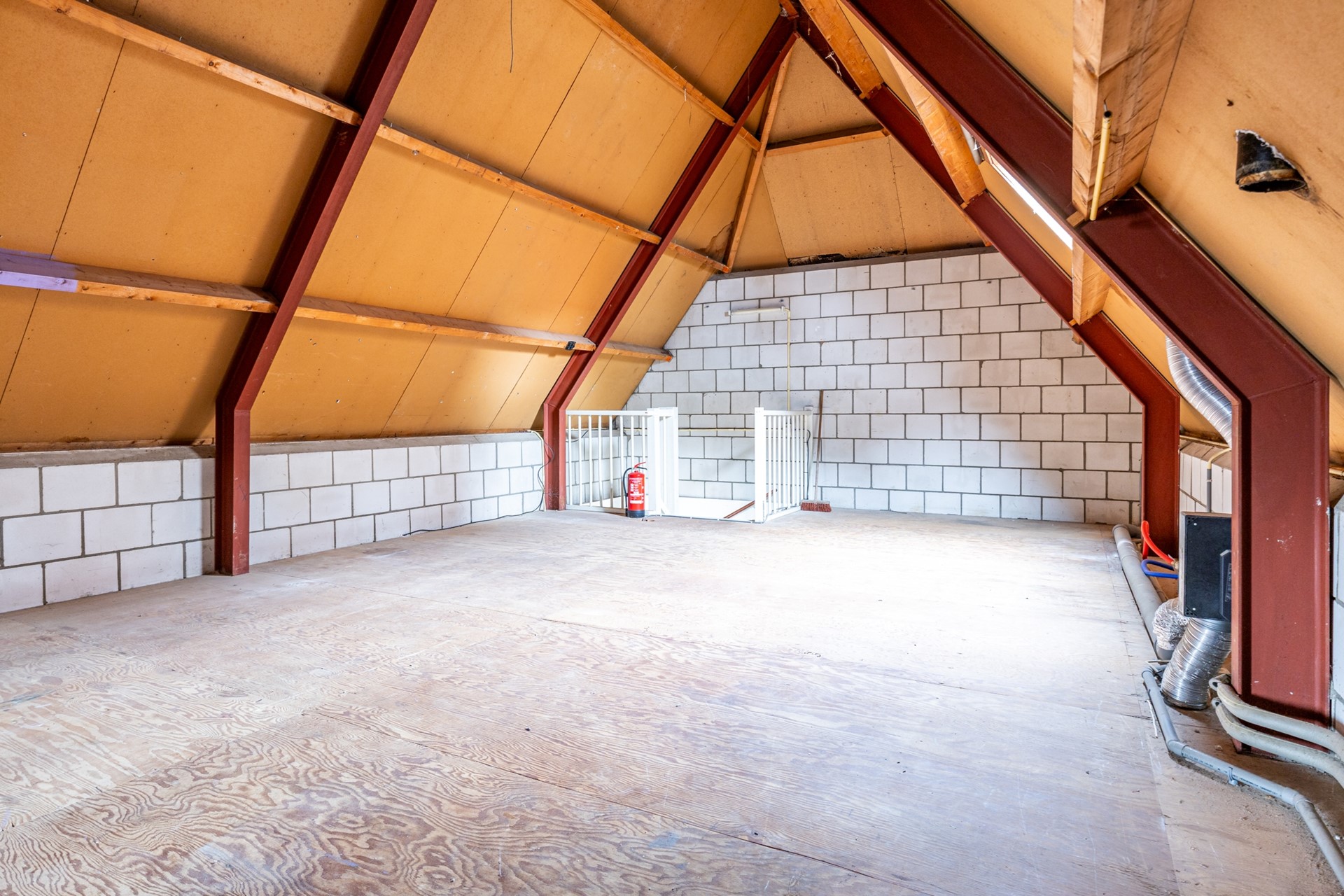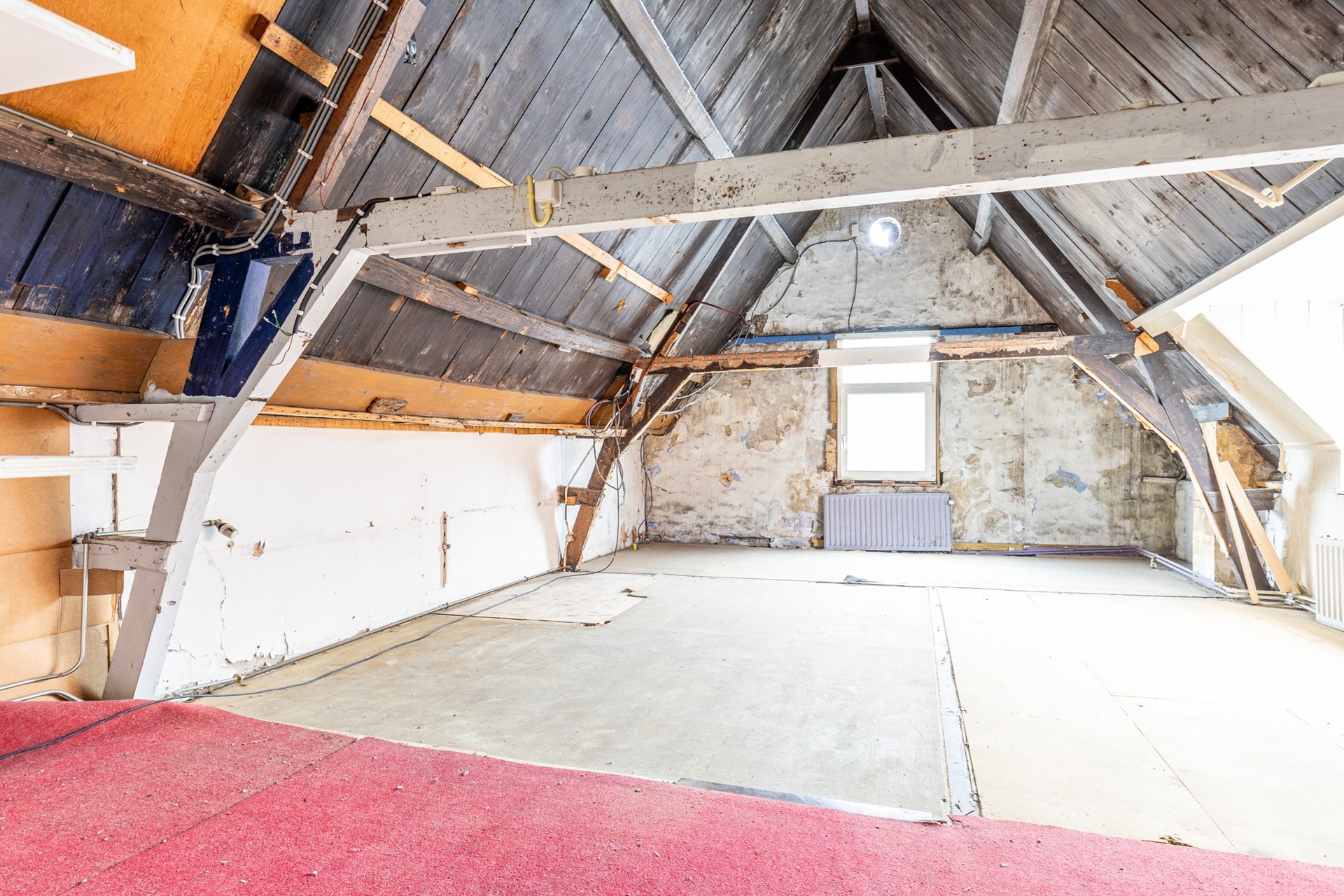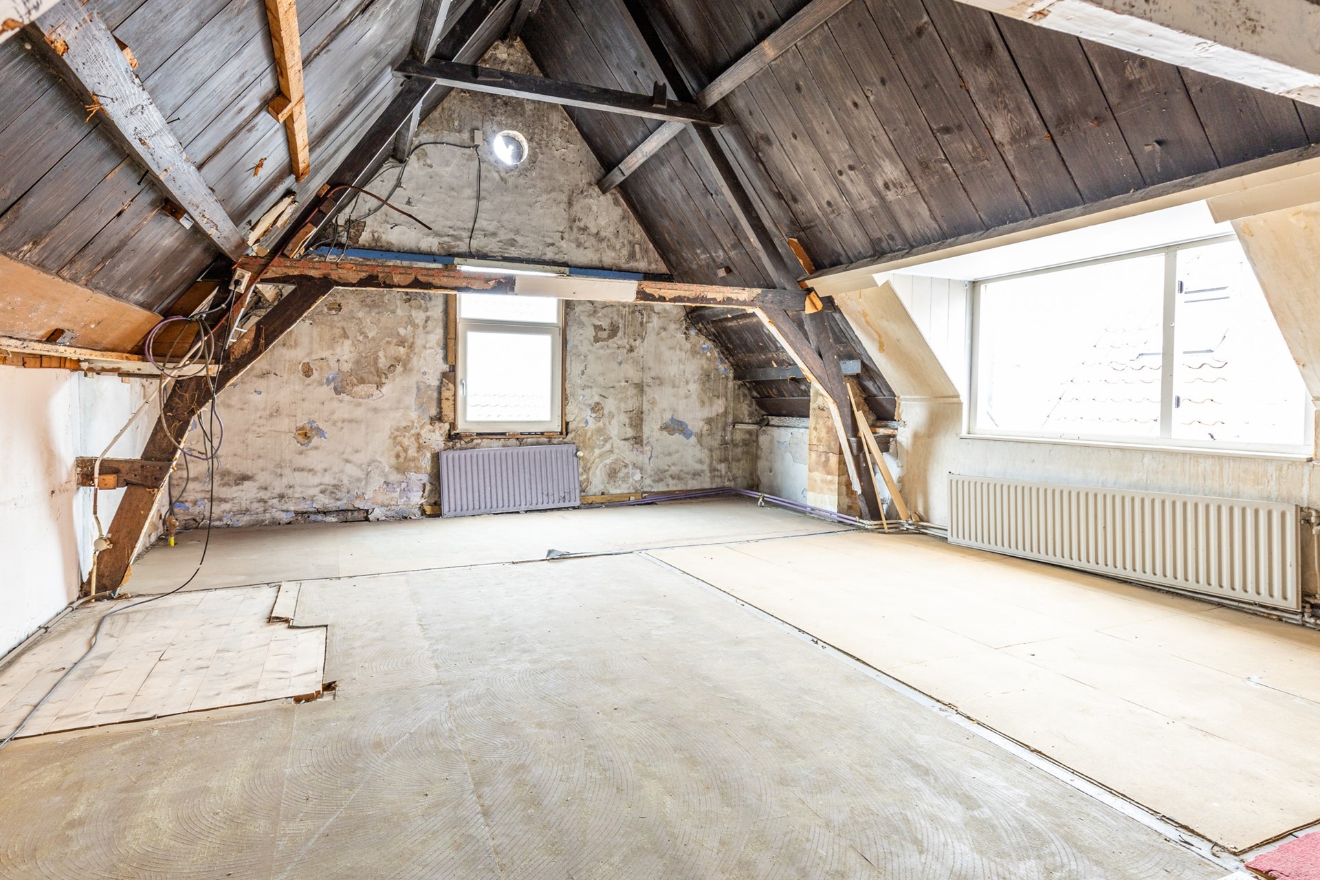 De bovenverdieping vormt één grote kapverdieping en is momenteel opgedeeld in twee open ruimtes. De royale nokhoogte en de vele ramen zorgen voor een lichte en luchtige sfeer. Deze verdieping leent zich uitstekend voor het realiseren van twee ruime slaapkamers en een moderne badkamer, of bijvoorbeeld een masterbedroom met walk-in closet en werkhoek.