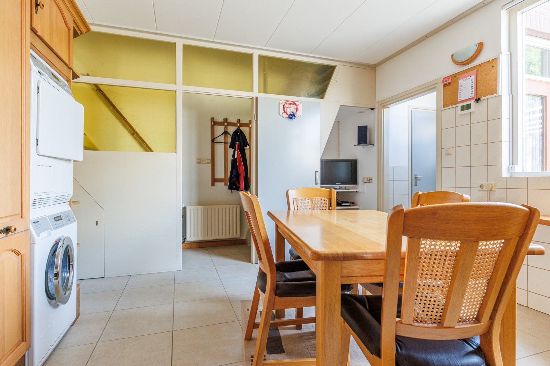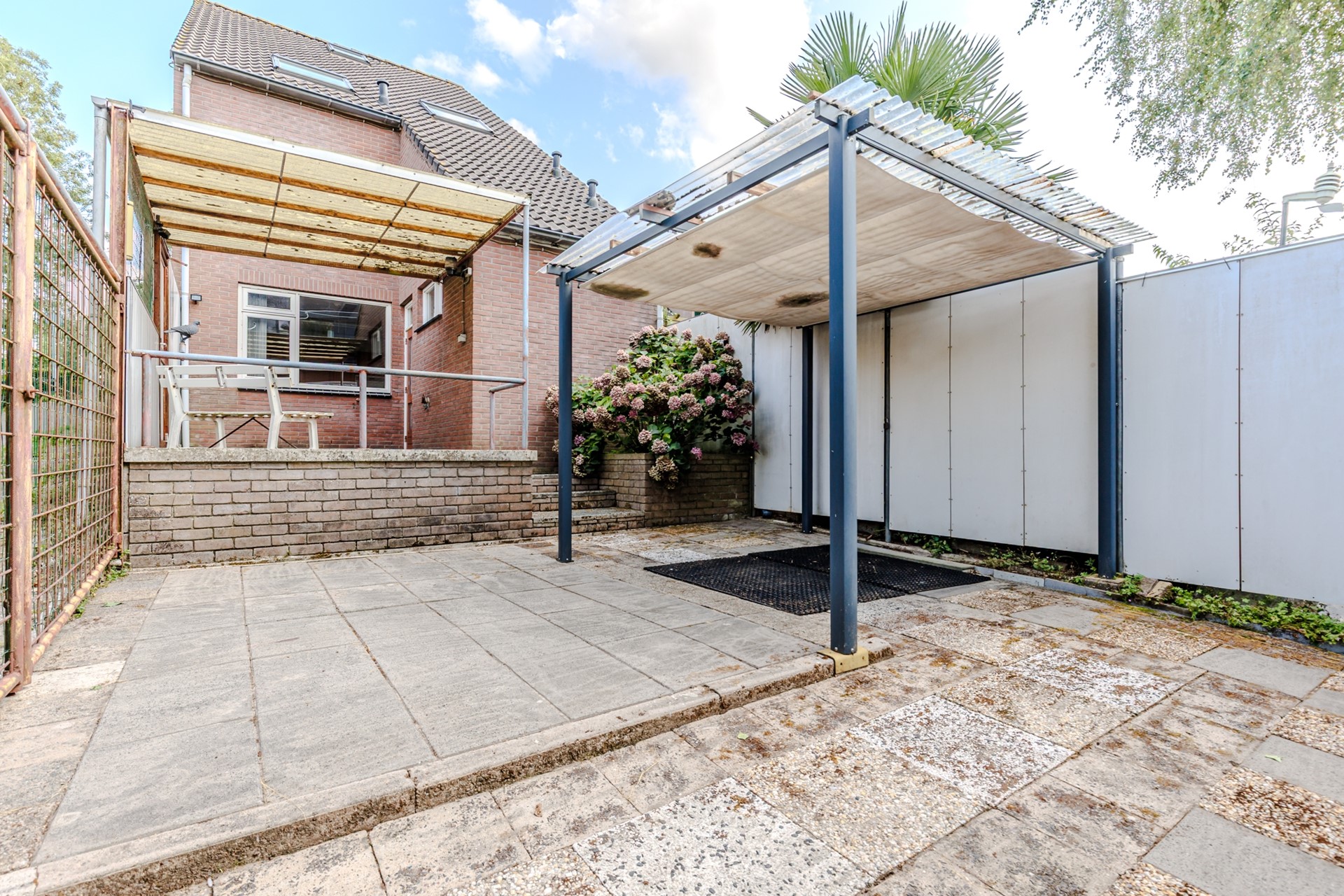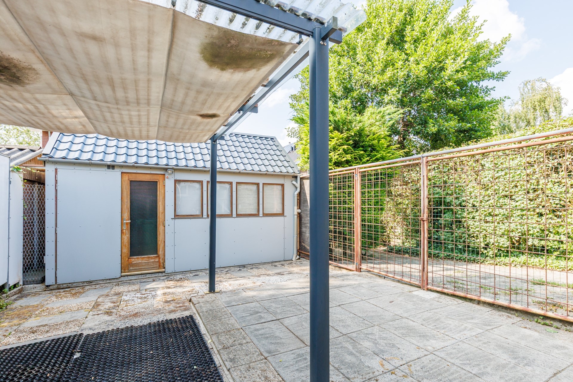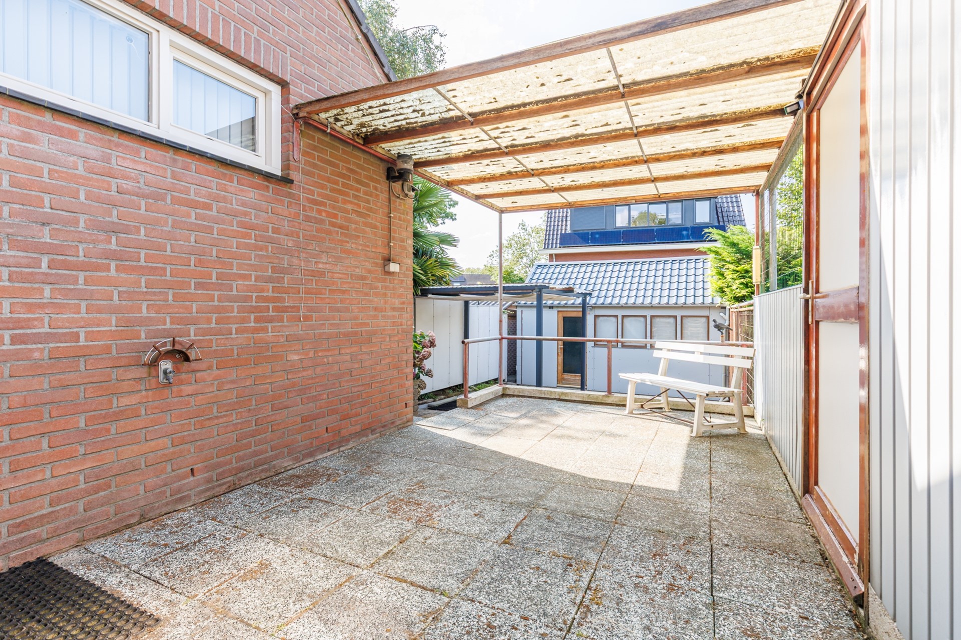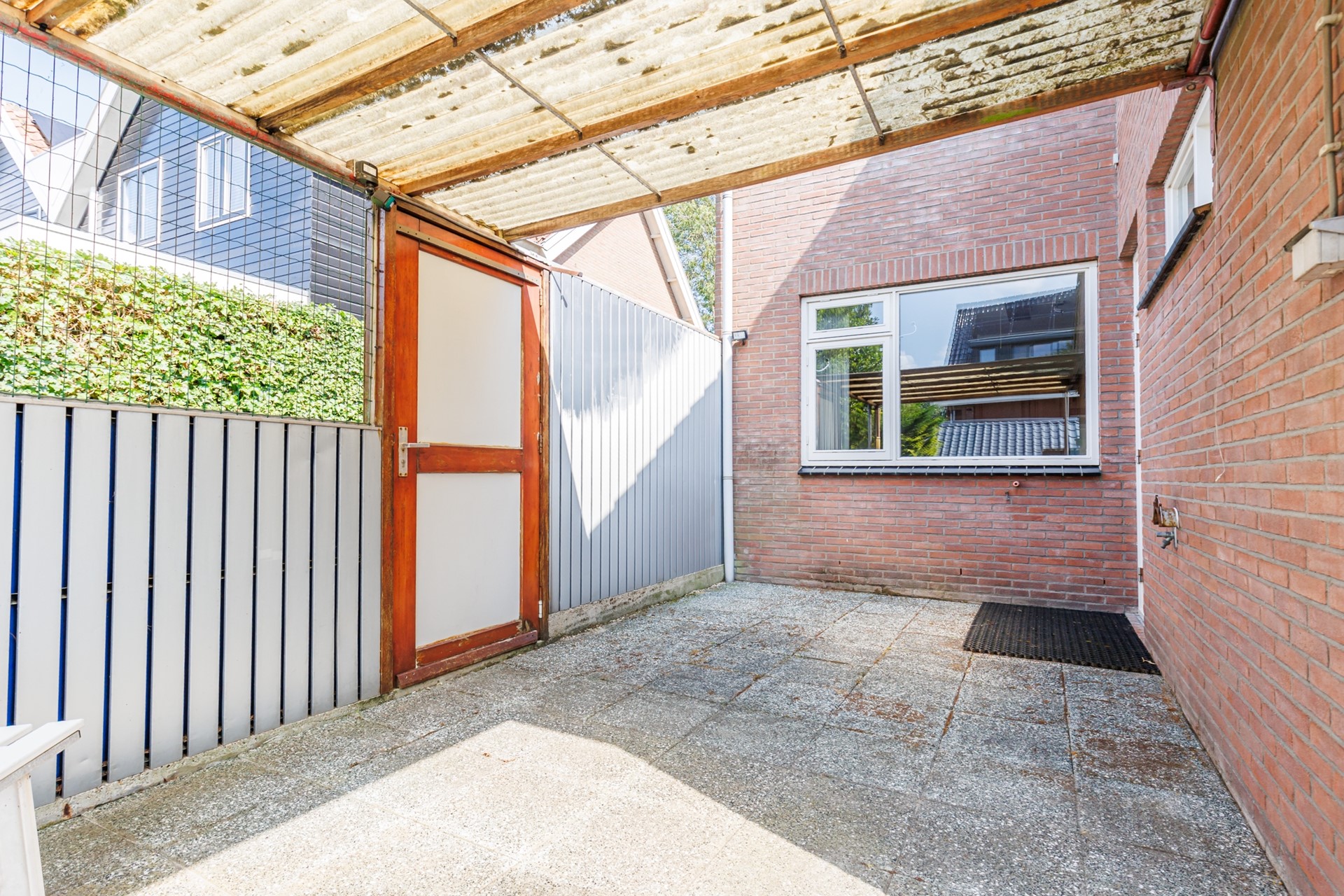 De achtertuin ligt op het noordwesten en biedt een fijne combinatie van rust, privacy en zon in de middag en avond. De tuin is grotendeels bestraat, waardoor deze onderhoudsvriendelijk is en ruimte biedt voor meerdere zitjes of een loungehoek. Achterin staat een stenen berging, ideaal voor extra opslag of het stallen van fietsen.