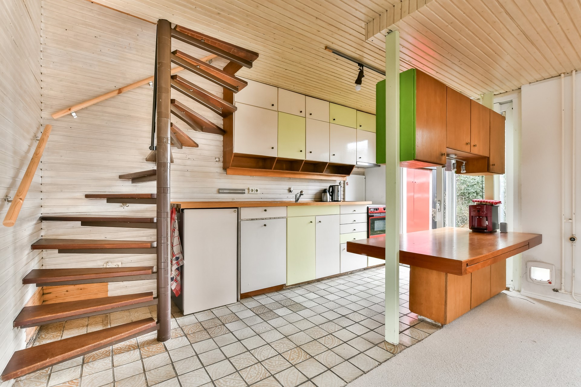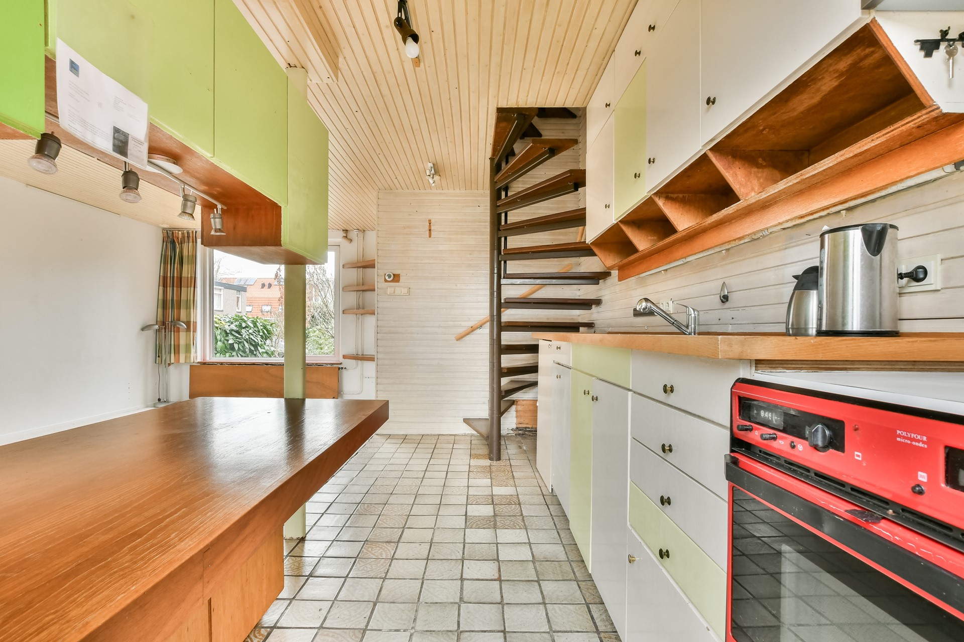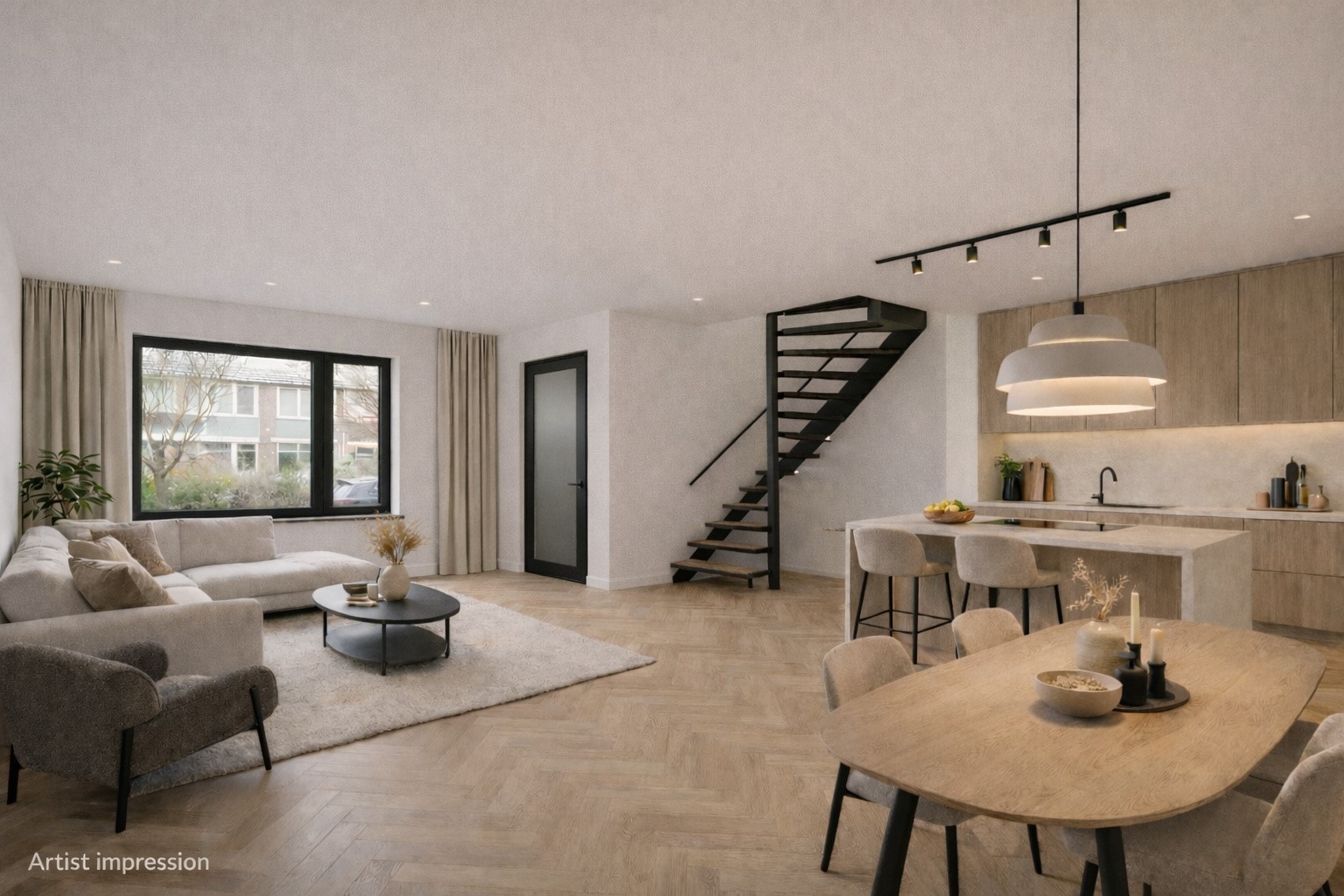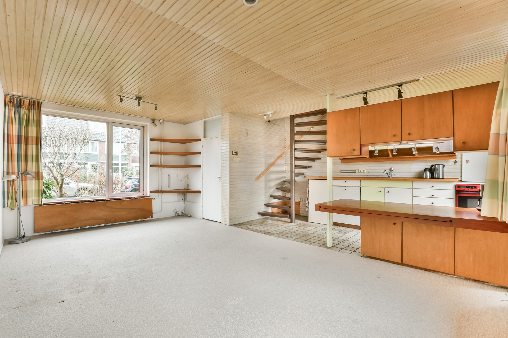 De lichte woonkamer beschikt over een grote raampartij aan zowel de voor- als achterzijde, wat zorgt voor een prettige lichtinval gedurende de dag. De kunststof kozijnen zijn uitgevoerd met HR dubbel glas. De wenteltrap geeft toegang tot de eerste en tweede verdieping.