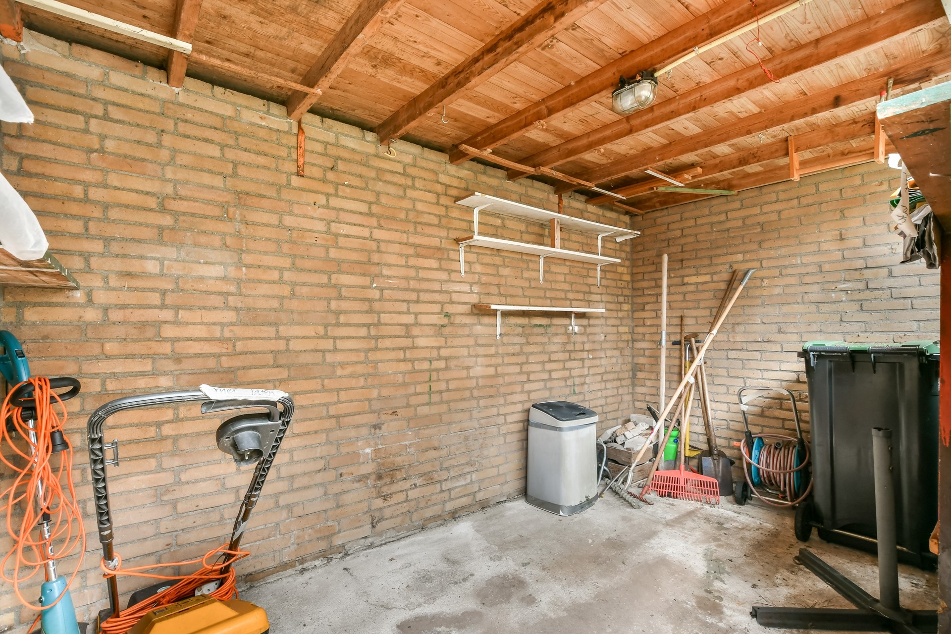 Achter in de tuin staat een stenen schuur (8,4m²). Dankzij de achterom kunnen fietsen eenvoudig worden gestald.