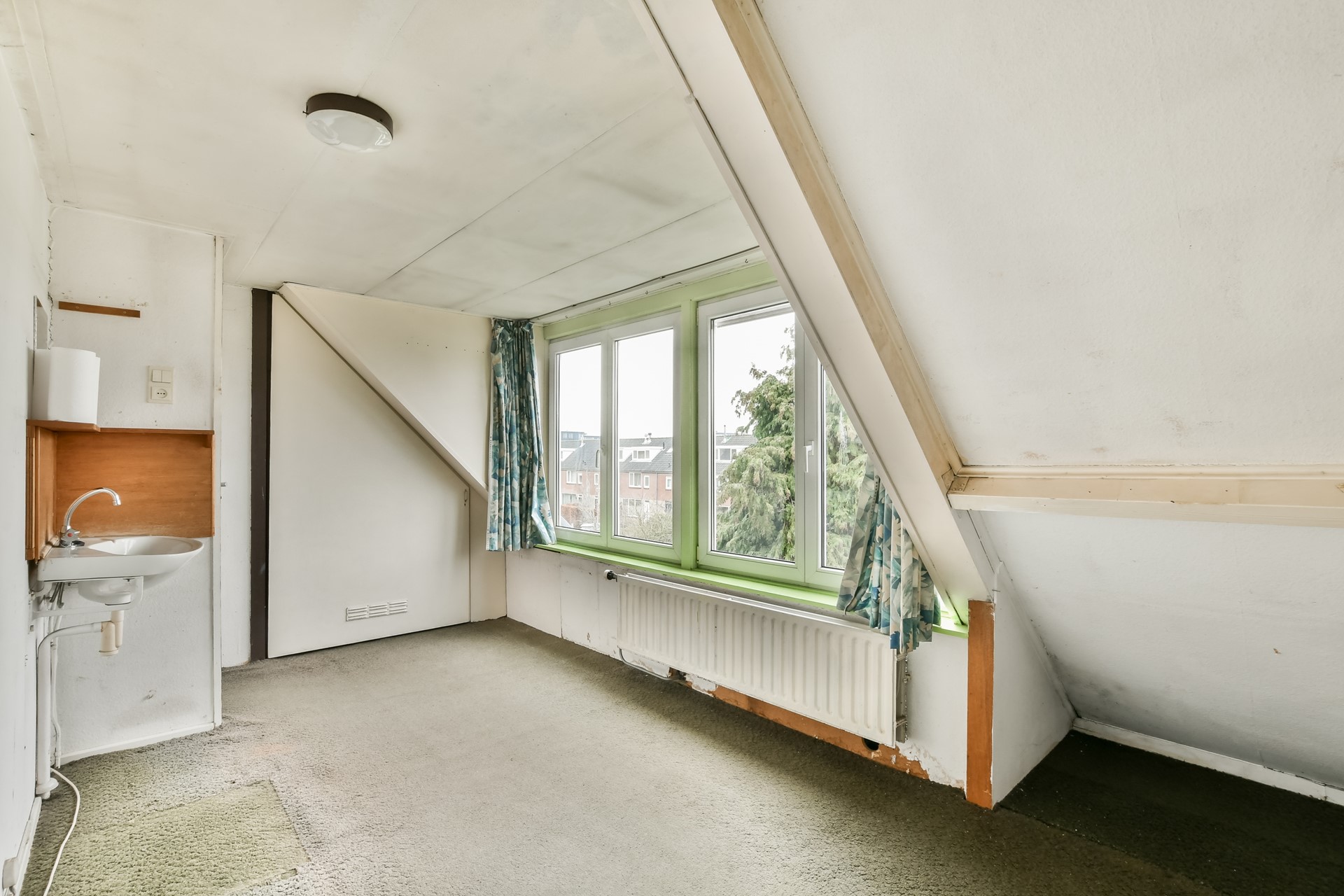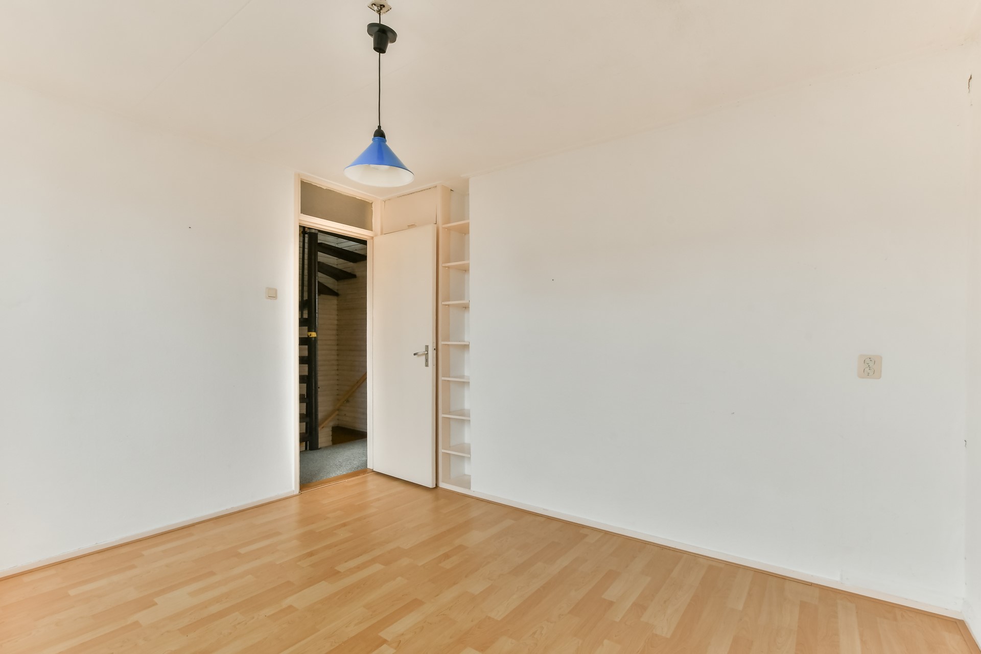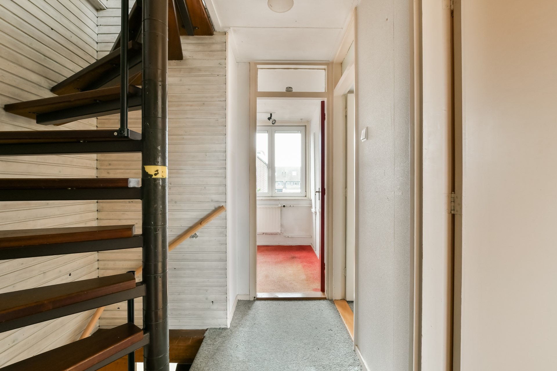 The spiral staircase leads to the landing. At the front is the bathroom with toilet, washbasin and shower. There is the possibility to enlarge the bathroom and modernise it to your own liking. On the street side is a spacious bedroom with built-in wardrobe. At the rear is the master bedroom with practical built-in wardrobe wall. There is also an extra room with built-in wardrobe, ideal as a children's room or study.