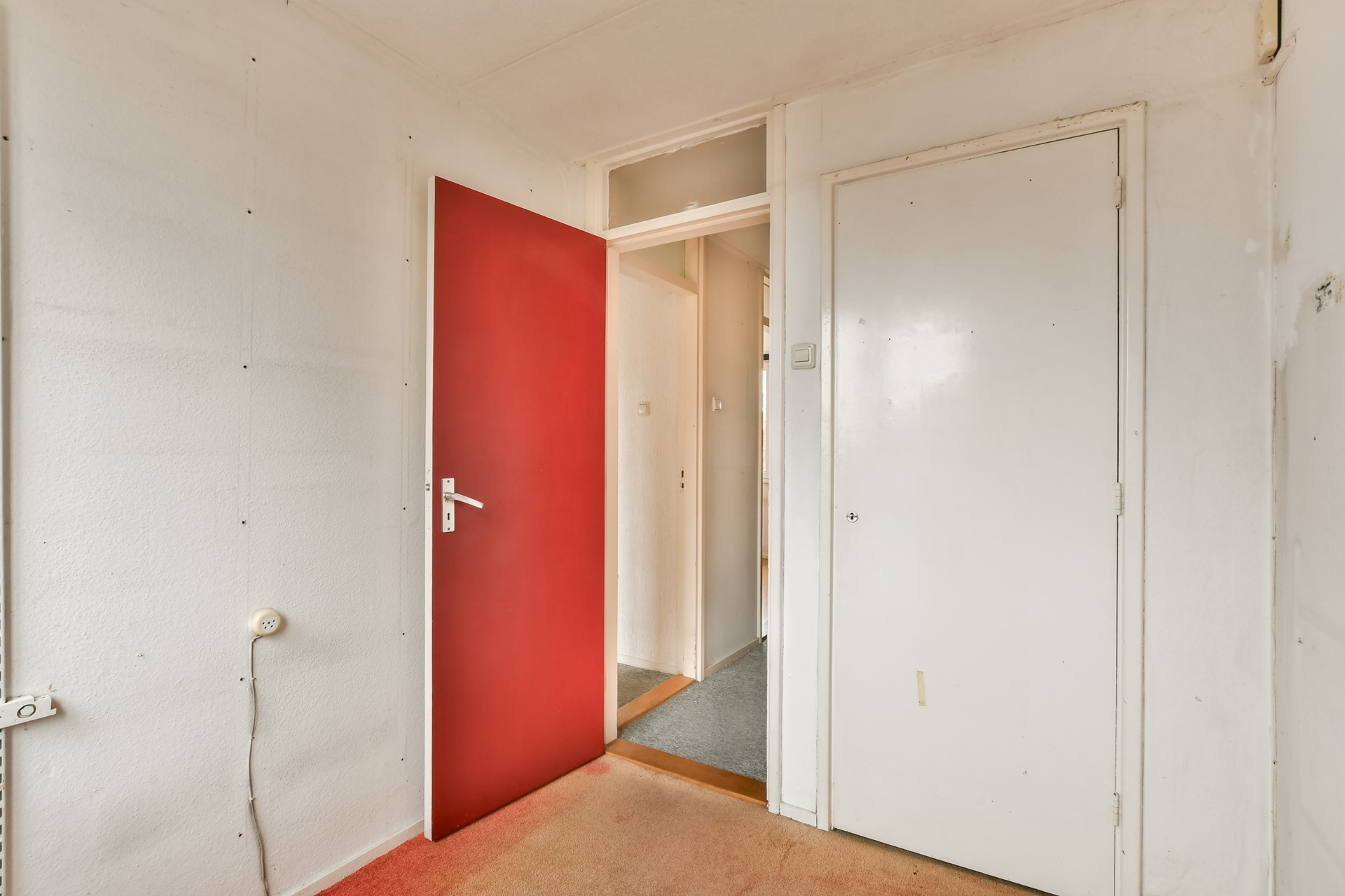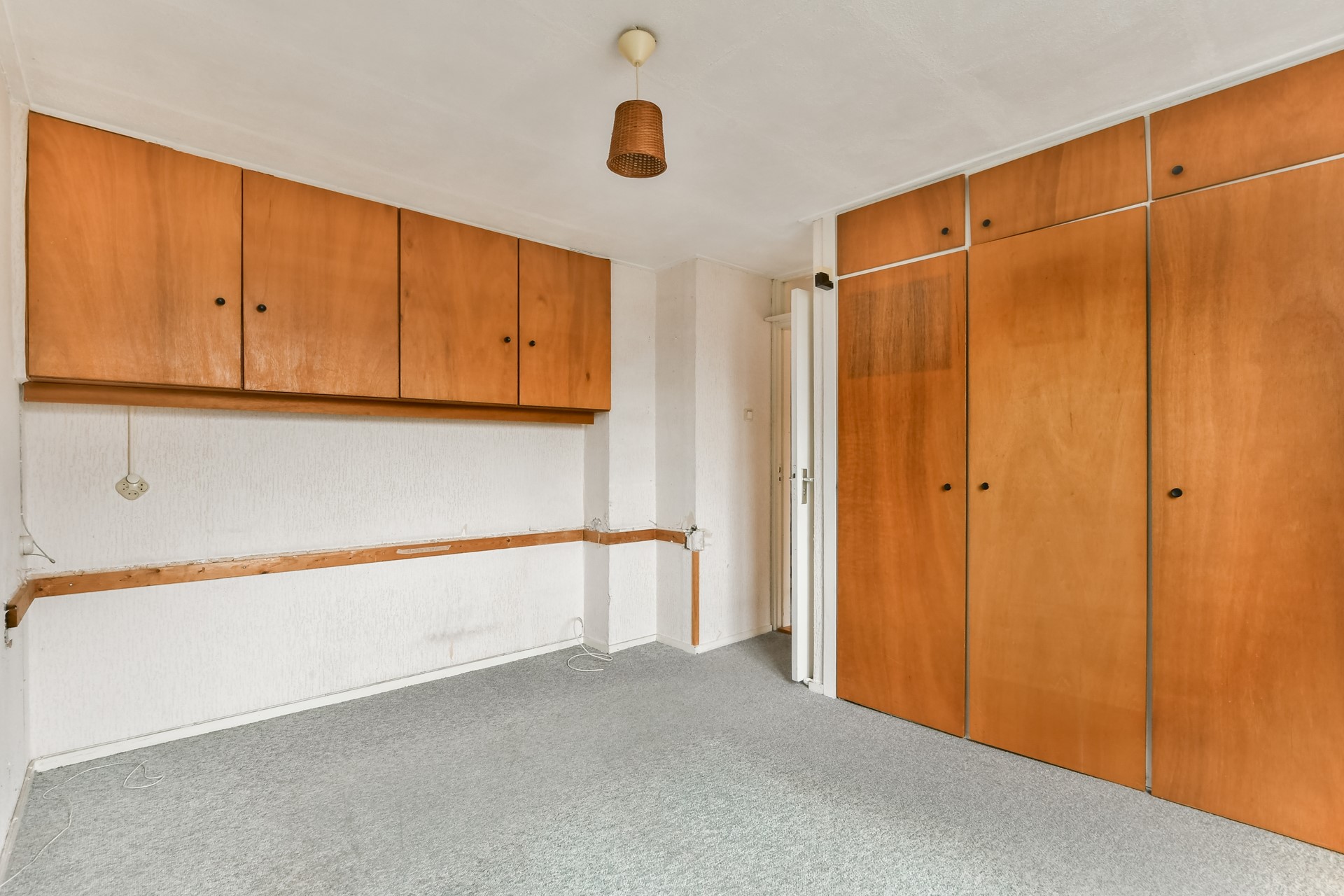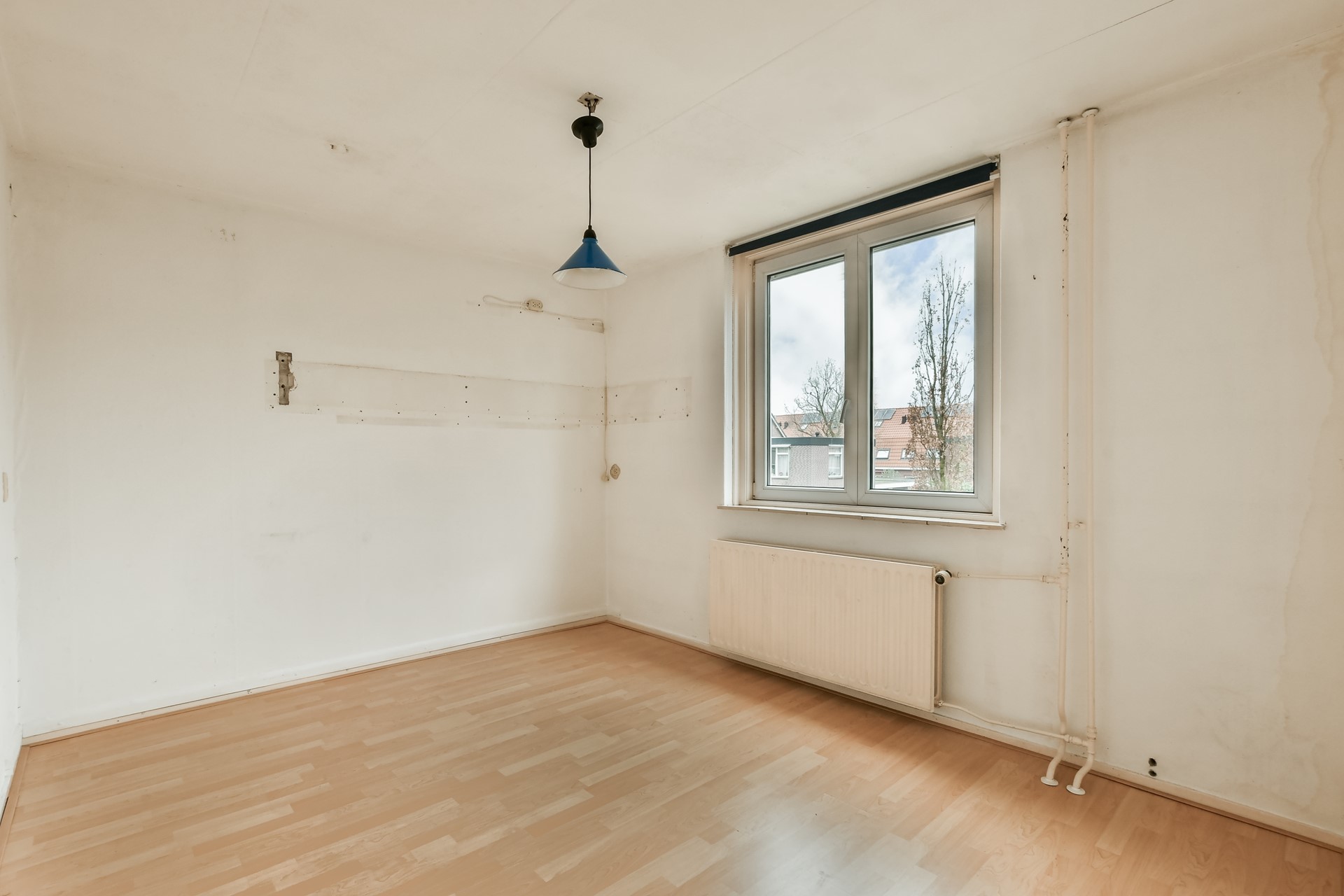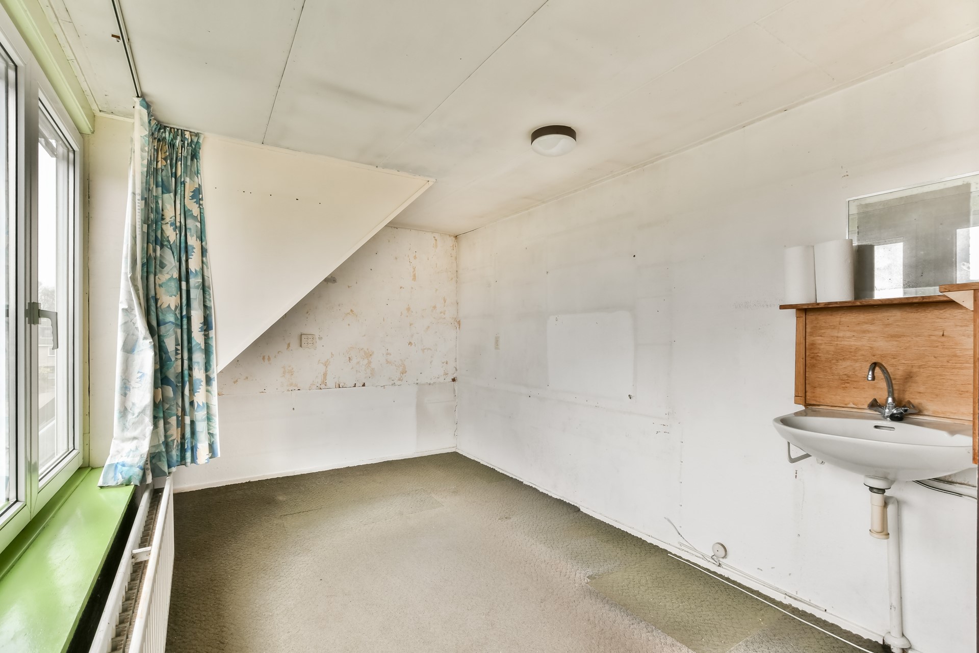 The spiral staircase leads to the landing. At the front is the bathroom with toilet, washbasin and shower. There is the possibility to enlarge the bathroom and modernise it to your own liking. On the street side is a spacious bedroom with built-in wardrobe. At the rear is the master bedroom with practical built-in wardrobe wall. There is also an extra room with built-in wardrobe, ideal as a children's room or study.