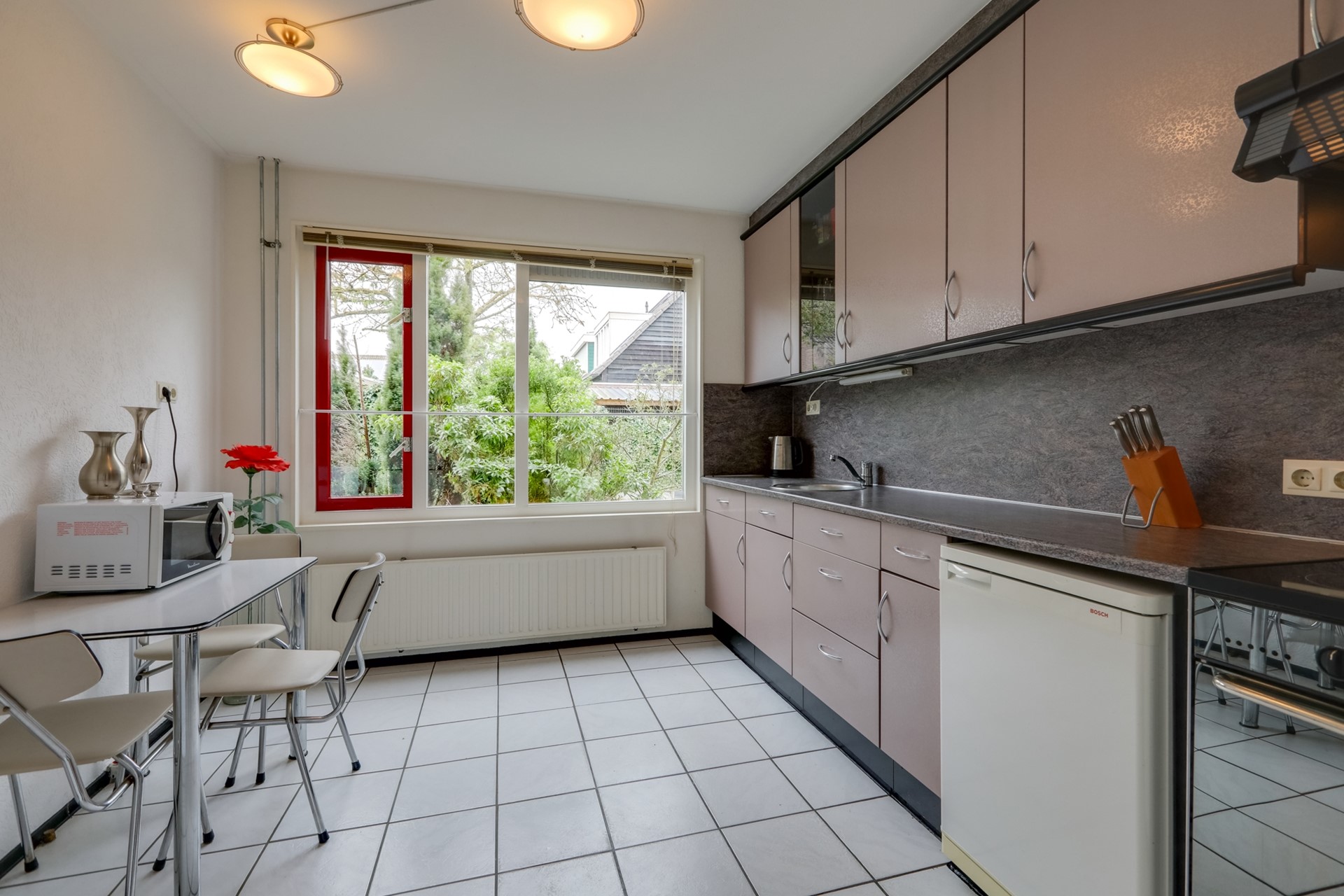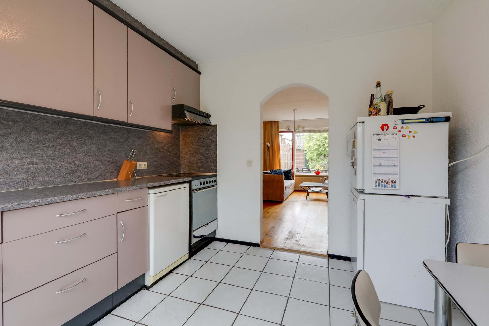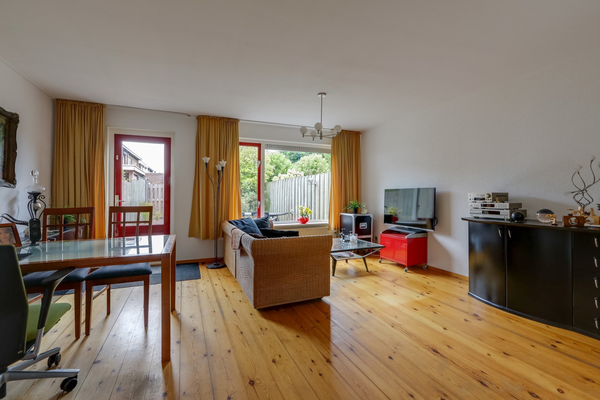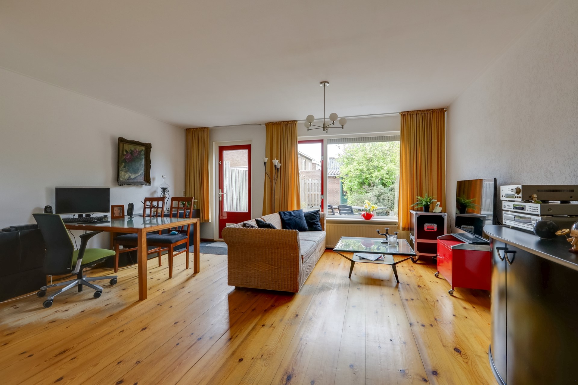Entree/hal met tegelvloer, toiletruimte, meterkast, opgang naar eerste verdieping en doorgang naar lichte woonkamer op het zuidoosten met trapkast, houtenvloer (grenen), tuindeur naar terras voorzien van zonnescherm en doorgang naar halfopen keuken met afzuigkap, kookplaat, oven en een losse koelkast.