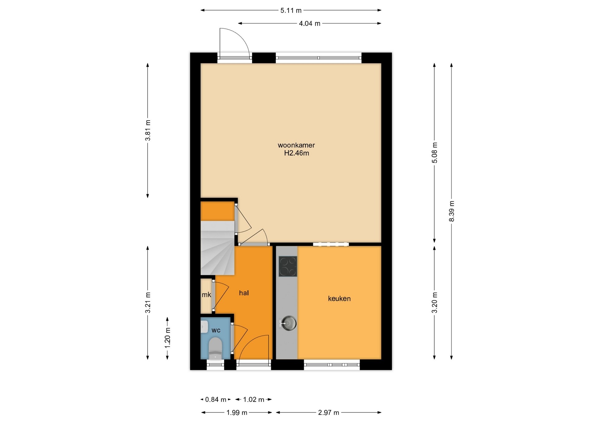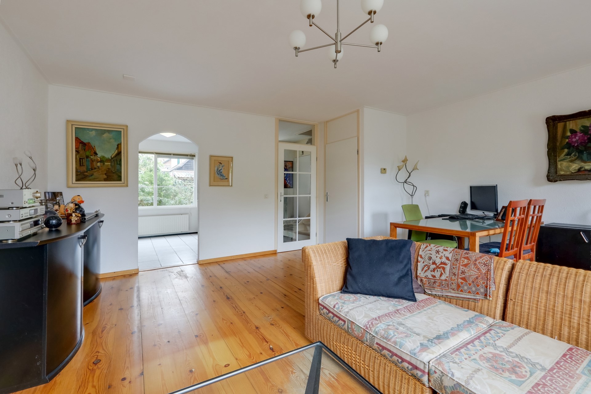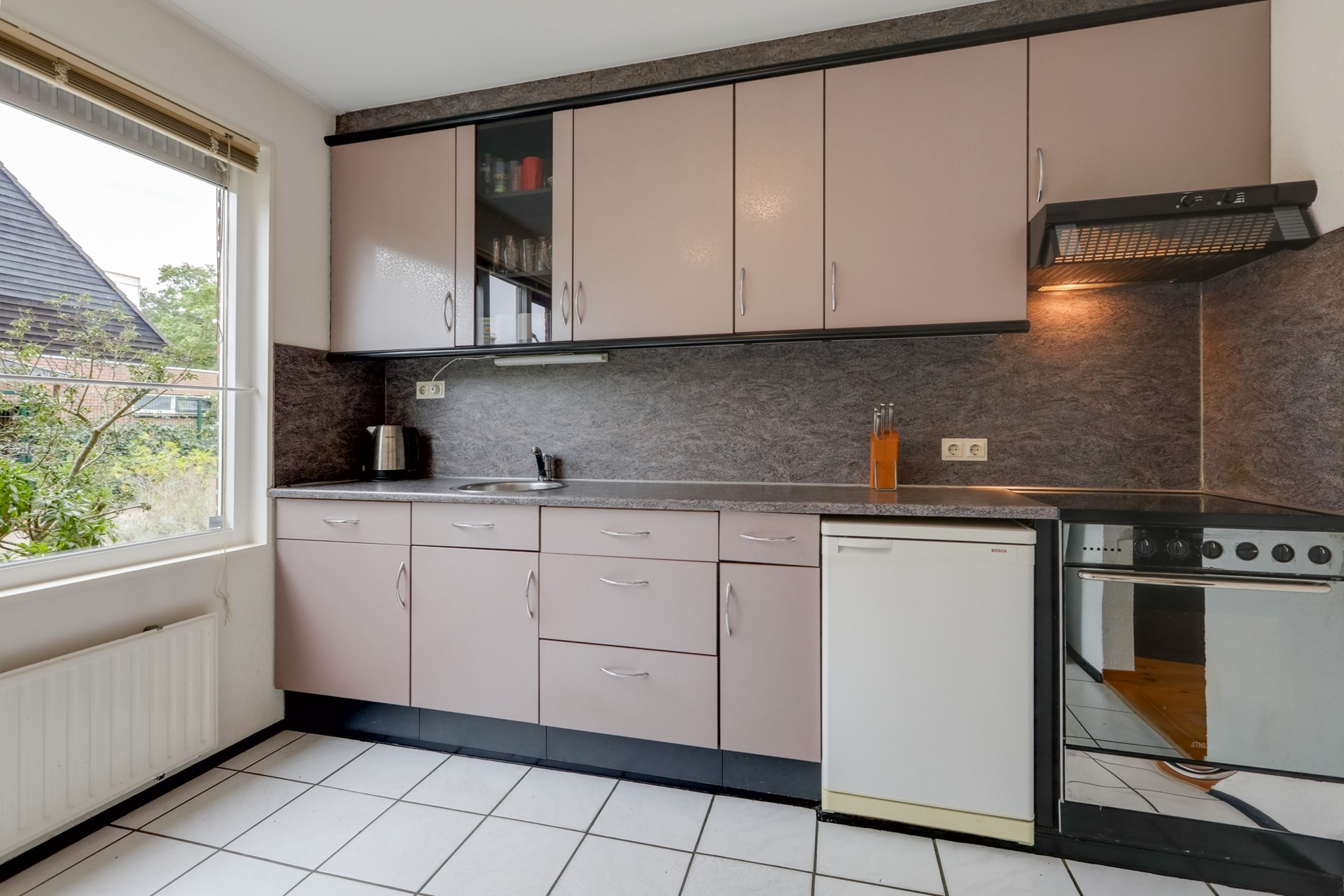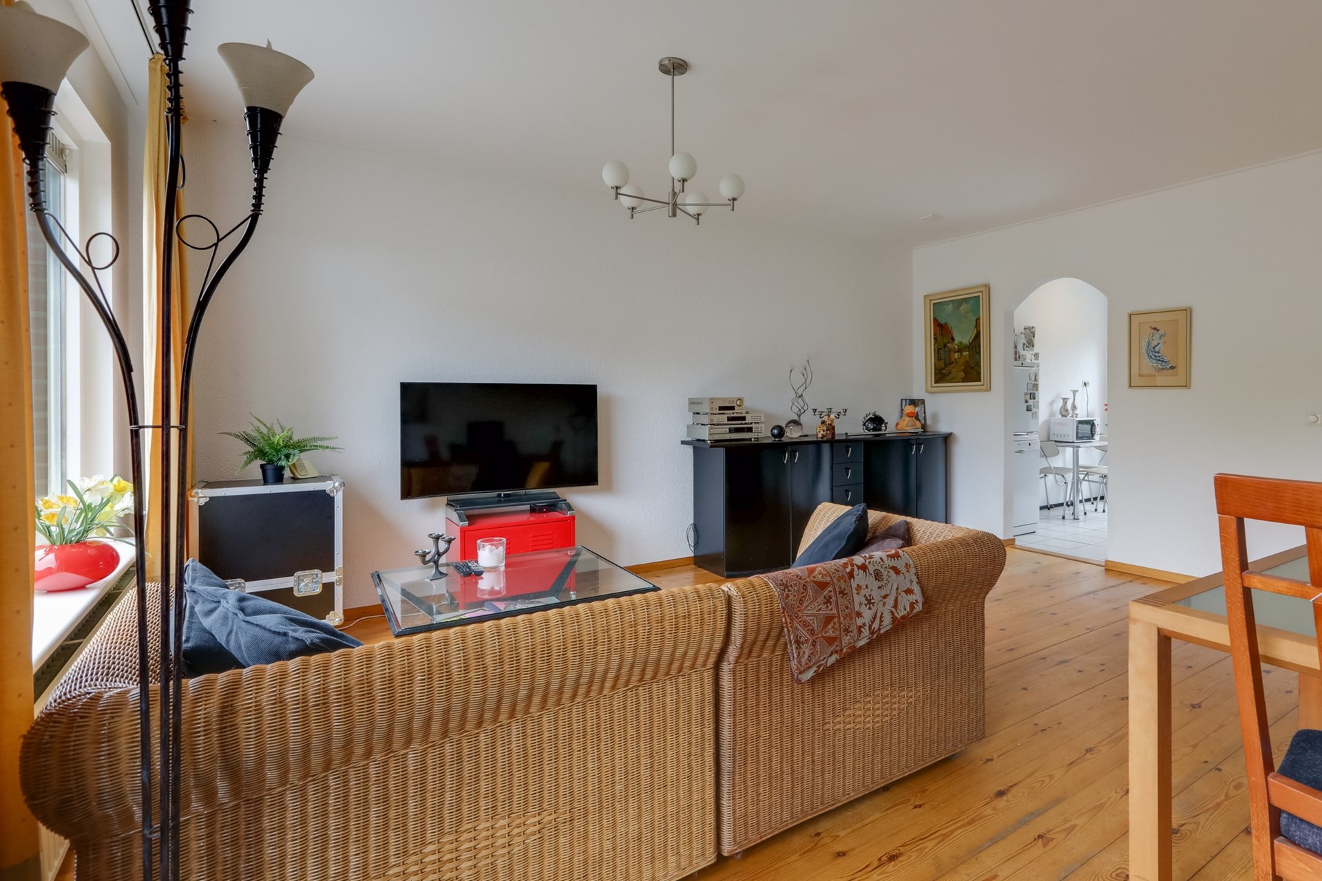 Entree/hal met tegelvloer, toiletruimte, meterkast, opgang naar eerste verdieping en doorgang naar lichte woonkamer op het zuidoosten met trapkast, houtenvloer (grenen), tuindeur naar terras voorzien van zonnescherm en doorgang naar halfopen keuken met afzuigkap, kookplaat, oven en een losse koelkast.