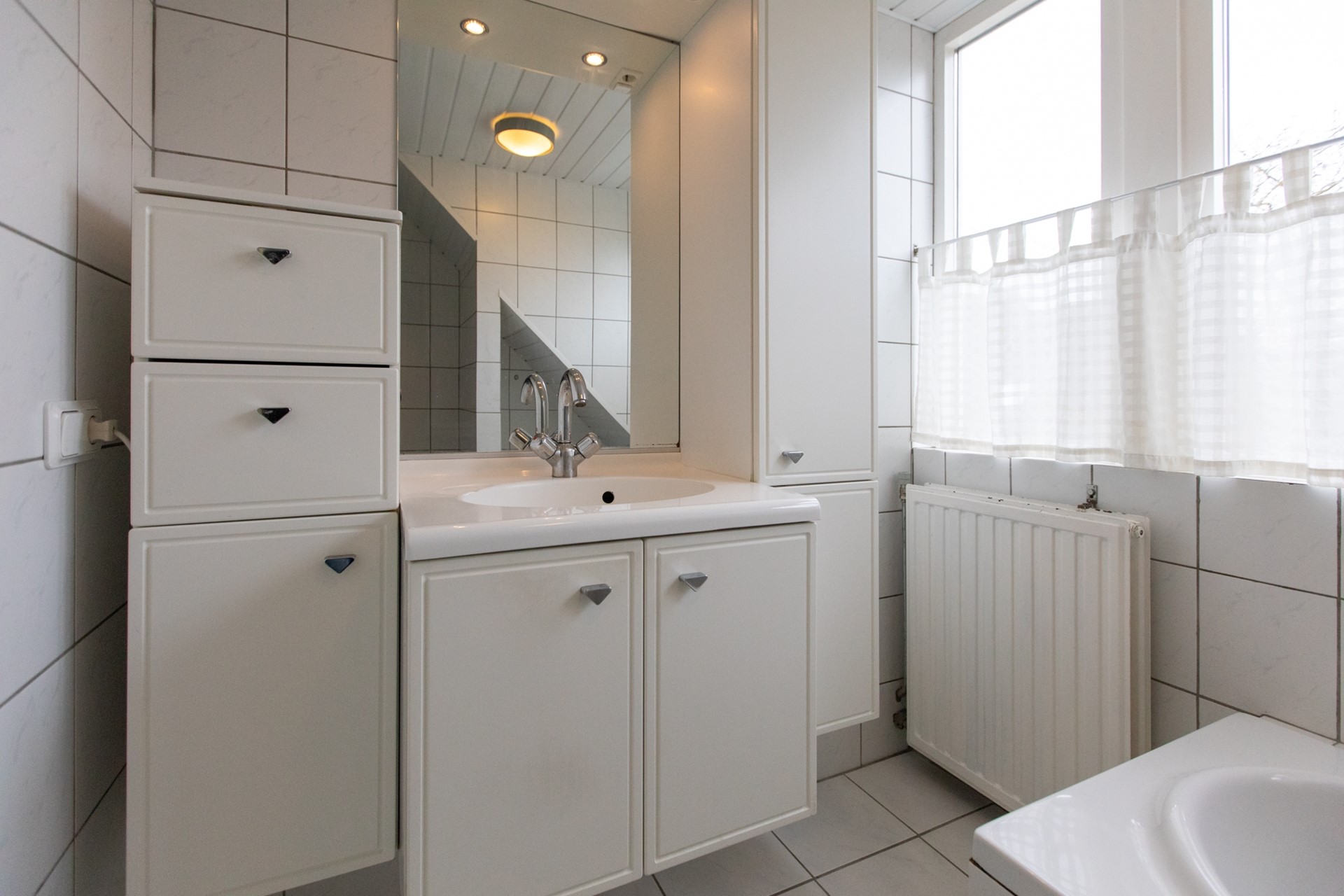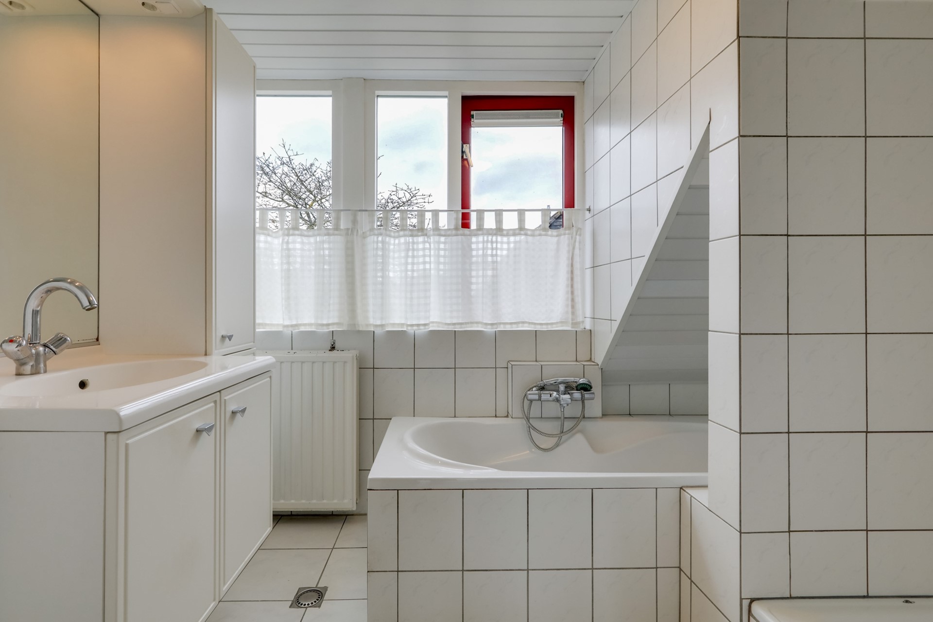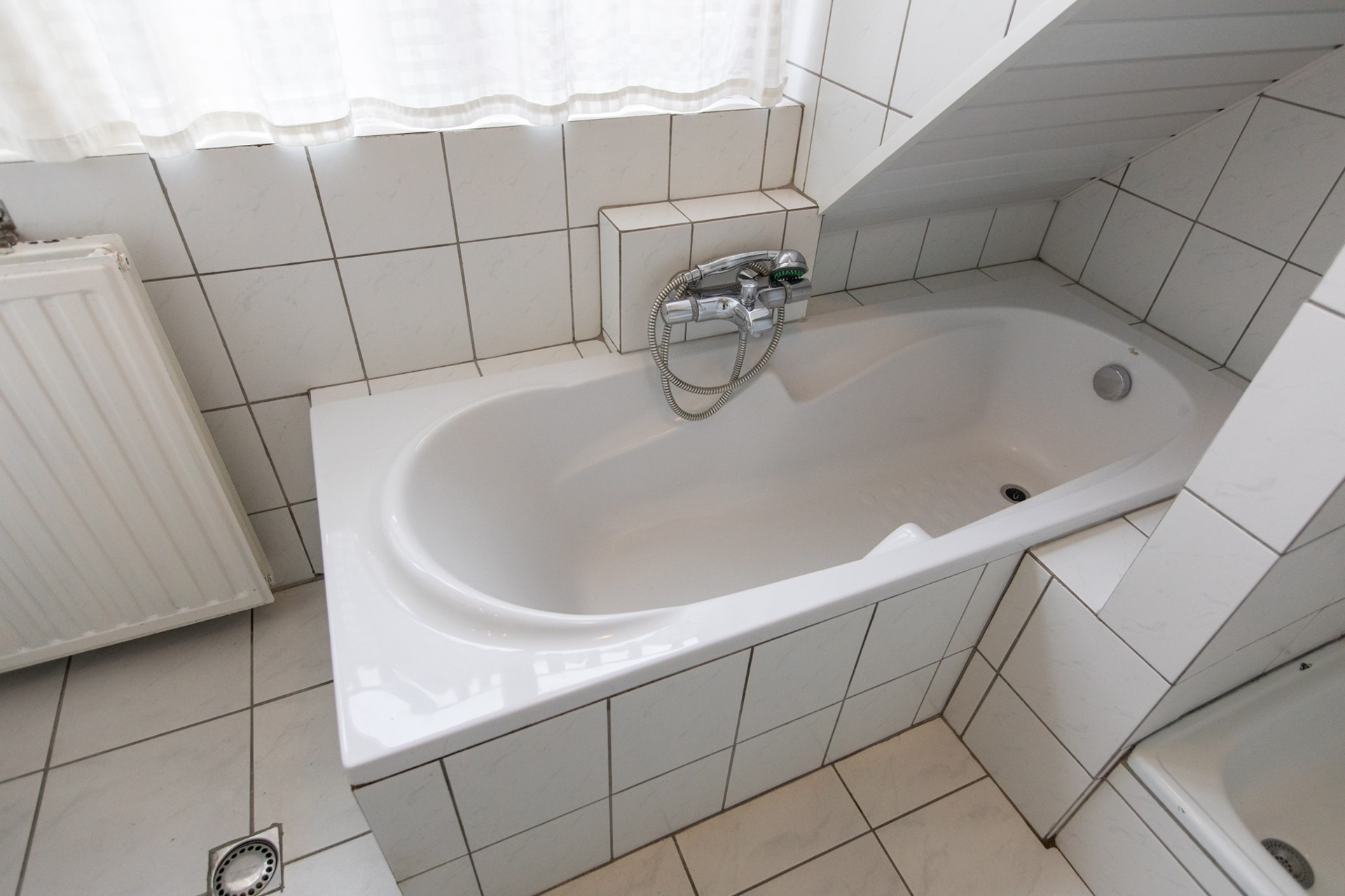 Overloop met laminaatvloer en daaraan gelegen een volledig betegelde badkamer voorzien van een douche, ligbad, wastafelmeubel en radiator.