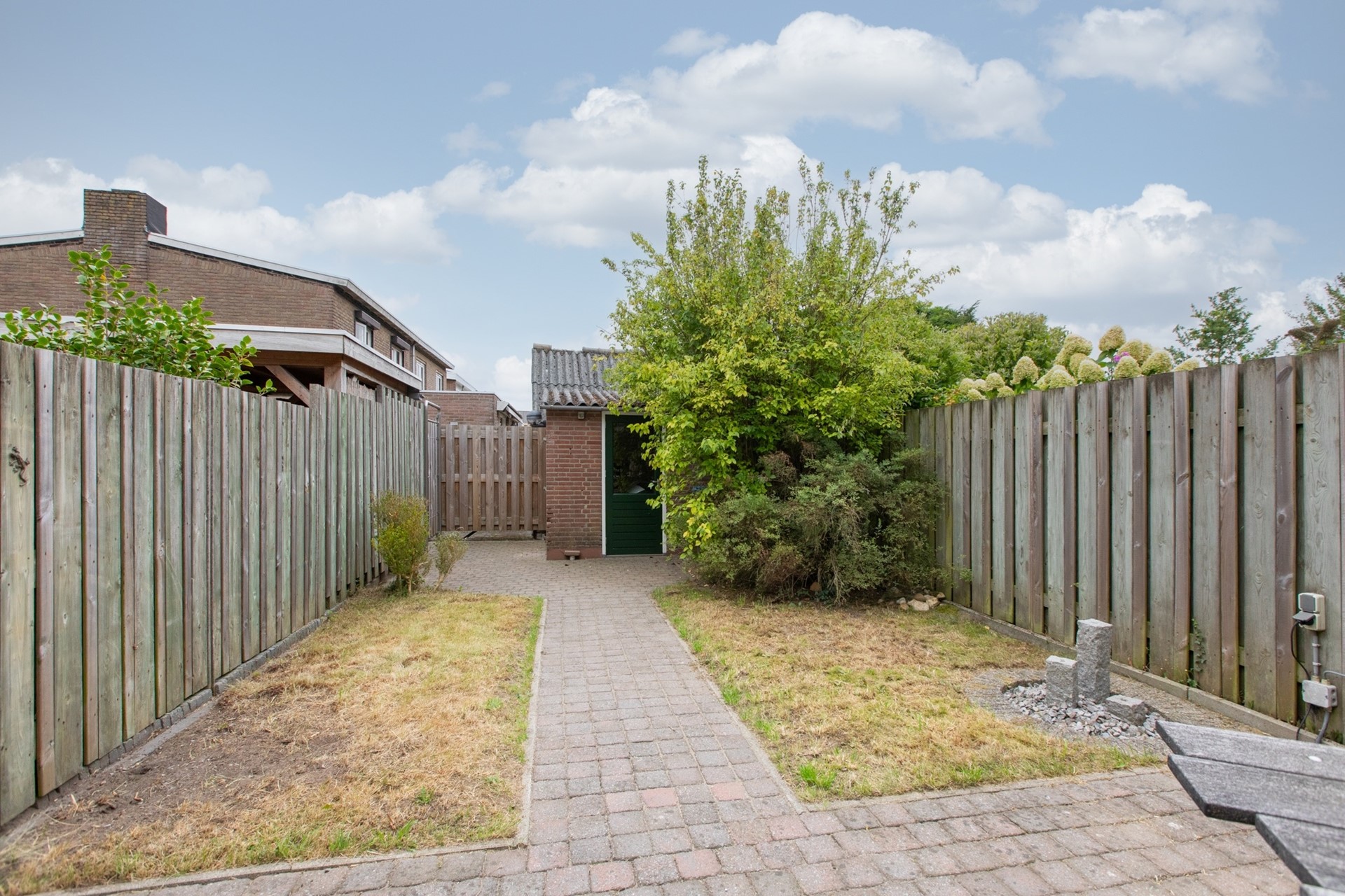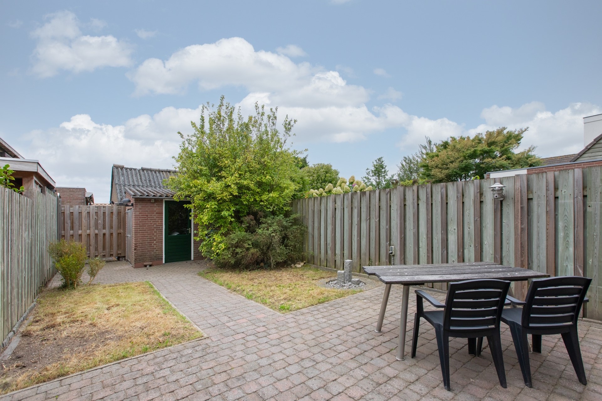 De achtertuin (5,5 m. breed x 12 m diep)is gelegen op het zuidoosten en voorzien van gazon, terras (cobblestones), houten erfafscheidingen, vrijstaande stenen berging en een achterom.