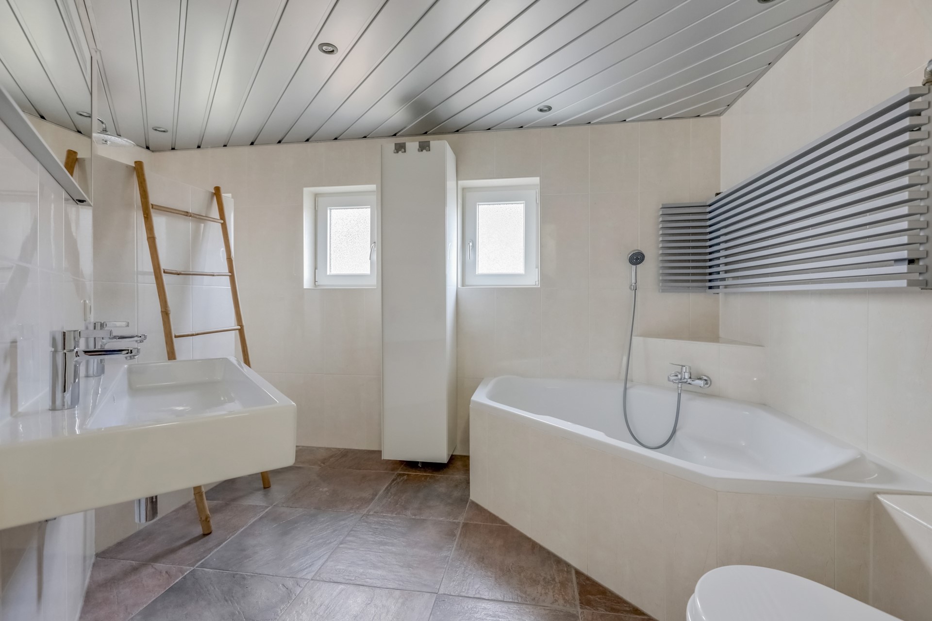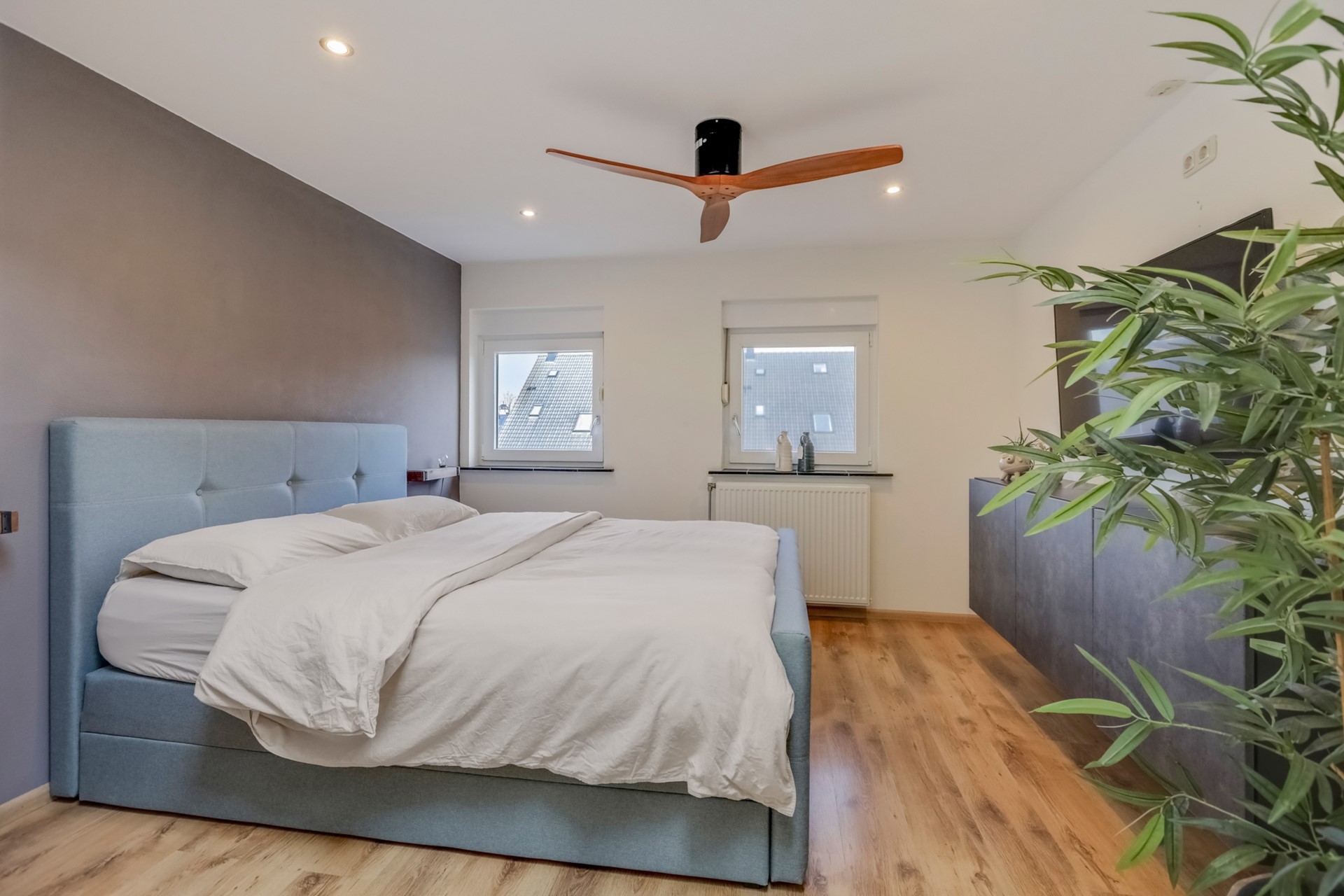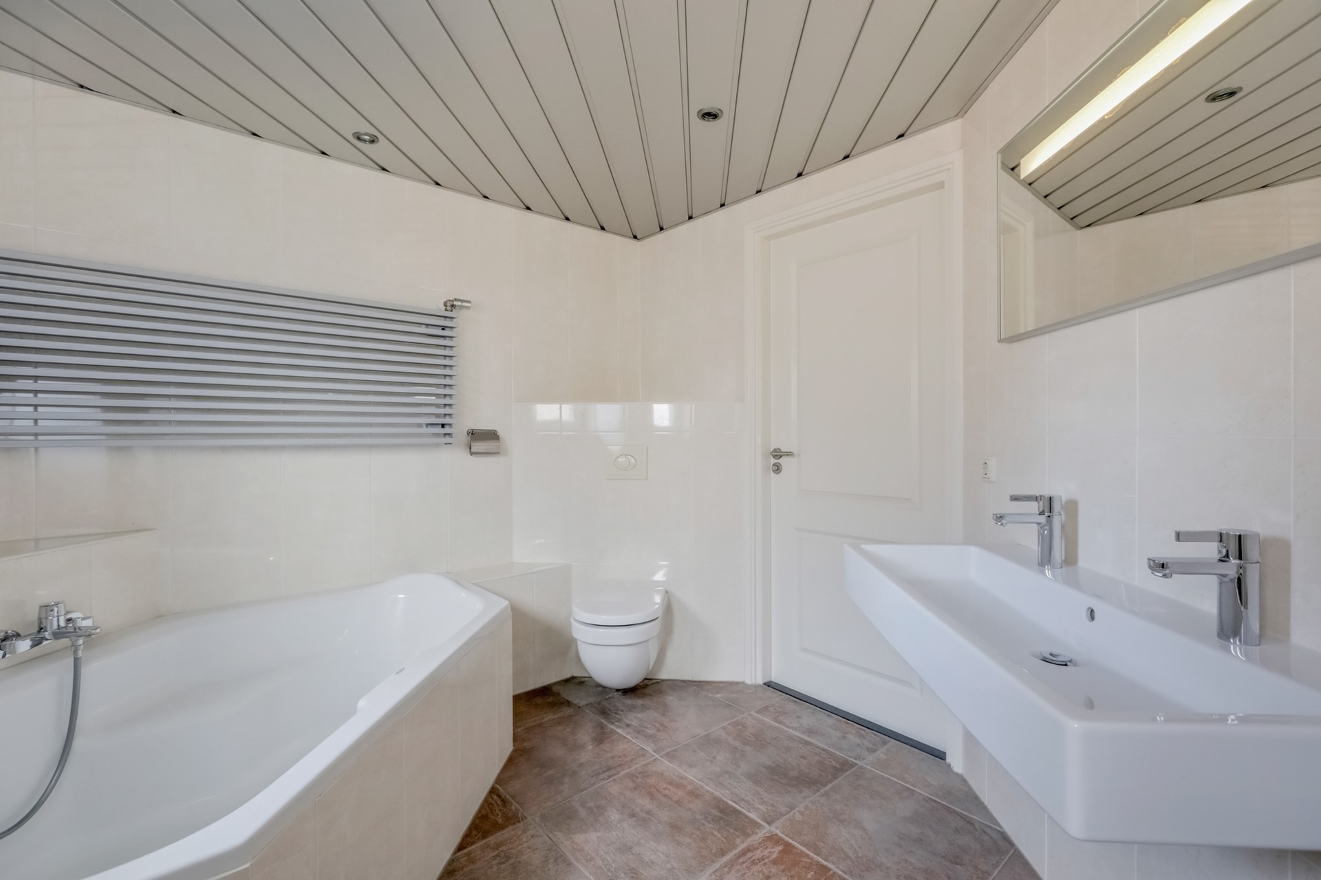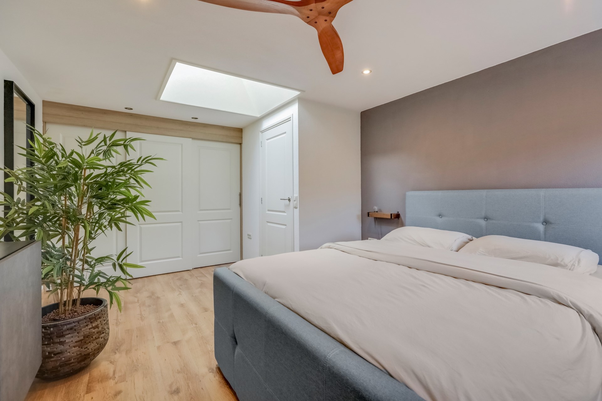 Op de eerste verdieping bevinden zich drie slaapkamers en de badkamer. De slaapkamers hebben allen een goed formaat van circa 10 m², 12 m² en de ouderslaapkamer van zelfs 18 m² die bovendien is voorzien van een inbouwkast. De badkamer (8 m²) is uitgerust met een wastafel, inloopdouche, ligbad, vloerverwarming, designradiator en een tweede toilet. De raamkozijnen op de verdieping bestaan uit kunststof draai-kiep ramen met rolluiken. Via een vlizotrap is de bergzolder bereikbaar waar zich de cv-combiketel (Nefit combiketel, bouwjaar 2015) bevindt.