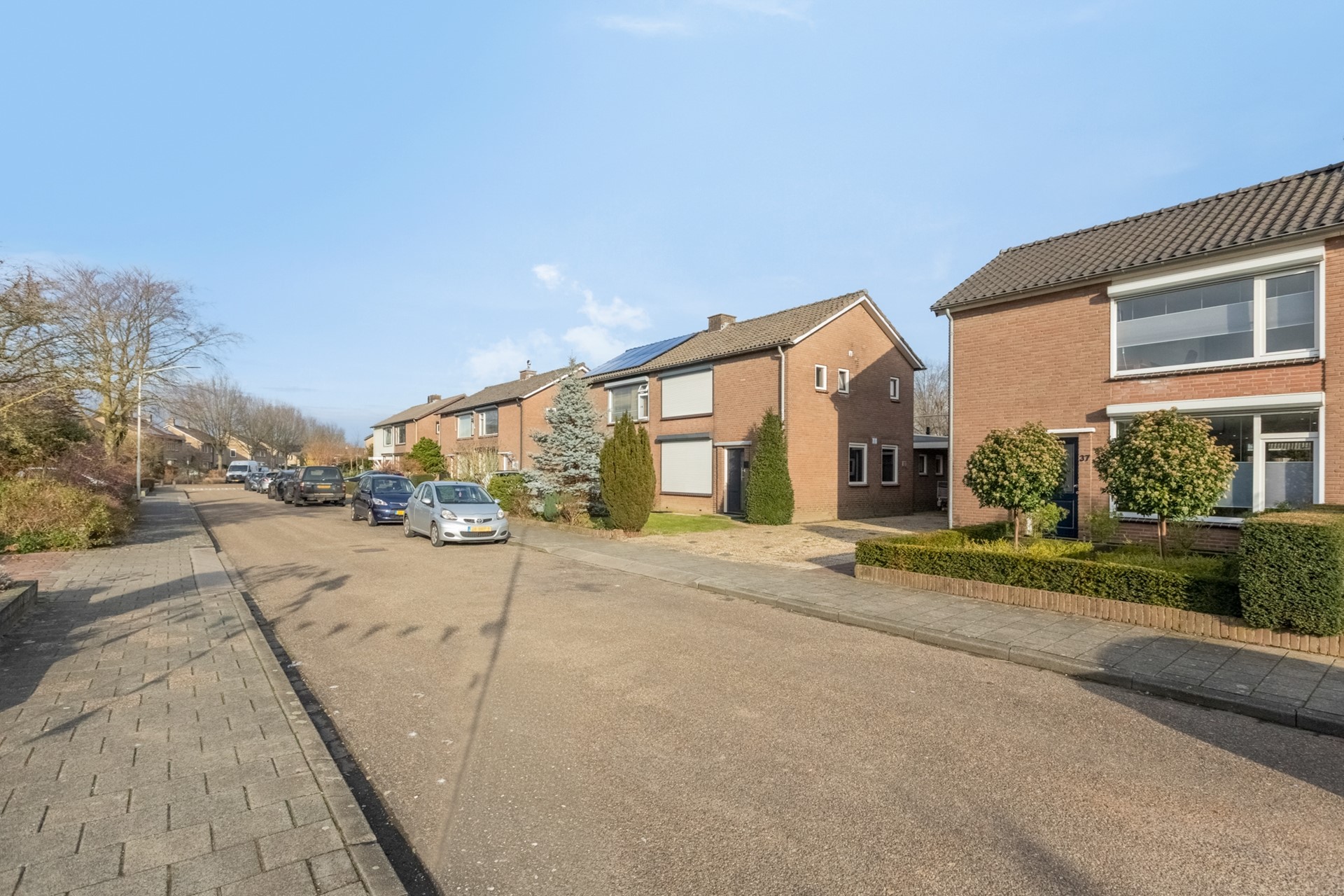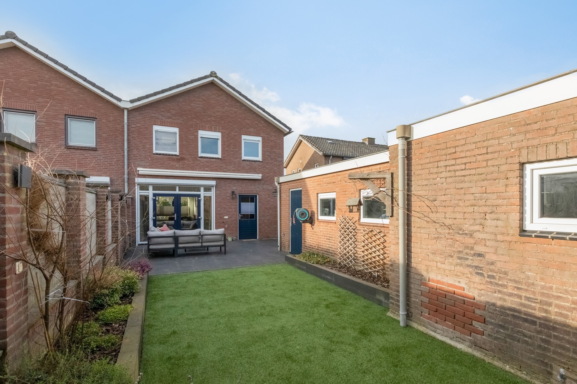 Via een openslaande houten poort is de achtertuin bereikbaar waar zich ook de garage van 53 m² met een pulspomp bevindt. Deze garage is ideaal als stallingsruimte maar biedt ook volop mogelijkheden als hobby- of werkplaats. De verzorgde achtertuin ligt op het oosten en beschikt over een overkapping, kunstgras, borders met beplanting en een ruim terras dat zich uitstrekt bij de openslaande tuindeuren van de woonkamer. De mooie groene voortuin is keurig aangelegd en de inrit biedt voldoende ruimte om eigen auto’s op eigen terrein te parkeren.