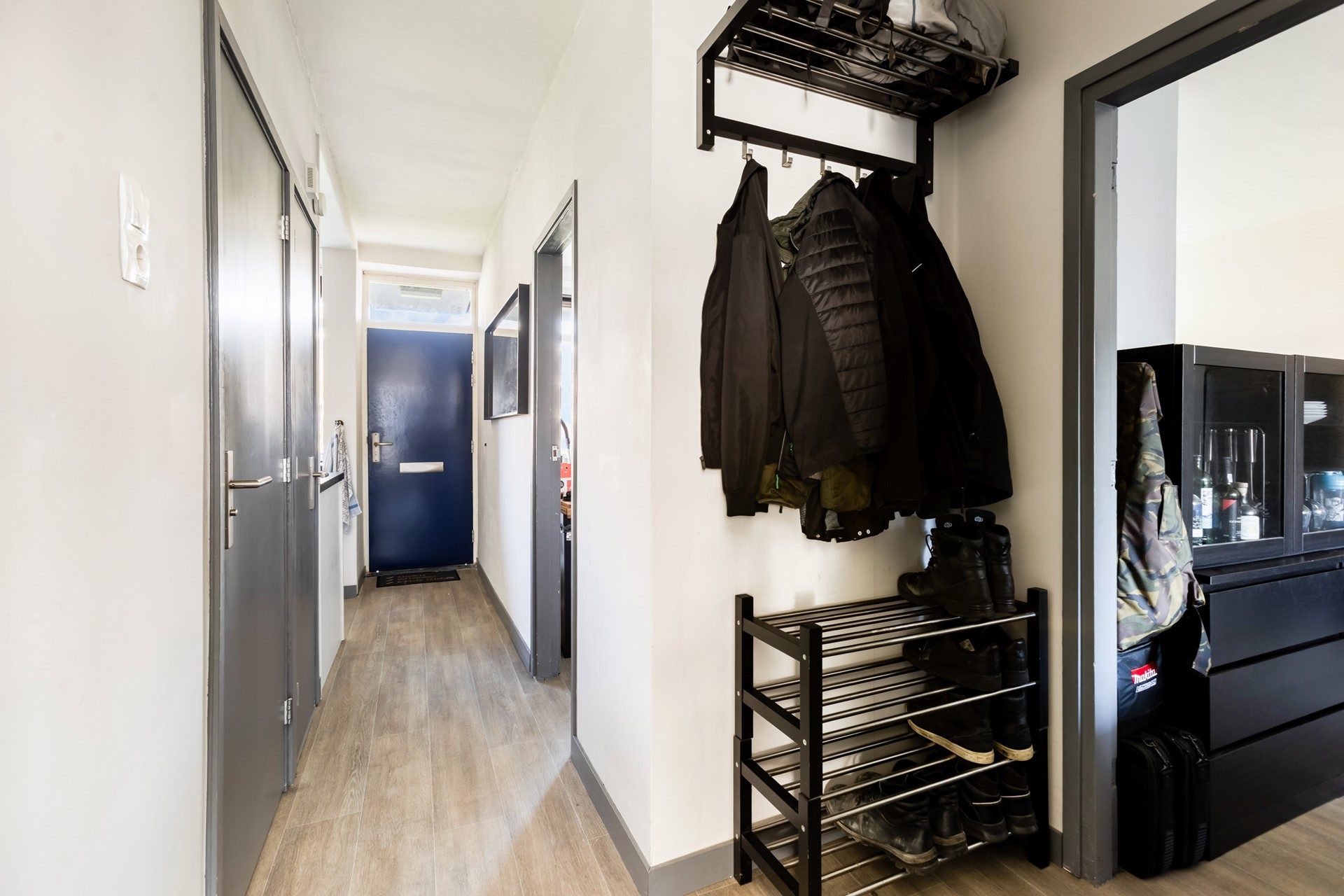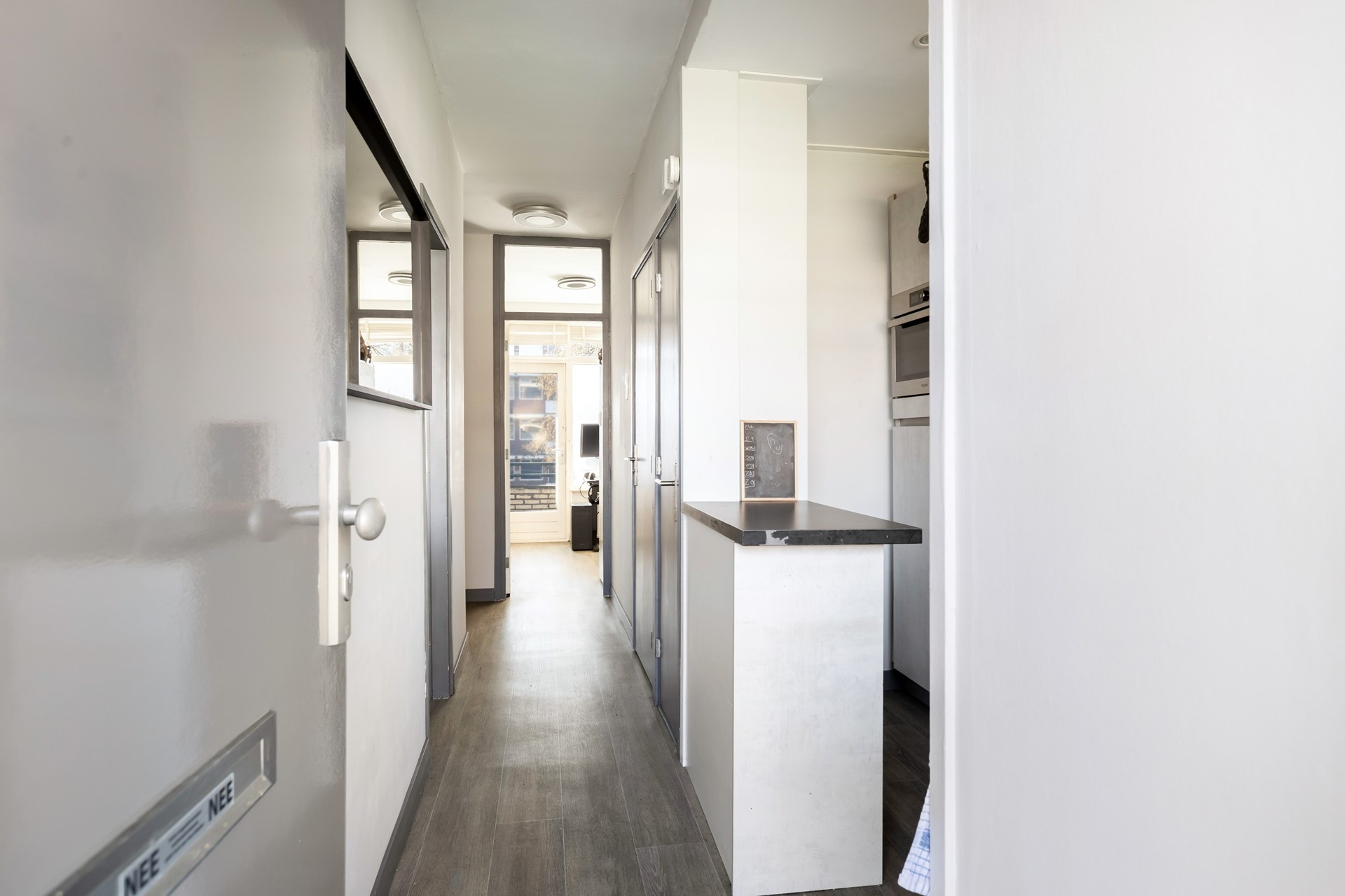 Bij binnenkomst komt u in de centrale hal die toegang biedt tot vrijwel alle vertrekken van de woning. De hal staat aan de rechterzijde in open verbinding met de keuken, wat zorgt voor een ruimtelijk gevoel. Vanuit hier bereikt u tevens de badkamer, twee slaapkamers en de woonkamer.