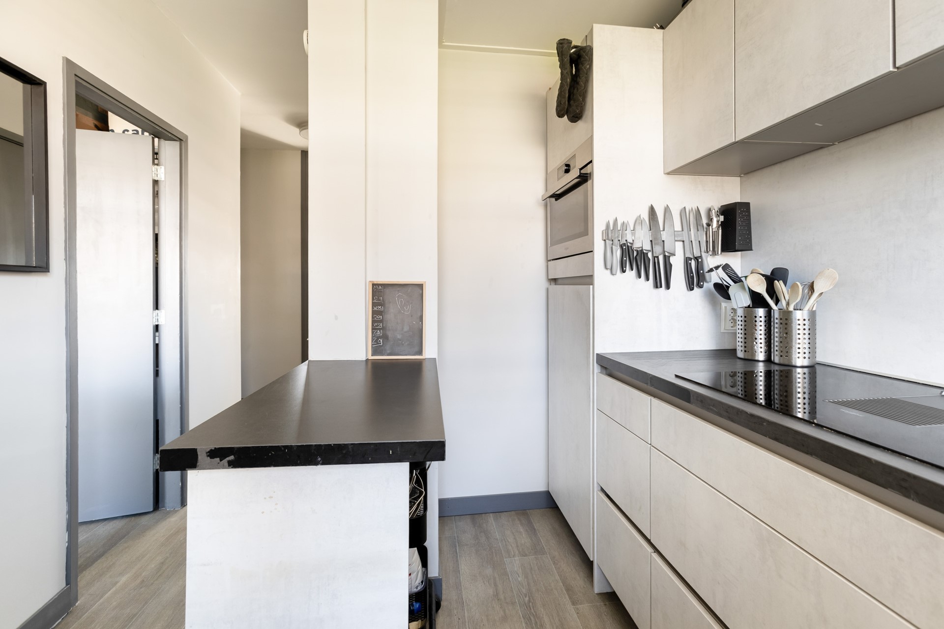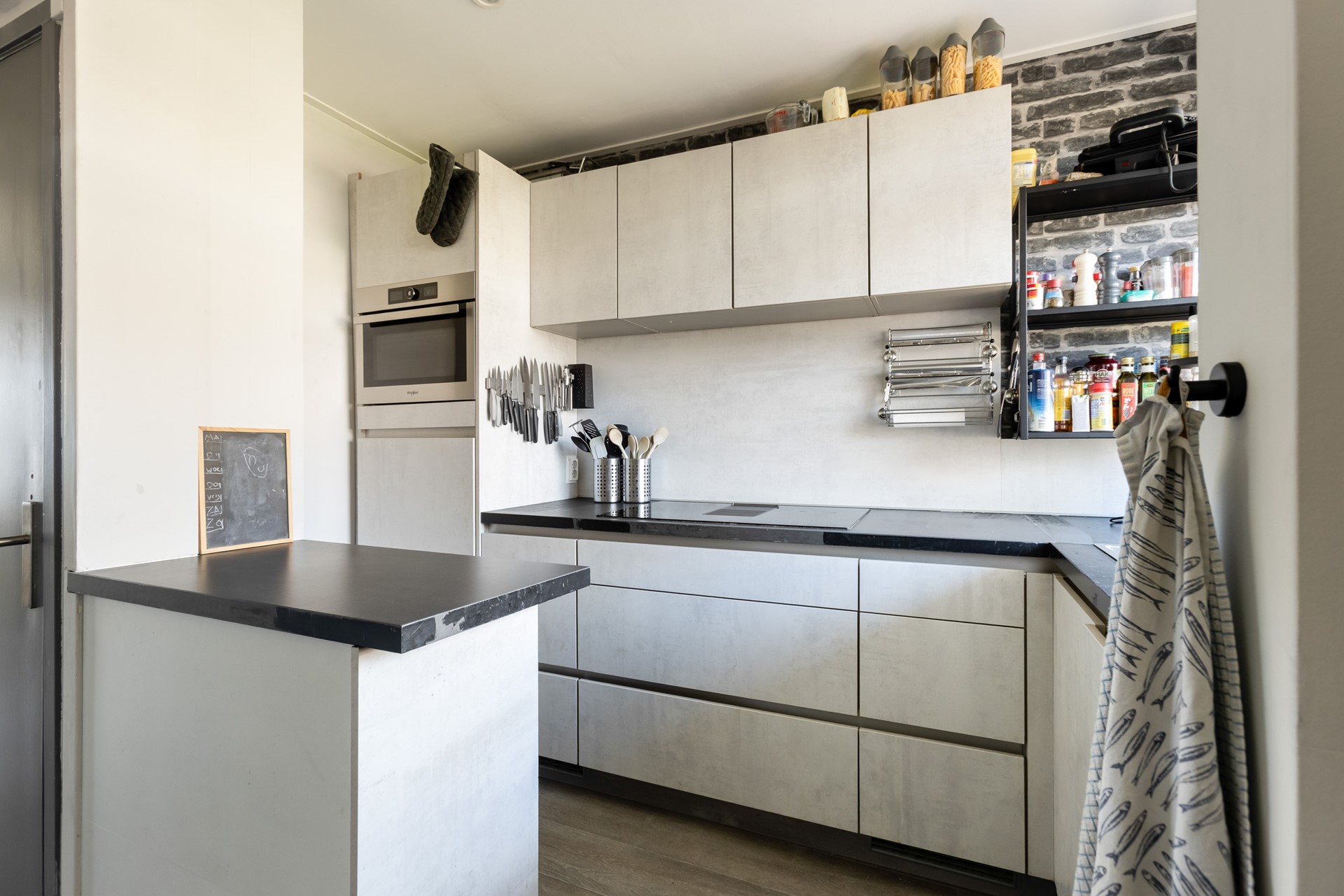 De open keuken is in 2020 vernieuwd en uitgevoerd in een moderne, witte greeploze opstelling met een stijlvol antraciet werkblad. De keuken is voorzien van diverse inbouwapparatuur van Whirlpool, waaronder een inductiekookplaat met geïntegreerde afzuiging, een combi-oven/magnetron, vaatwasser en voldoende kastruimte. Verder is er een doorstroomboiler met krachtstroom in 2020 geplaatst. Hierdoor beschikt u over een eigentijdse en complete keuken die van alle gemakken is voorzien.