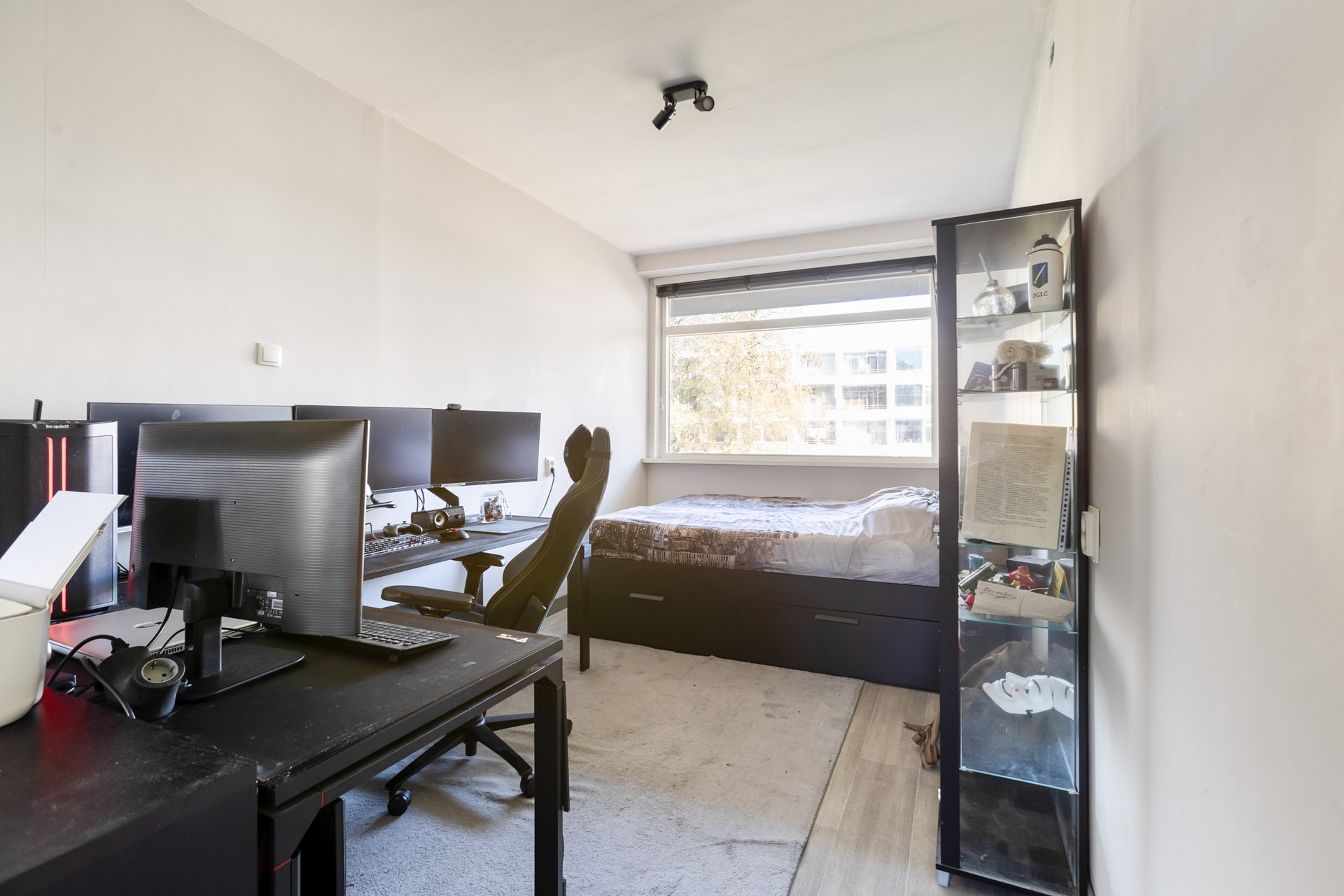 De slaapkamer aan de voorzijde van de woning en beschikt over een wasmachineaansluiting.