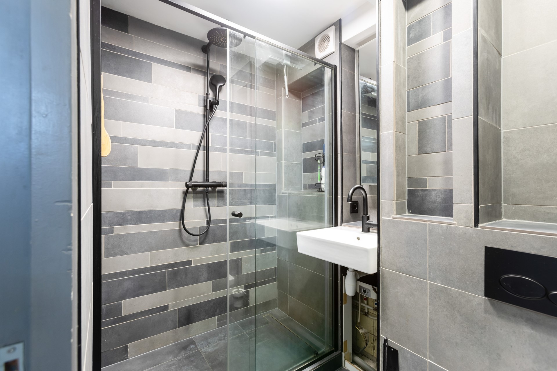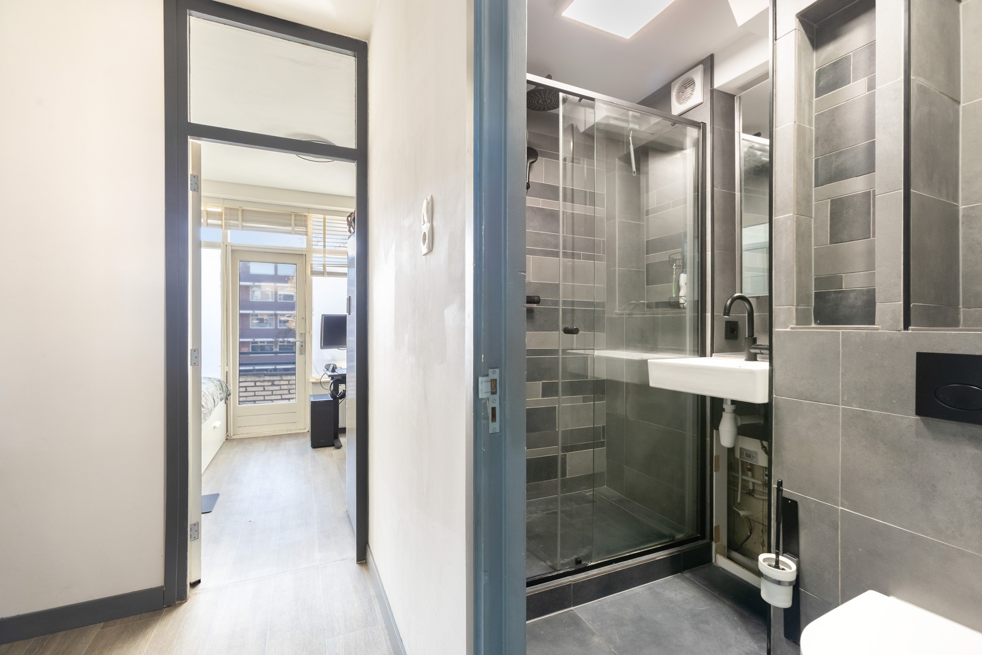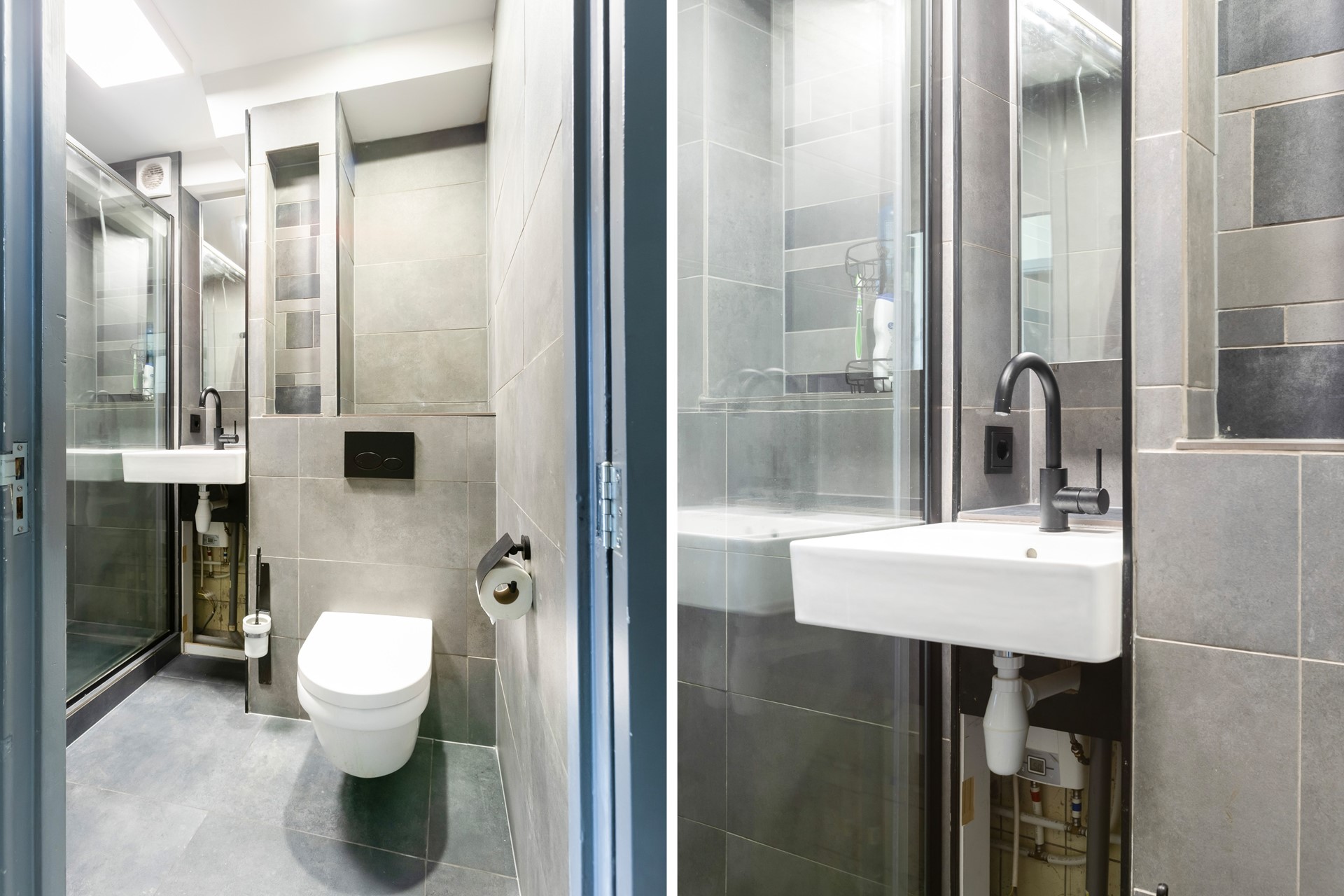 De moderne badkamer (2020) is volledig betegeld met grijze vloer- en wandtegels en beschikt over een inloopdouche, inbouwtoilet en een wastafel. Een strak en eigentijds geheel met een verzorgde uitstraling.