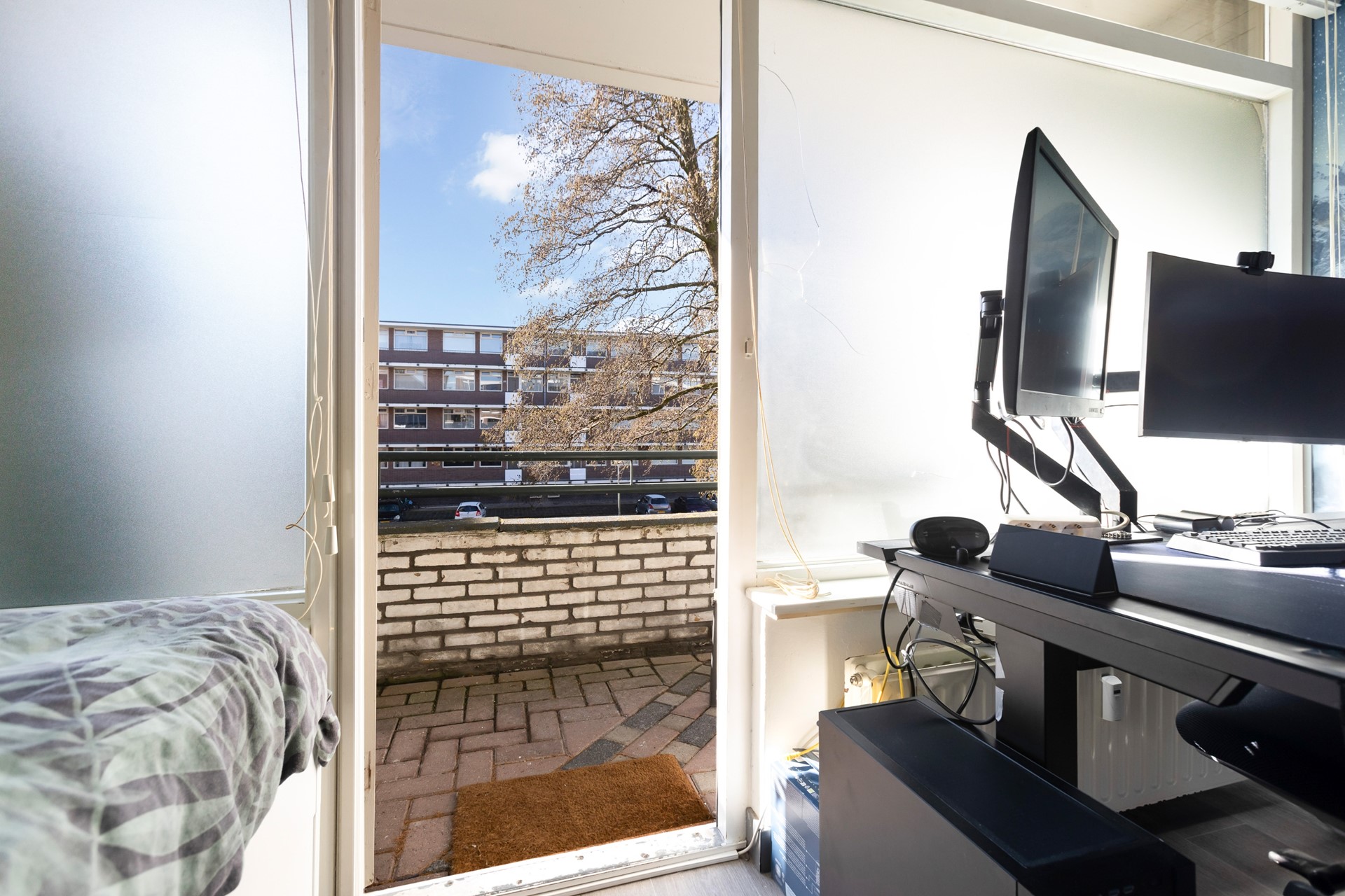 De slaapkamer aan de achterzijde biedt toegang tot het balkon, gelegen op het zuidwesten. Hier kunt u heerlijk genieten van de middag- en avondzon.