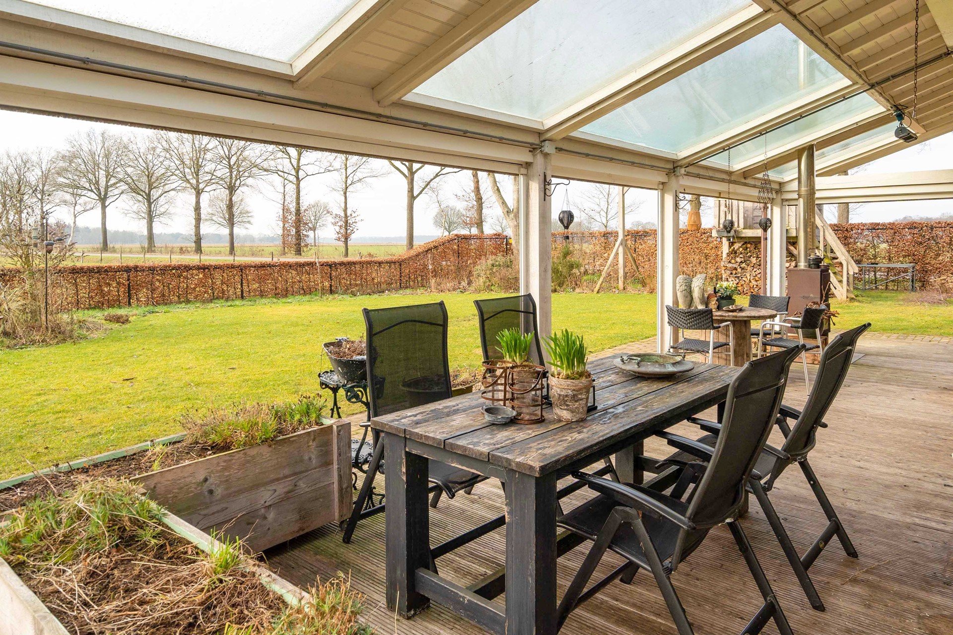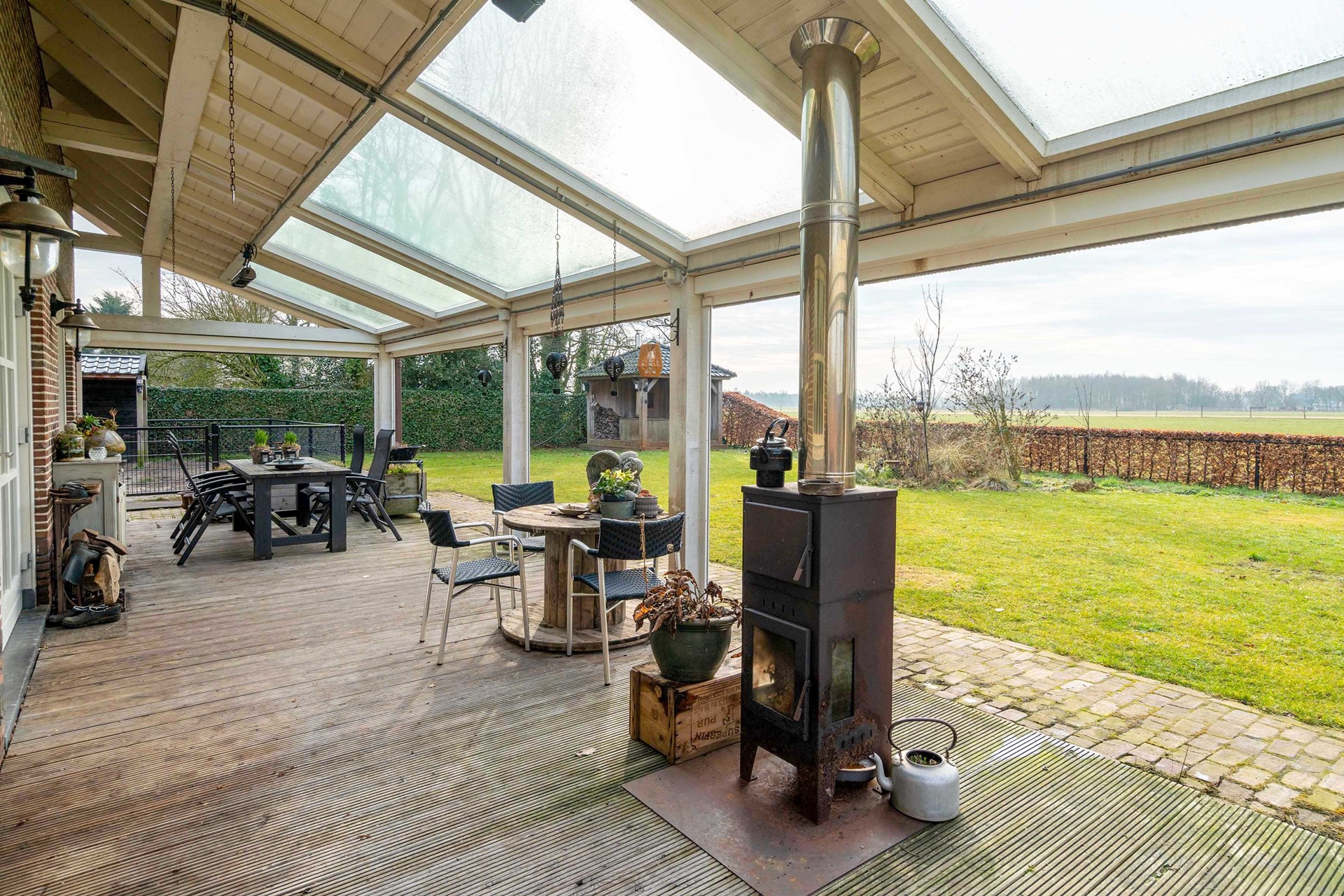 * Overdekt terras met houtkachel