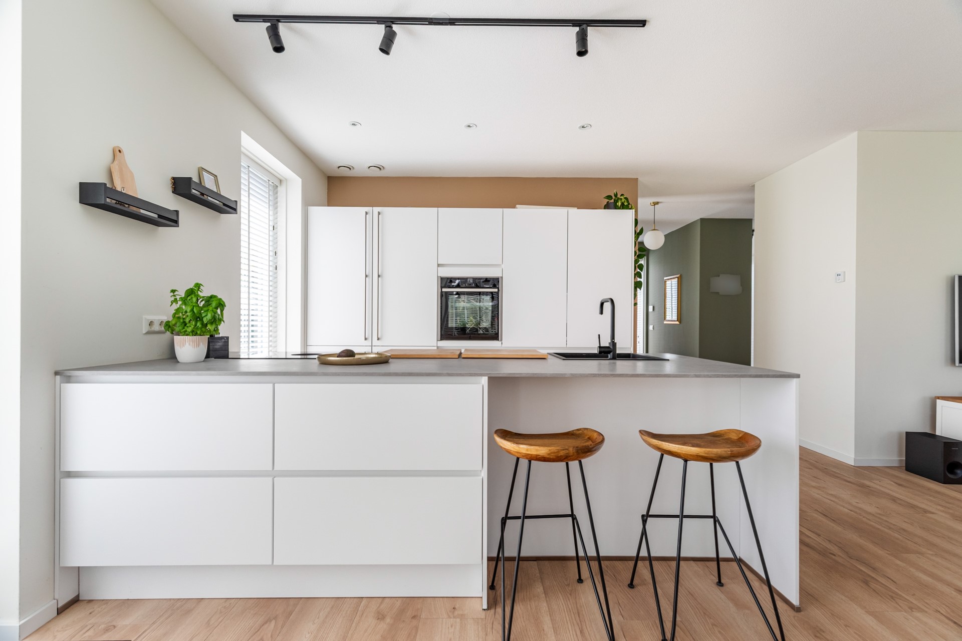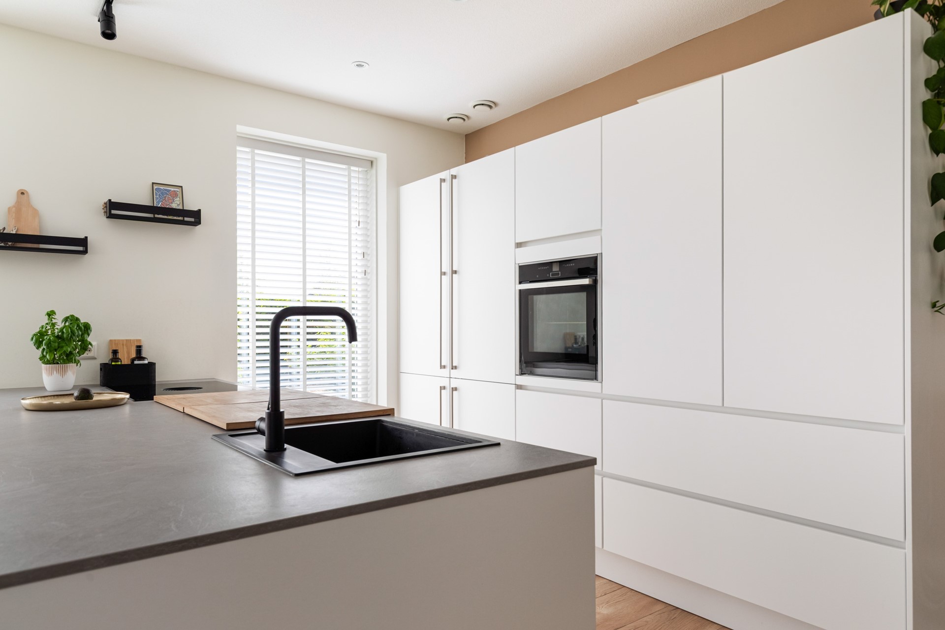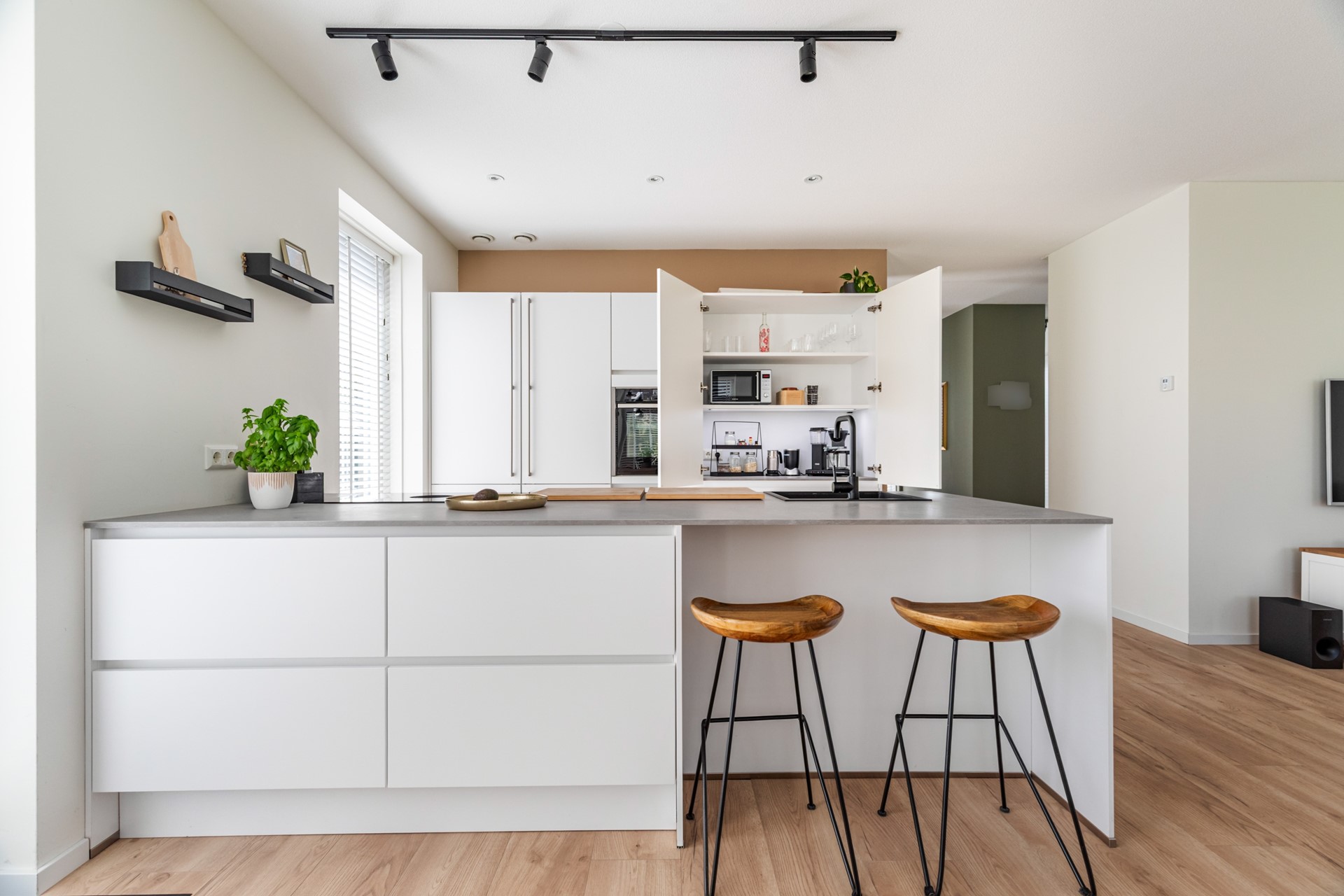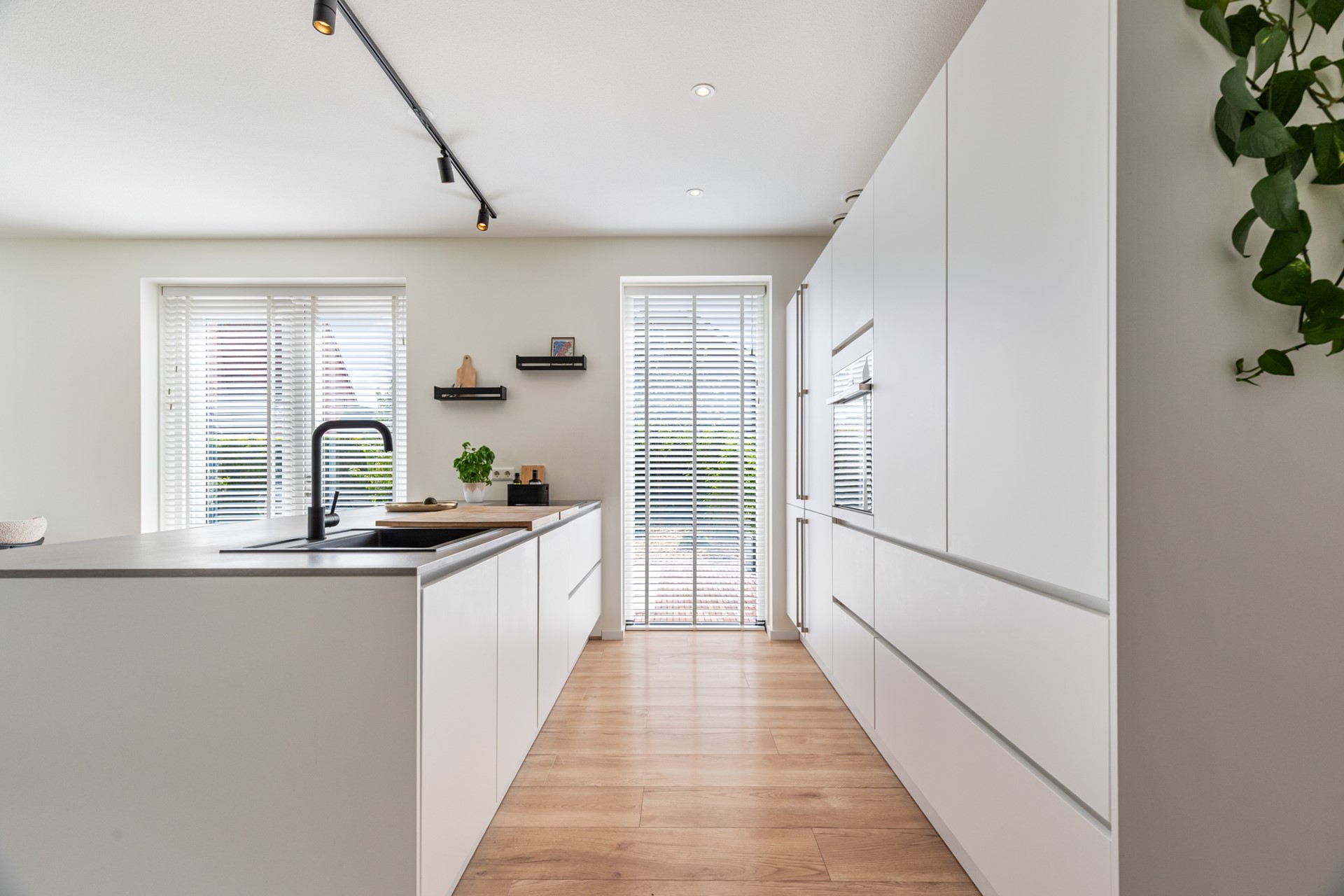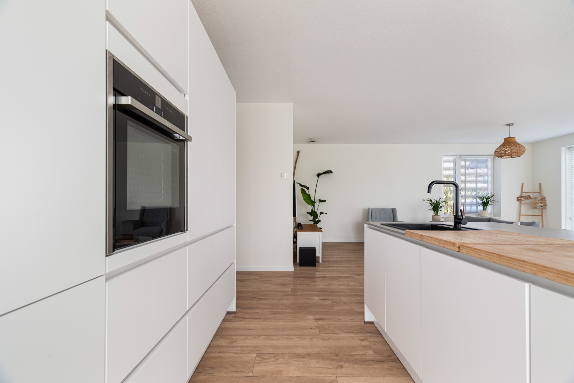 De keuken is echt een eyecatcher en vormt het hart van de woning. Het kookeiland is voorzien van een inductiekookplaat met geïntegreerde afzuiging, vaatwasser en veel werkruimte. De kastenwand beschikt over een koelkast en combioven, waardoor alles strak is weggewerkt en praktisch in gebruik is.