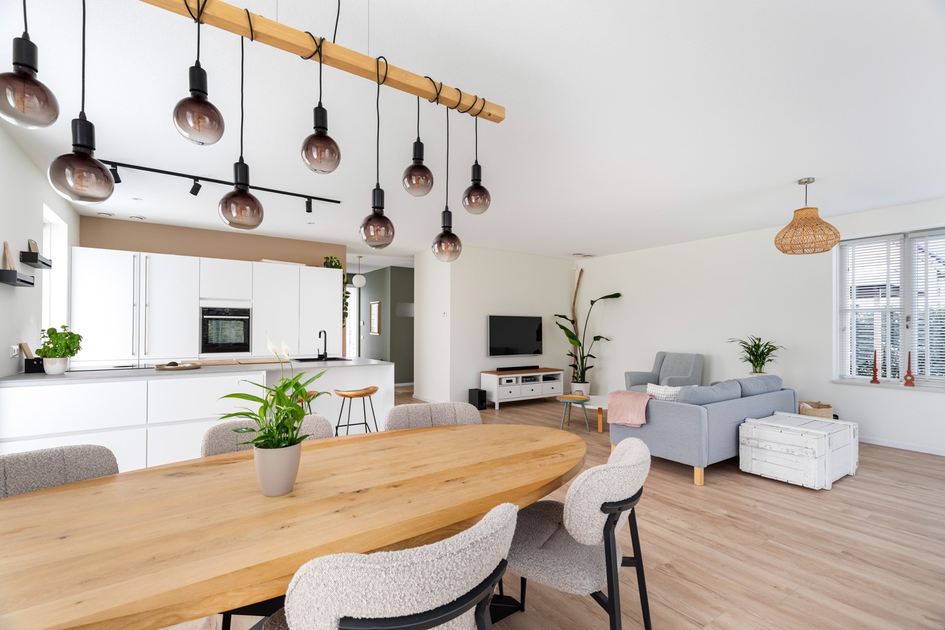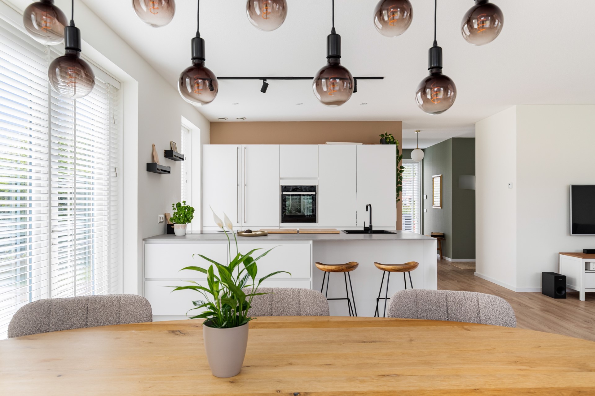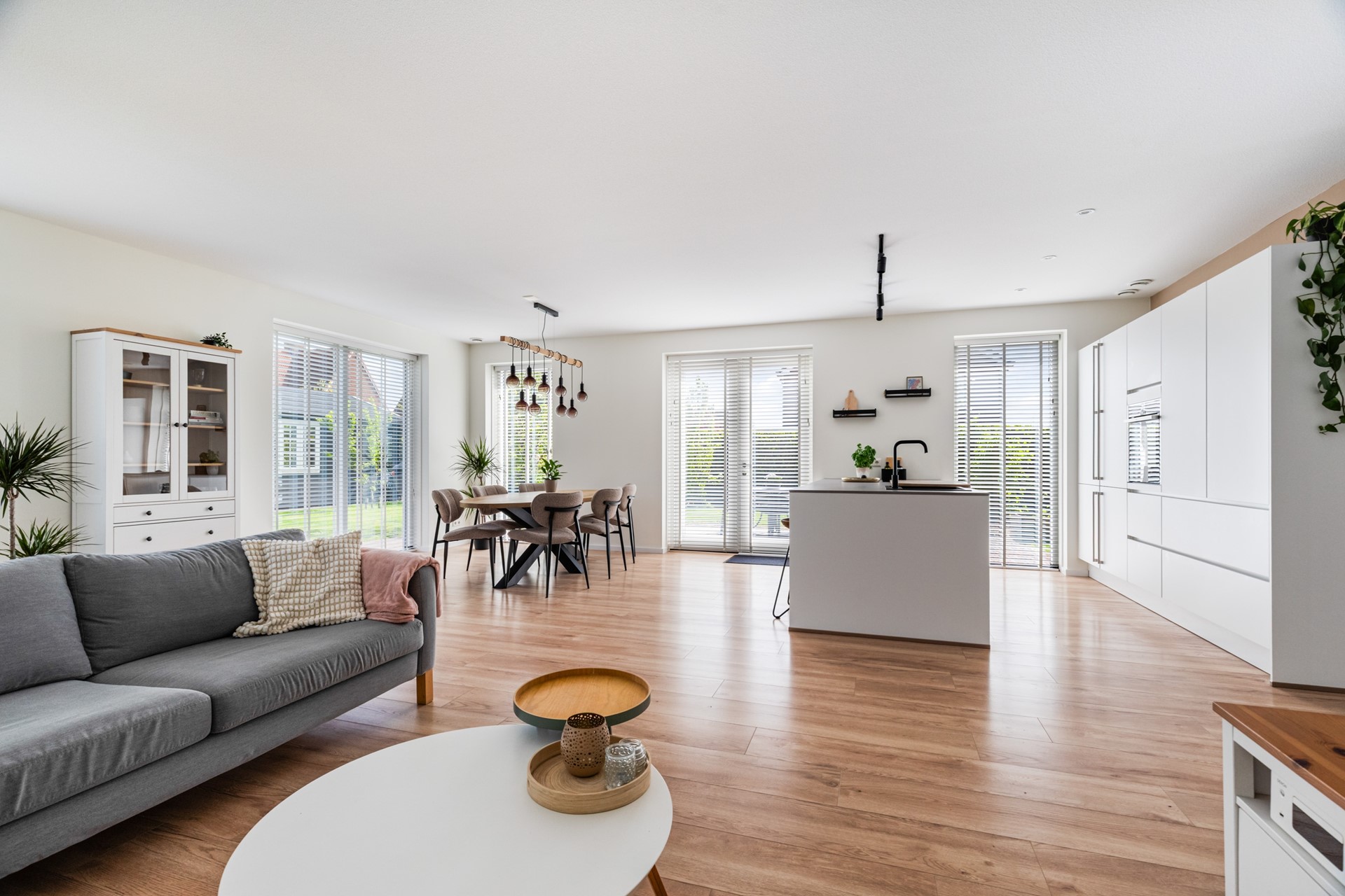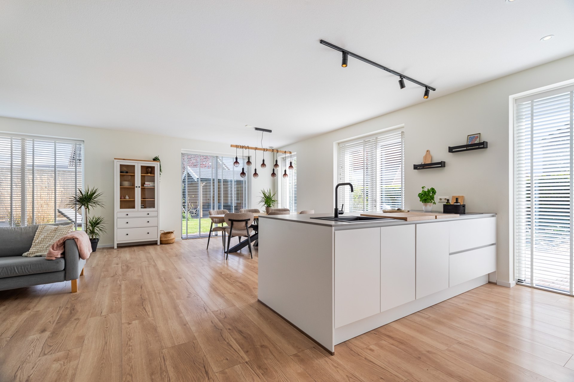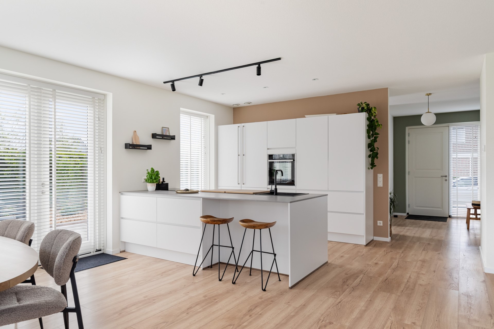 De keuken is echt een eyecatcher en vormt het hart van de woning. Het kookeiland is voorzien van een inductiekookplaat met geïntegreerde afzuiging, vaatwasser en veel werkruimte. De kastenwand beschikt over een koelkast en combioven, waardoor alles strak is weggewerkt en praktisch in gebruik is.