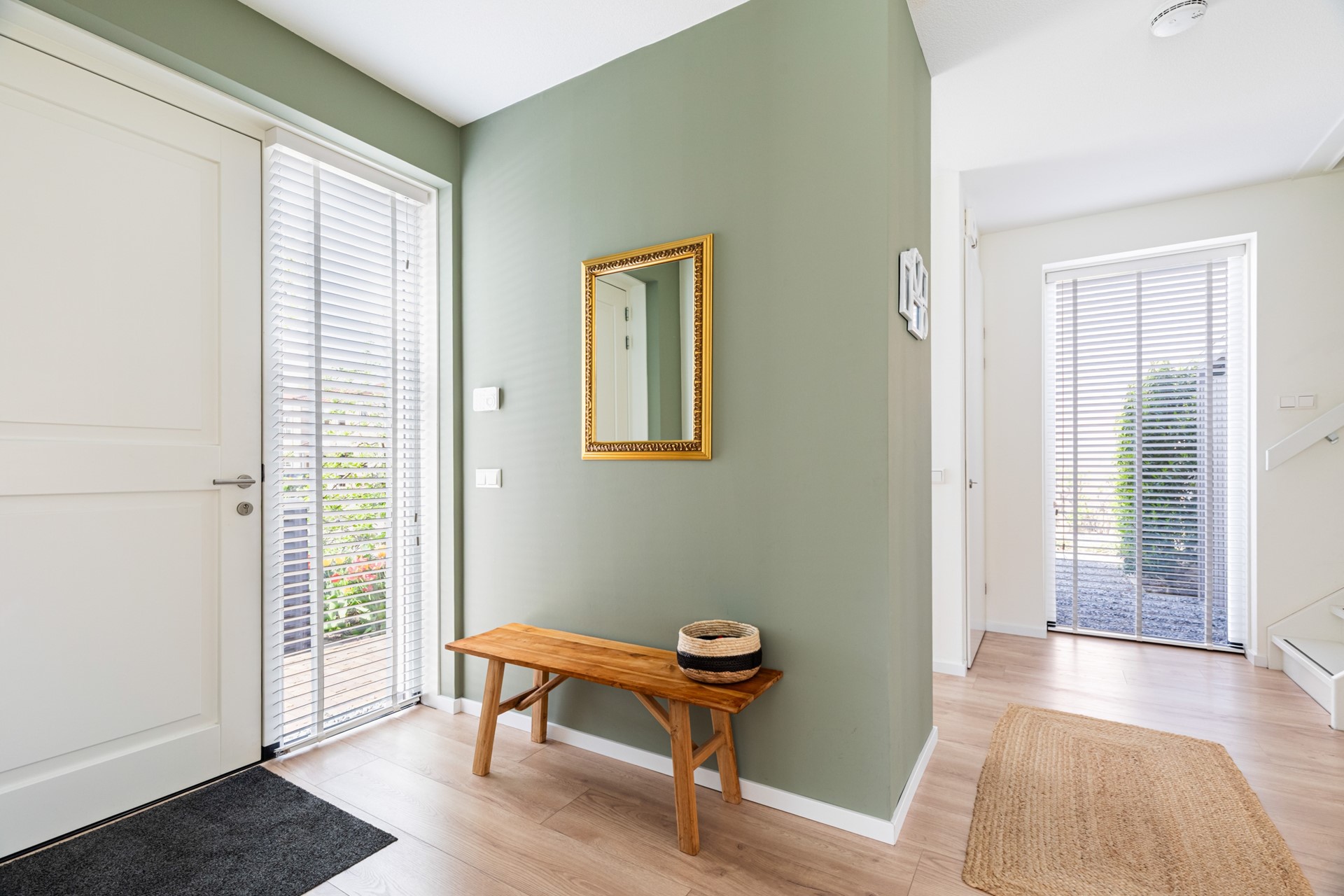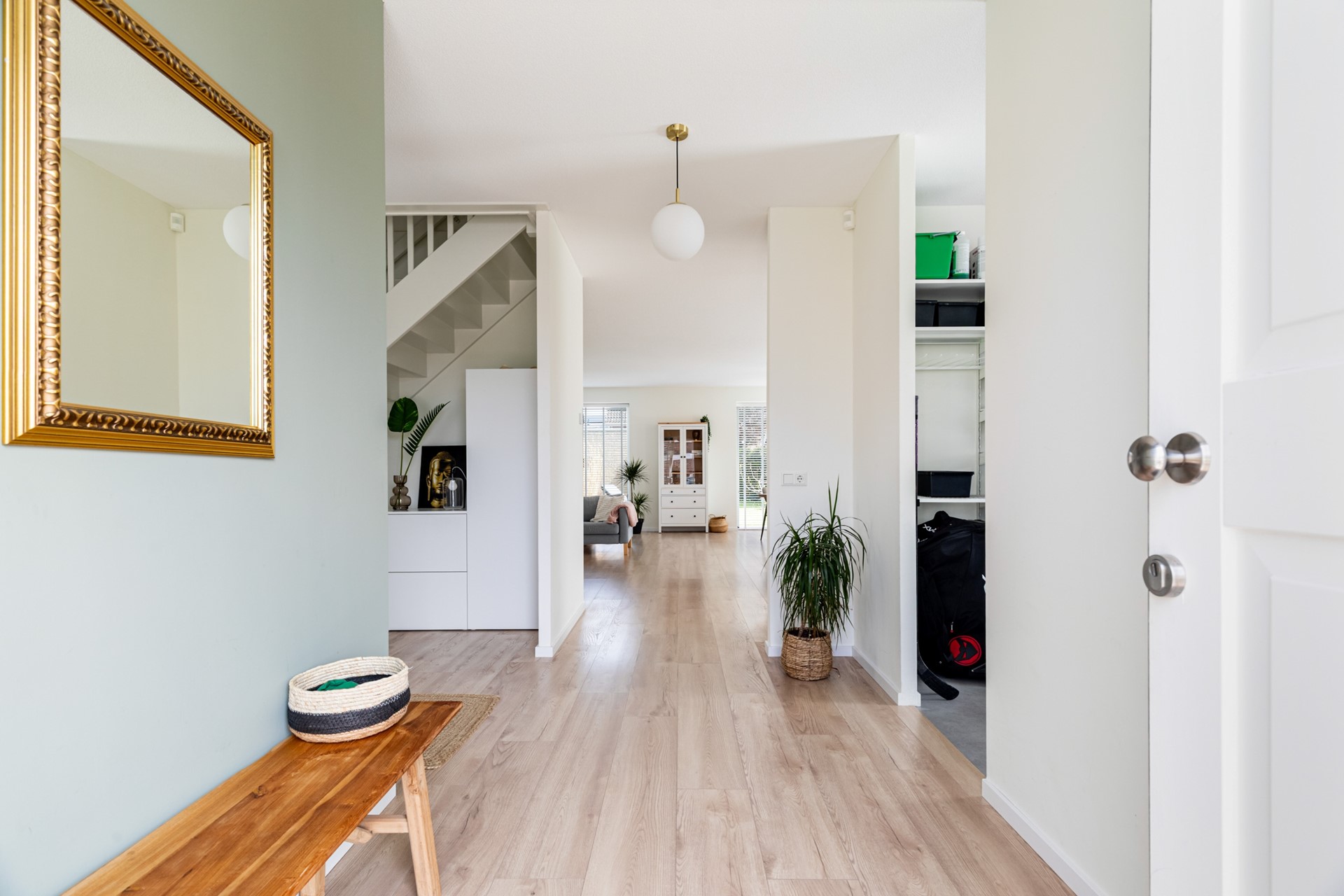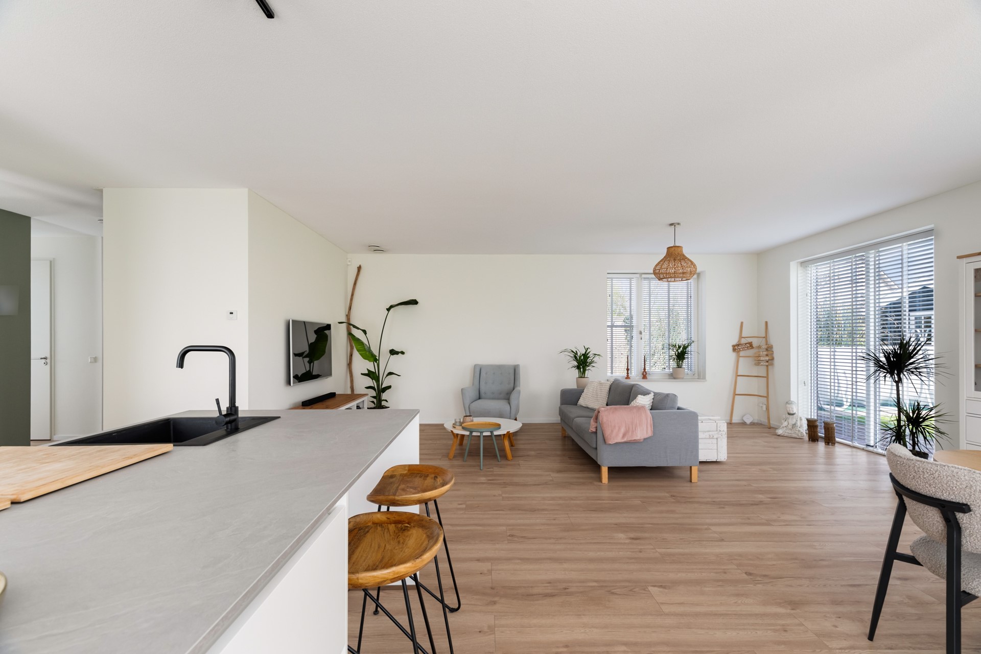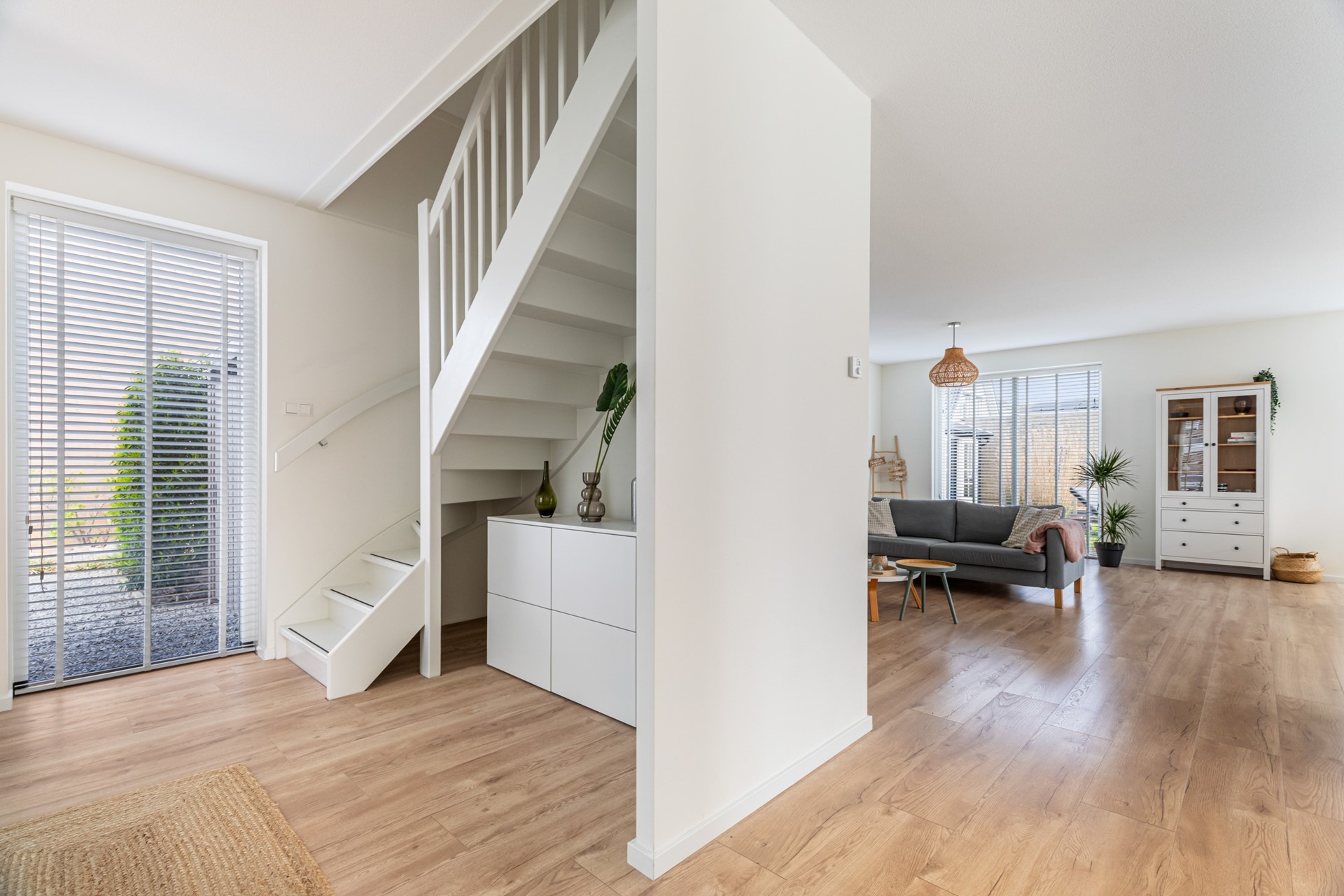 Binnenkomst in de hal met toilet, trapopgang en toegang tot de leefruimte. Wat direct opvalt is de strakke en hoogwaardige afwerking: een laminaat vloer in houtmotief in combinatie met gestuukte wanden en plafonds zorgt voor een moderne en rustige uitstraling. De woonkamer is ruim en licht en staat in directe verbinding met de tuin, wat zorgt voor een prettig binnen-buiten gevoel.